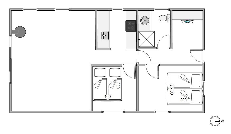 The holiday home accommodates 4 people. The well-maintained bathroom features a shower and underfloor heating. The cosy living area has an open-plan layout, sharing space with a well-equipped kitchen and comfortable dining area. The view from the living room through large patio windows into the tree-lined surroundings is beautiful - almost like a fairy tale forest.