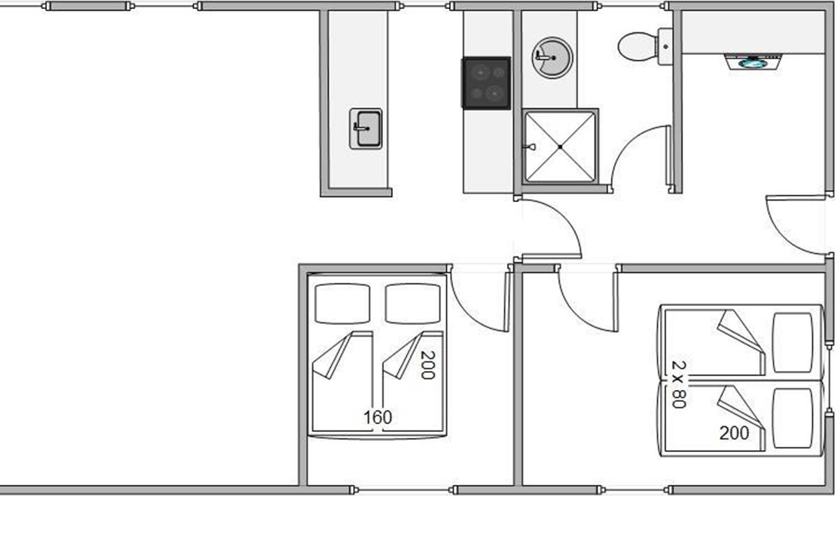 The holiday home features two single beds and one double bed. The living area offers plenty of seating including a large sofa. The kitchen includes a dishwasher, and there's a washing machine in the entrance area. The entire holiday home has laminate flooring, except for the bathroom and entrance area.