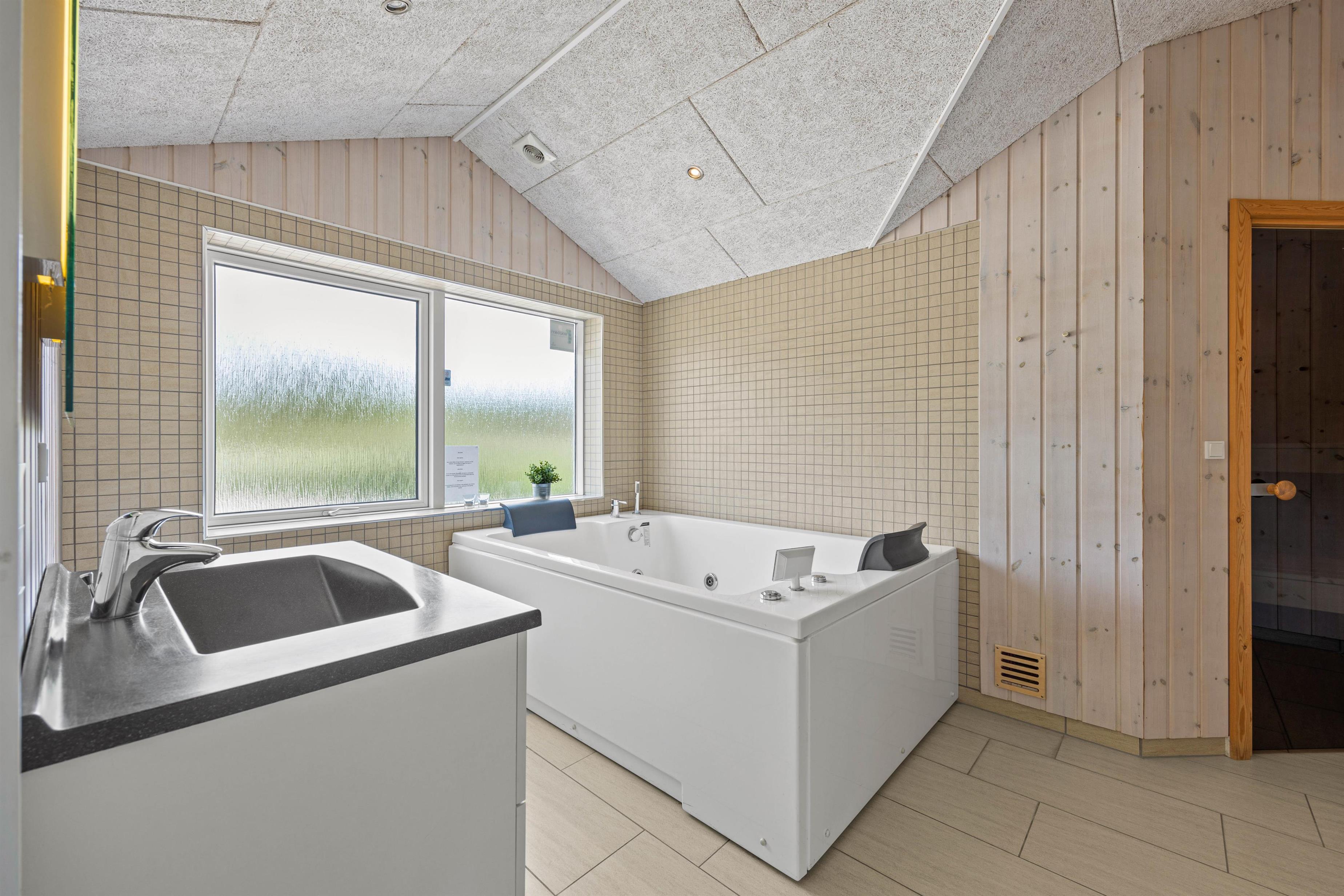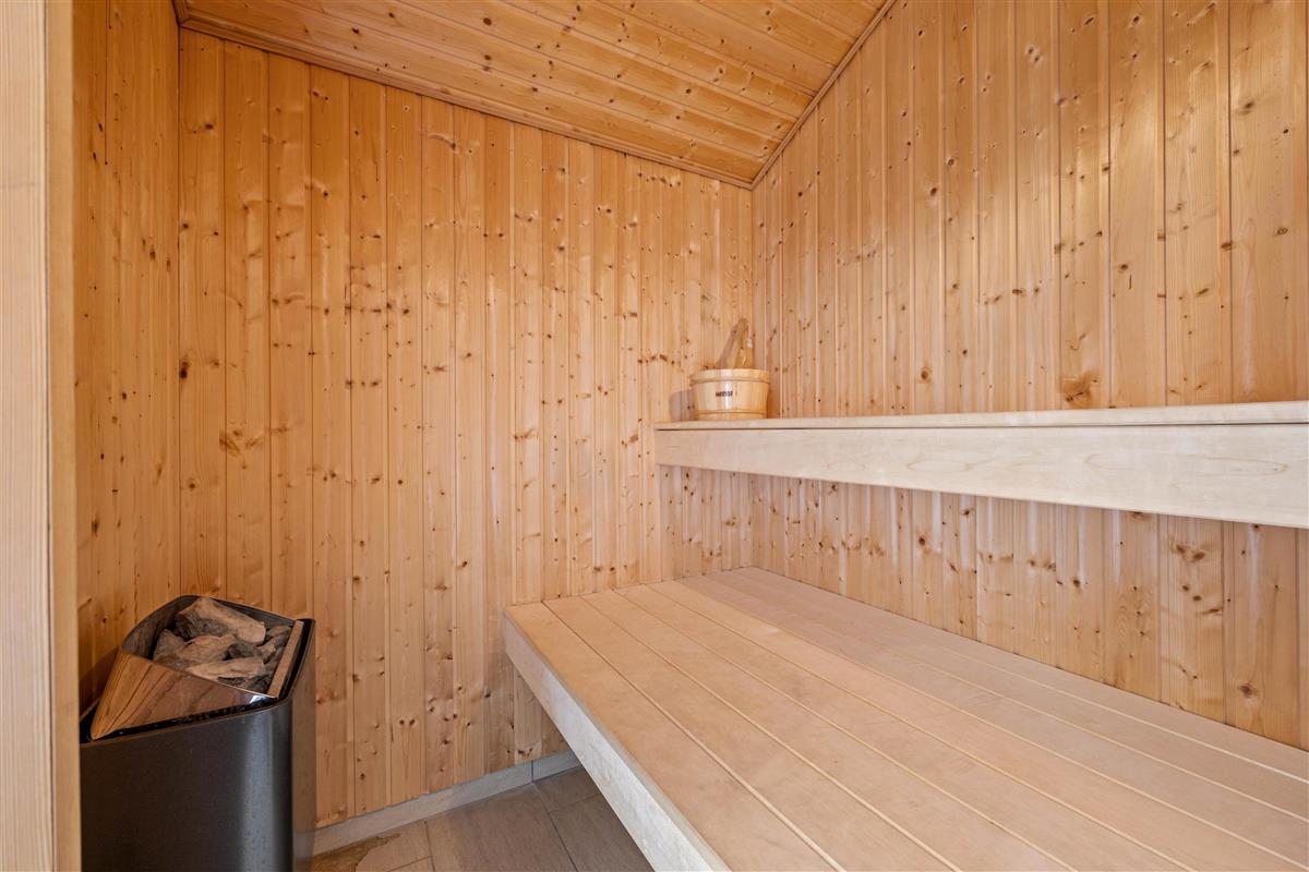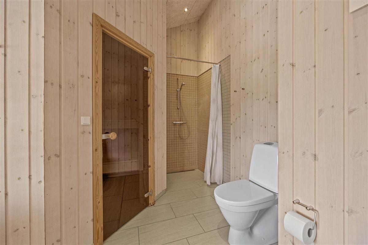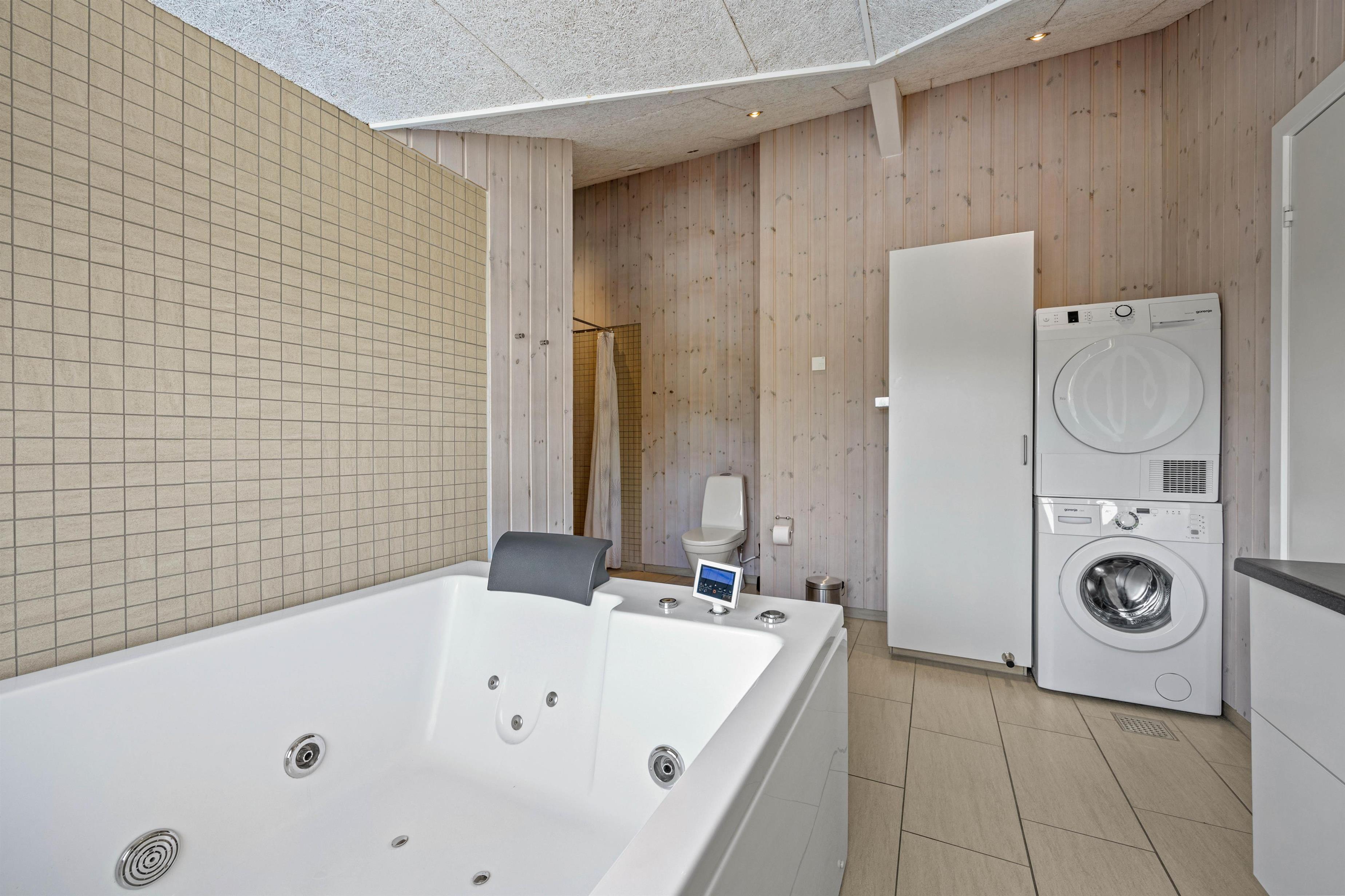 There's a large bathroom and a guest toilet. Both bathrooms are in excellent condition, with one featuring a two-person whirlpool and a beautiful sauna. You can also use the two shower cubicles. One bathroom houses the washing machine and tumble dryer, and the entire holiday home benefits from underfloor heating.