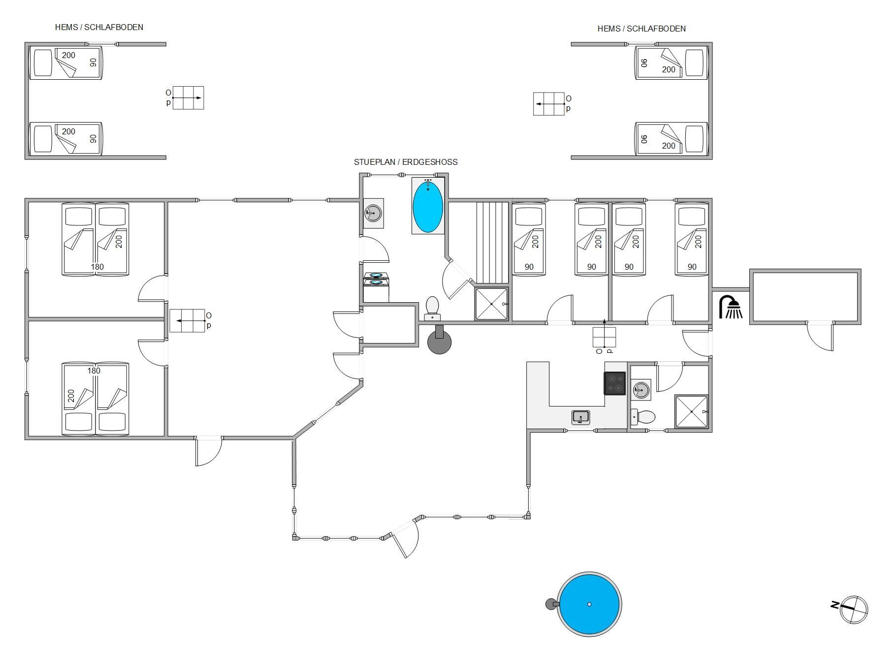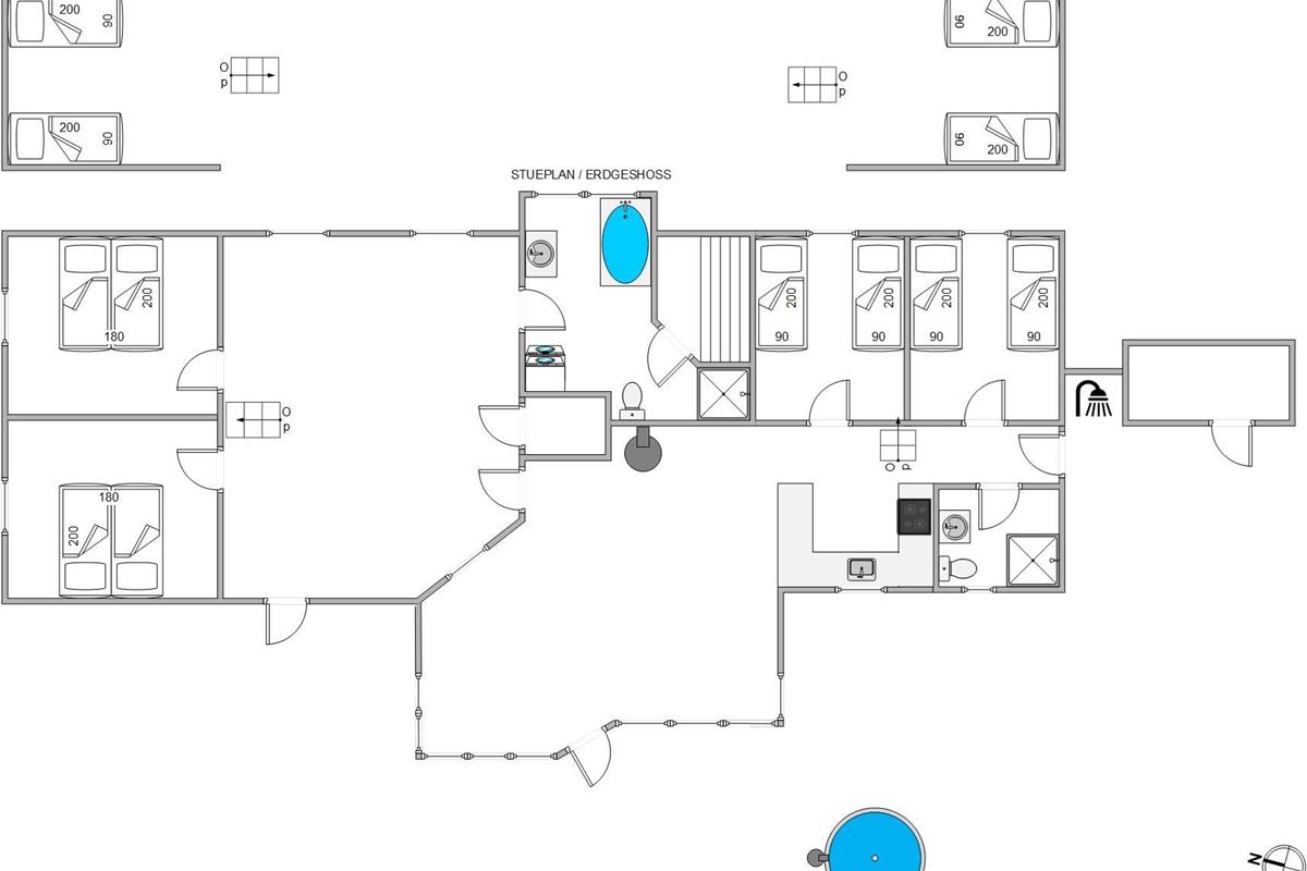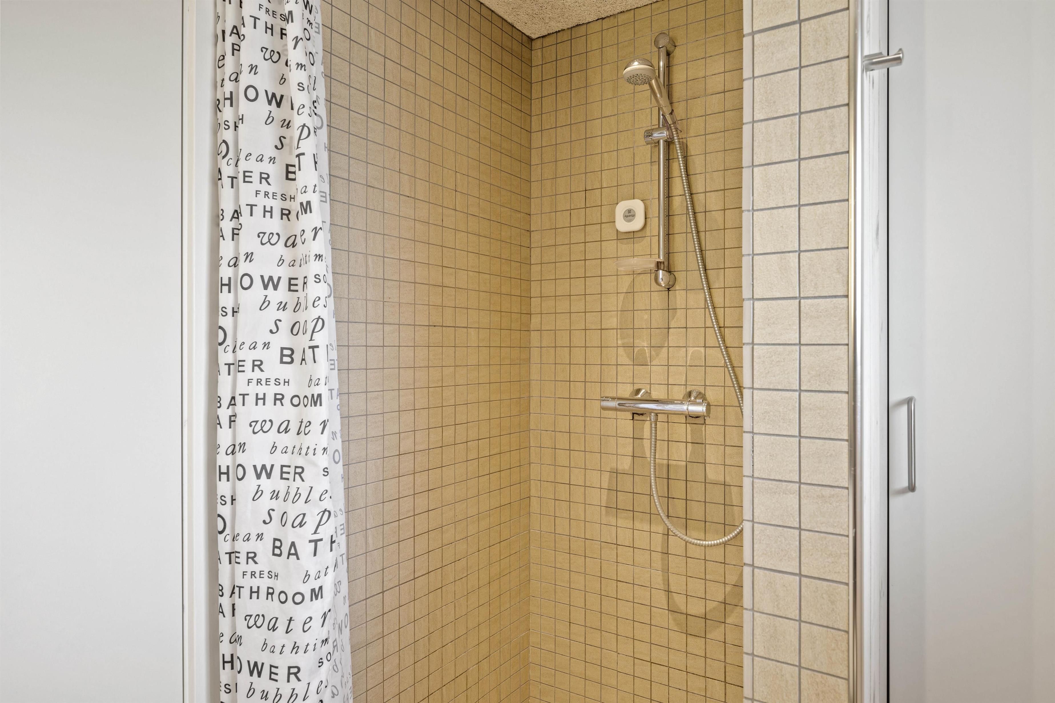 There's a large bathroom and a guest toilet. Both bathrooms are in excellent condition, with one featuring a two-person whirlpool and a beautiful sauna. You can also use the two shower cubicles. One bathroom houses the washing machine and tumble dryer, and the entire holiday home benefits from underfloor heating.
