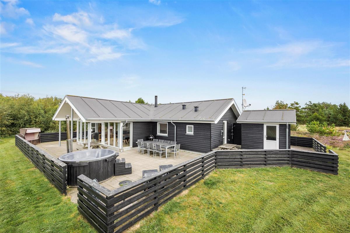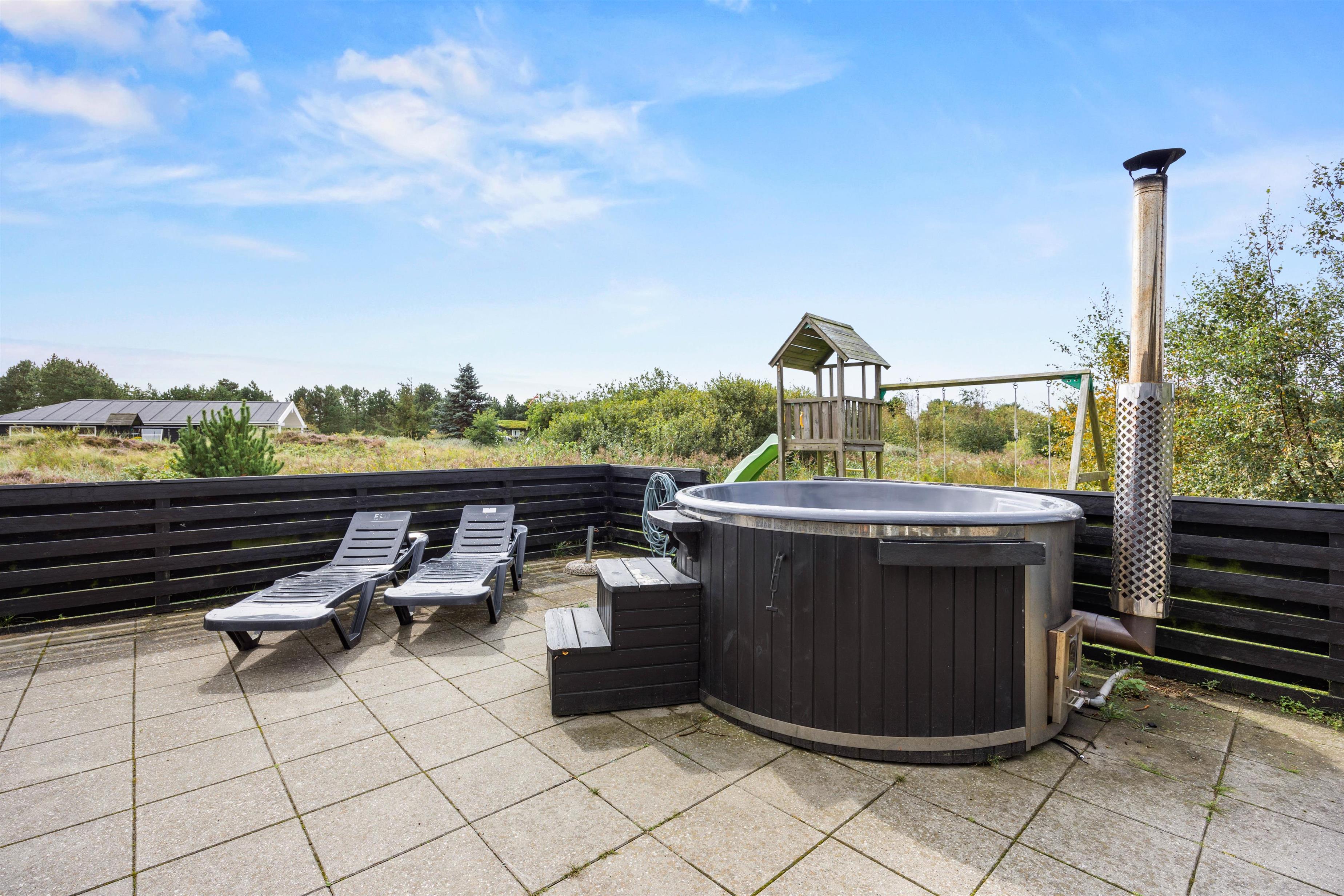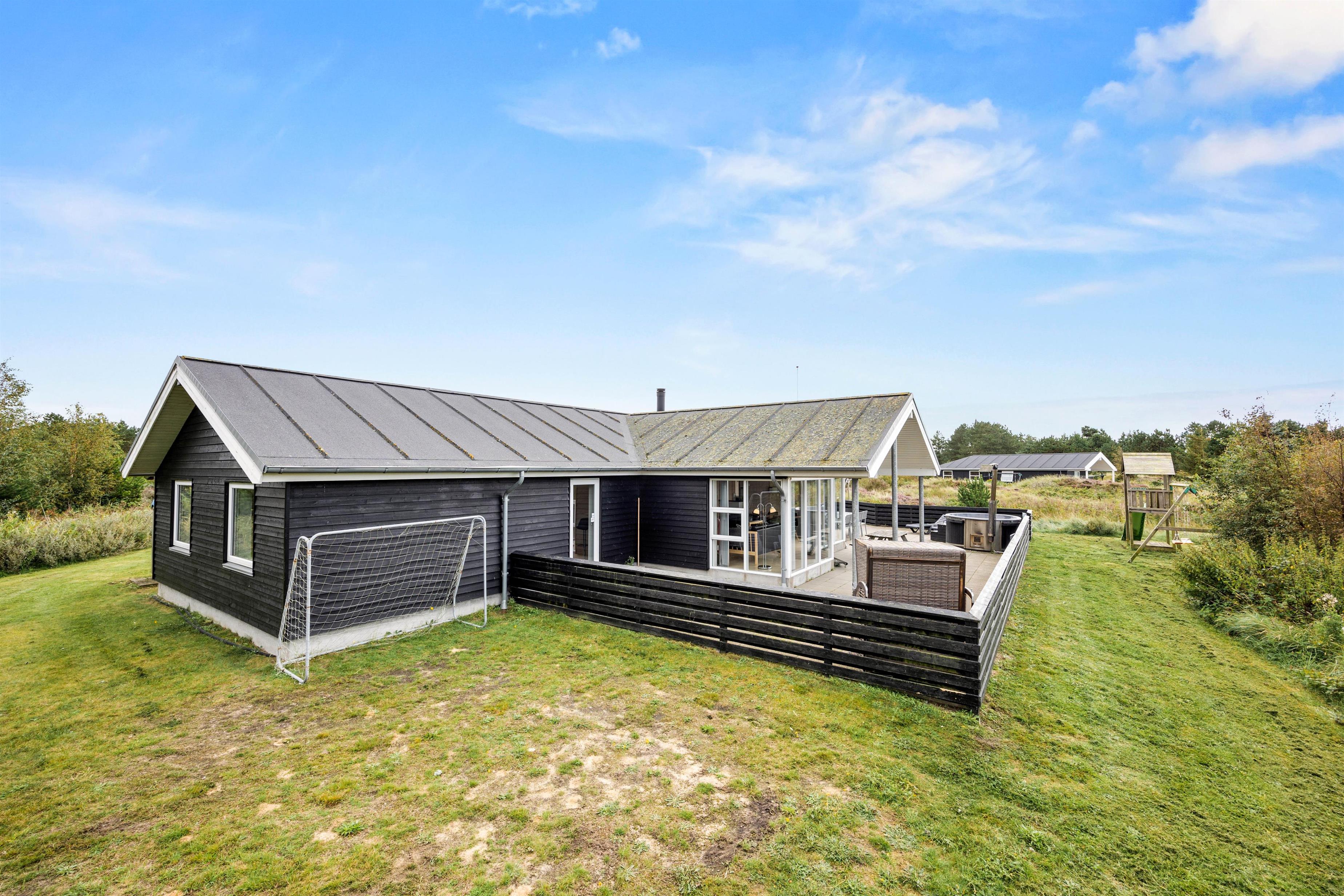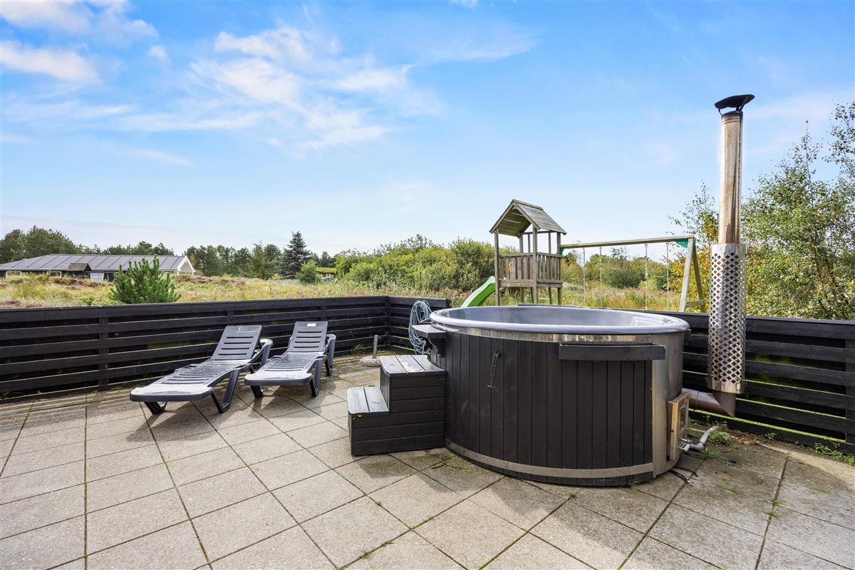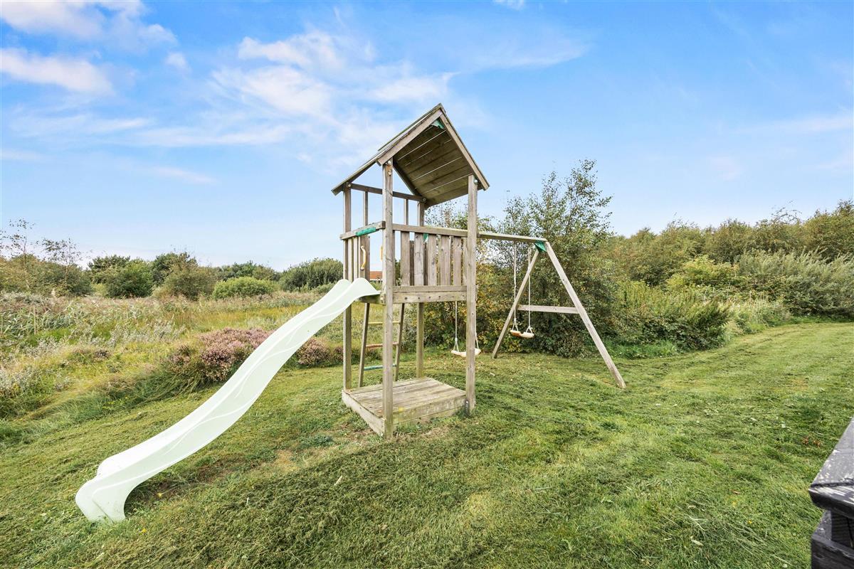 The spacious outdoor area features a hot tub on the terrace, along with plenty of seating, sun loungers and a traditional beach chair. The terrace is partially fenced, ideal for families with small children. You'll always find a sunny - or shady - spot while enjoying the peaceful views over Bolilmark's heathland. There are also swings, a slide and a football goal. The large driveway provides ample parking. An outdoor shower is available for use from April to November.