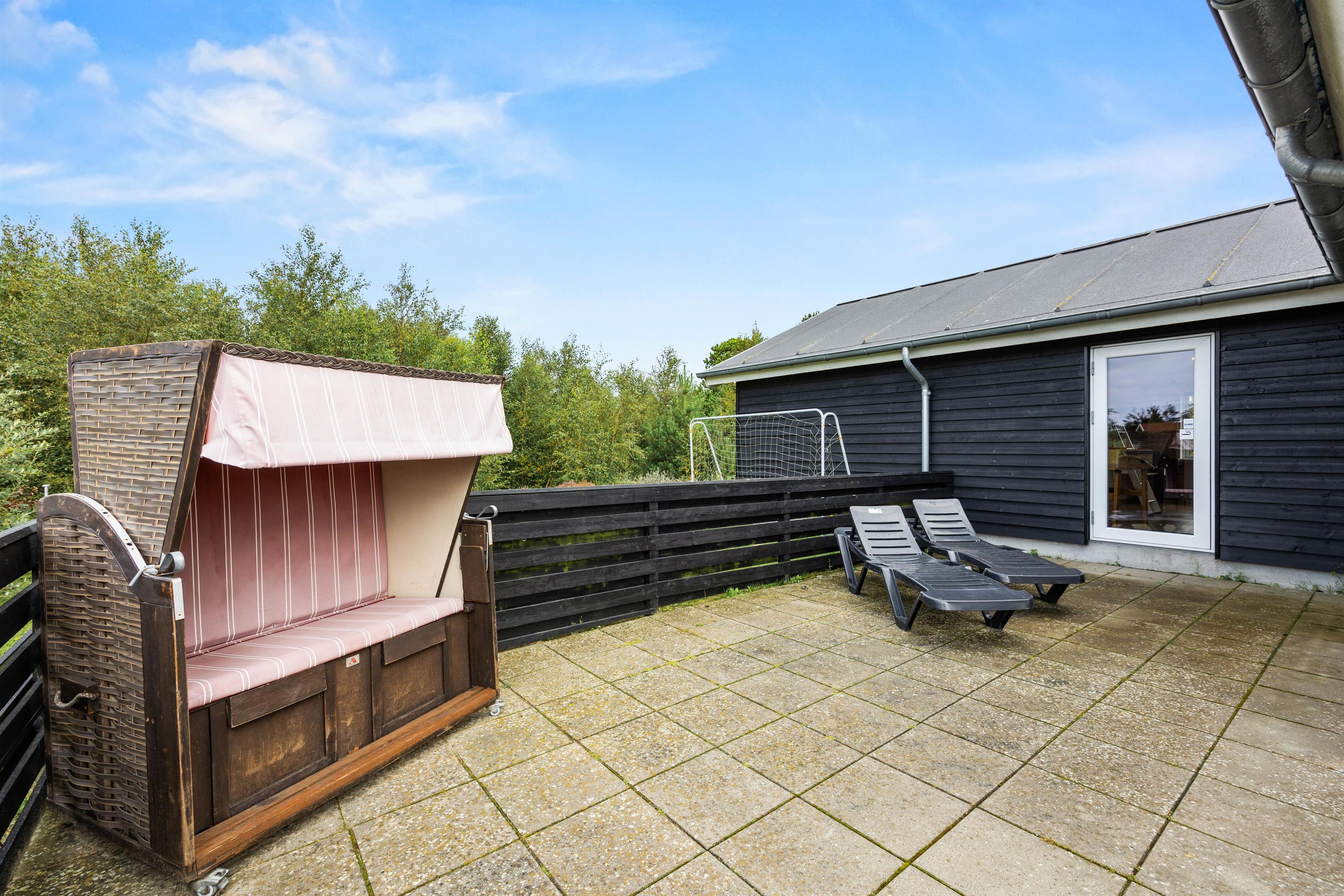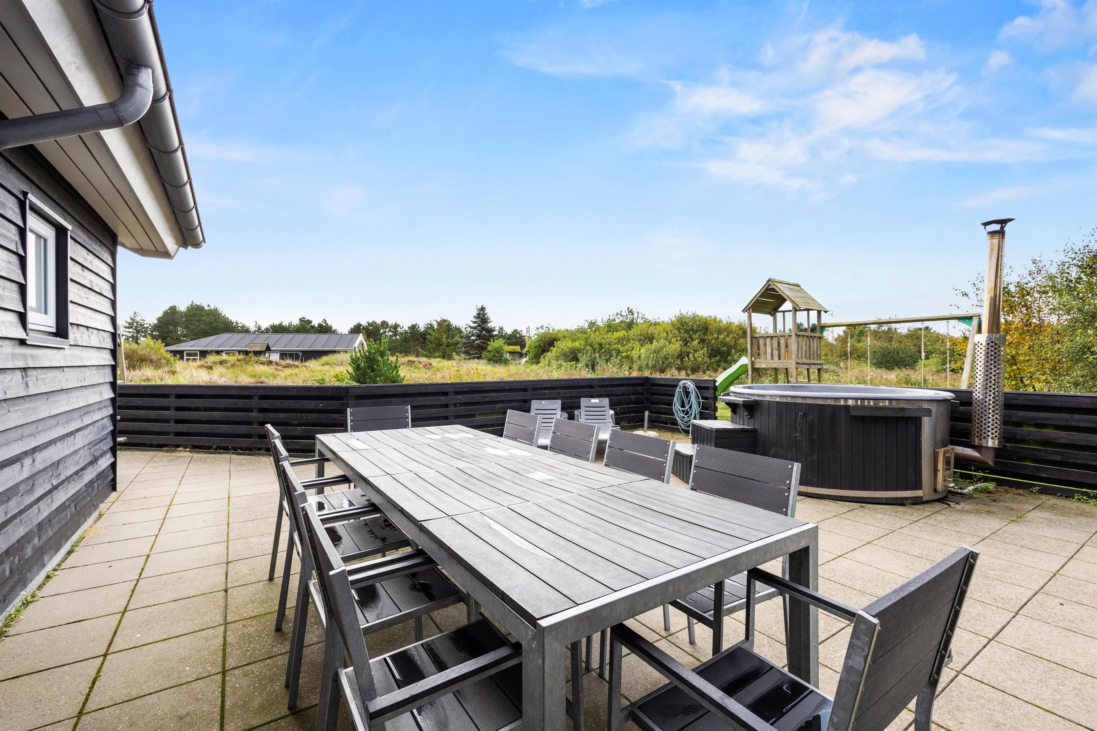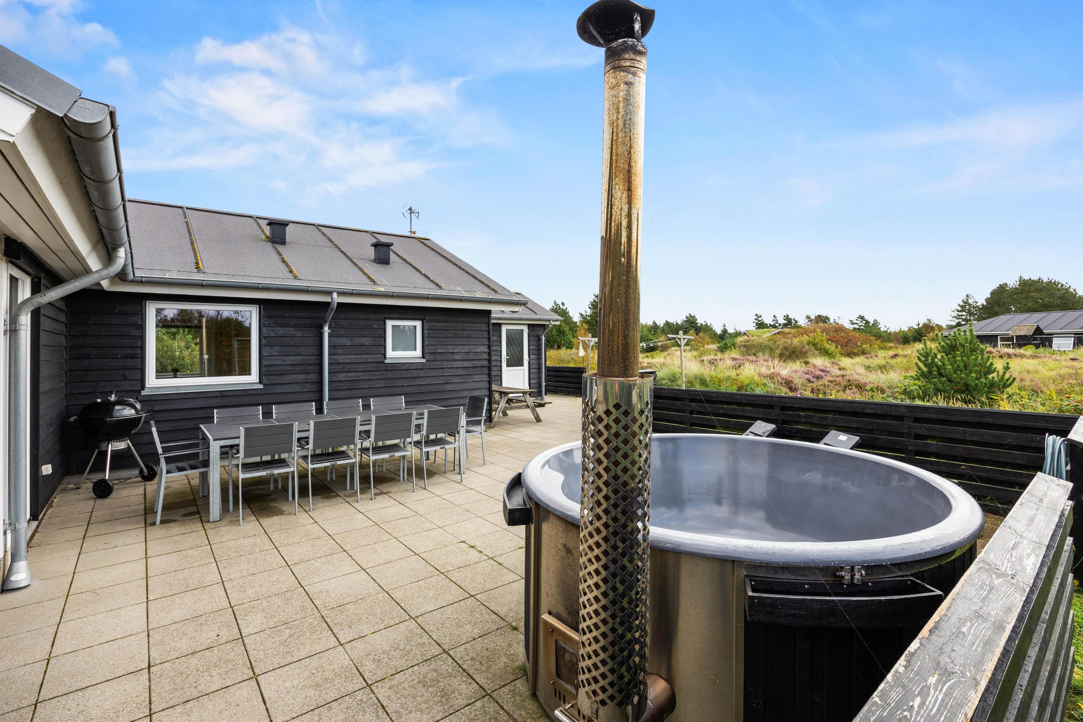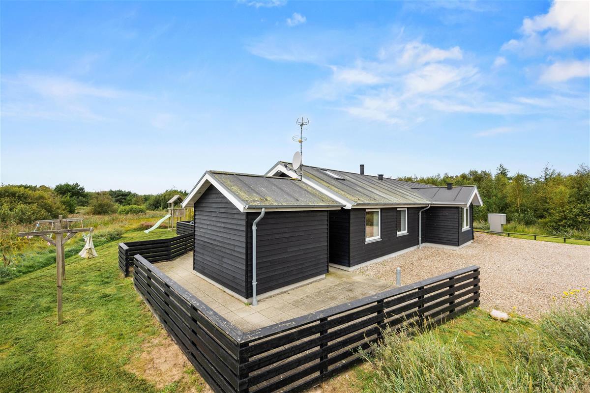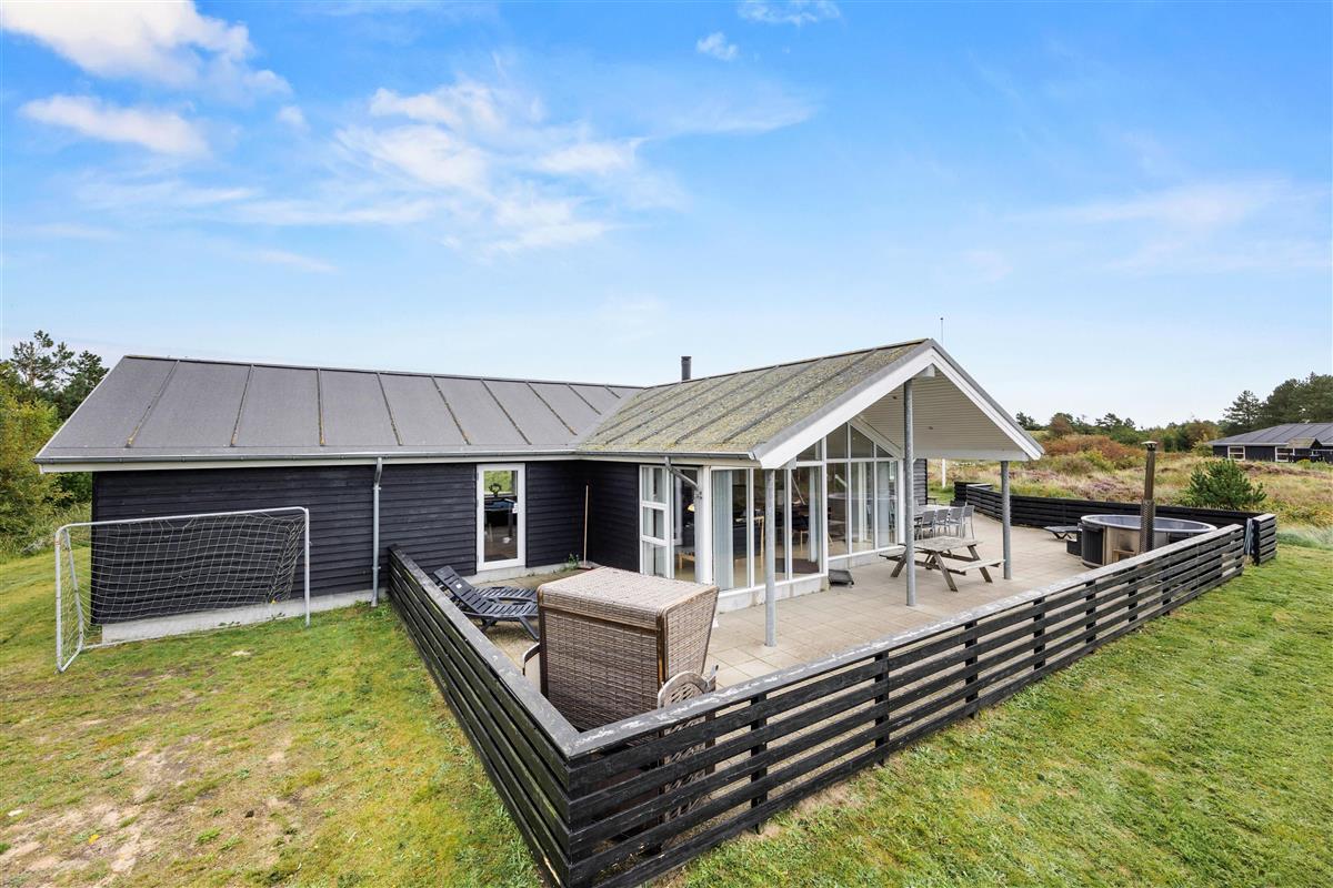 The spacious outdoor area features a hot tub on the terrace, along with plenty of seating, sun loungers and a traditional beach chair. The terrace is partially fenced, ideal for families with small children. You'll always find a sunny - or shady - spot while enjoying the peaceful views over Bolilmark's heathland. There are also swings, a slide and a football goal. The large driveway provides ample parking. An outdoor shower is available for use from April to November.