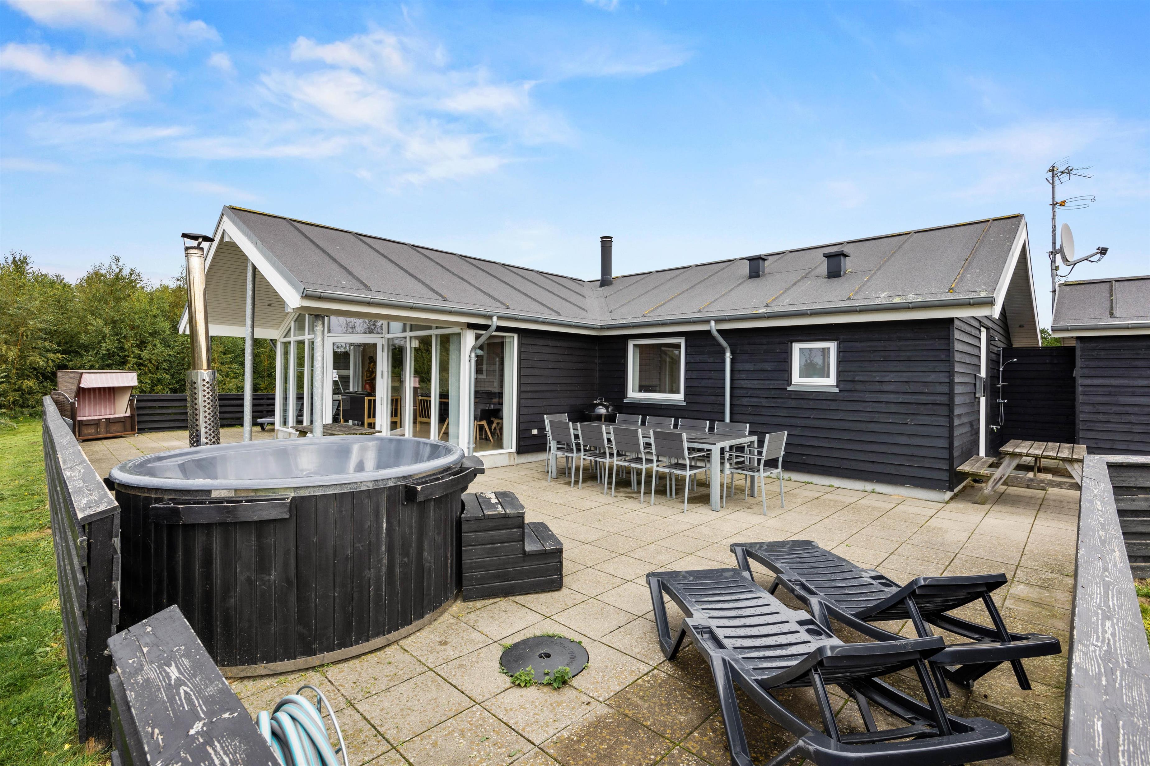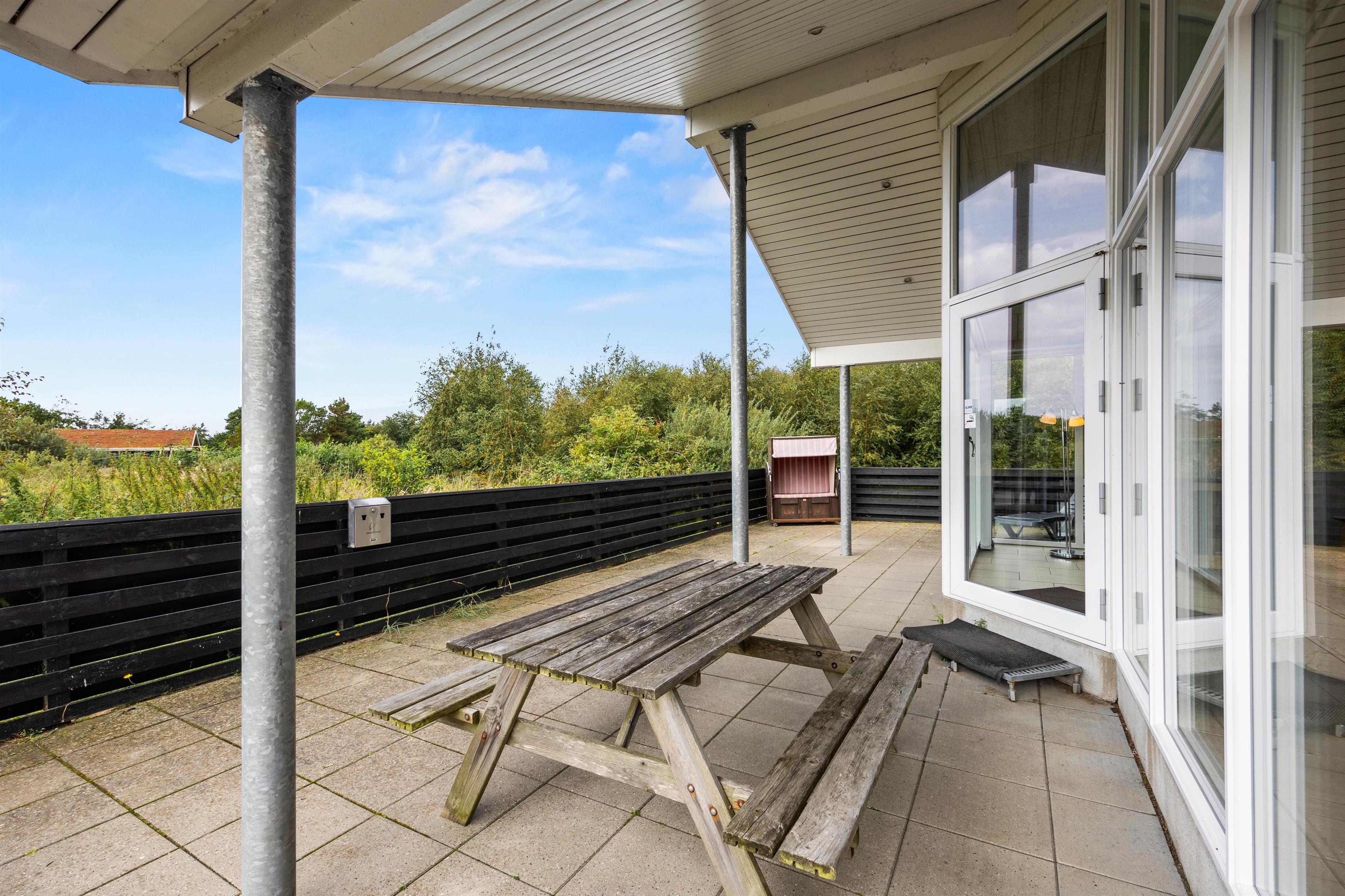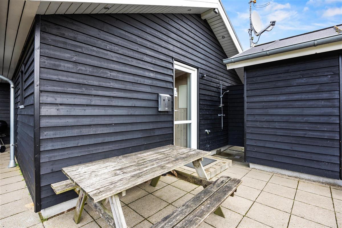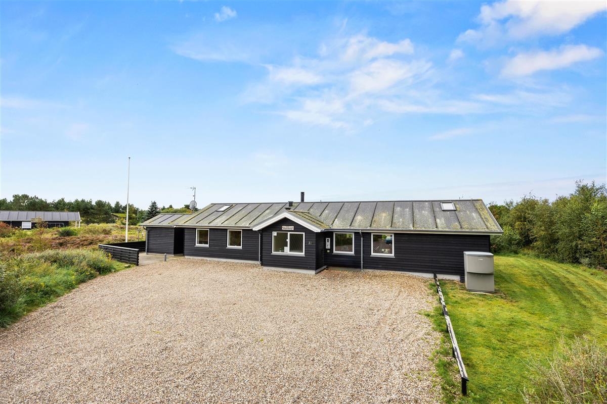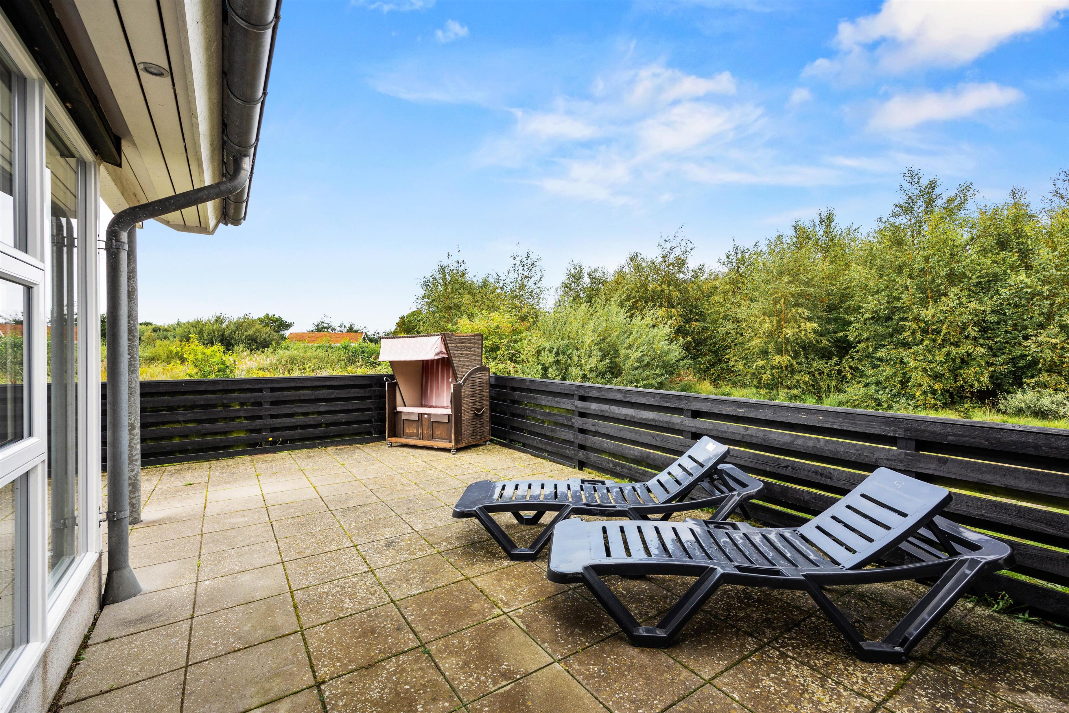 The spacious outdoor area features a hot tub on the terrace, along with plenty of seating, sun loungers and a traditional beach chair. The terrace is partially fenced, ideal for families with small children. You'll always find a sunny - or shady - spot while enjoying the peaceful views over Bolilmark's heathland. There are also swings, a slide and a football goal. The large driveway provides ample parking. An outdoor shower is available for use from April to November.