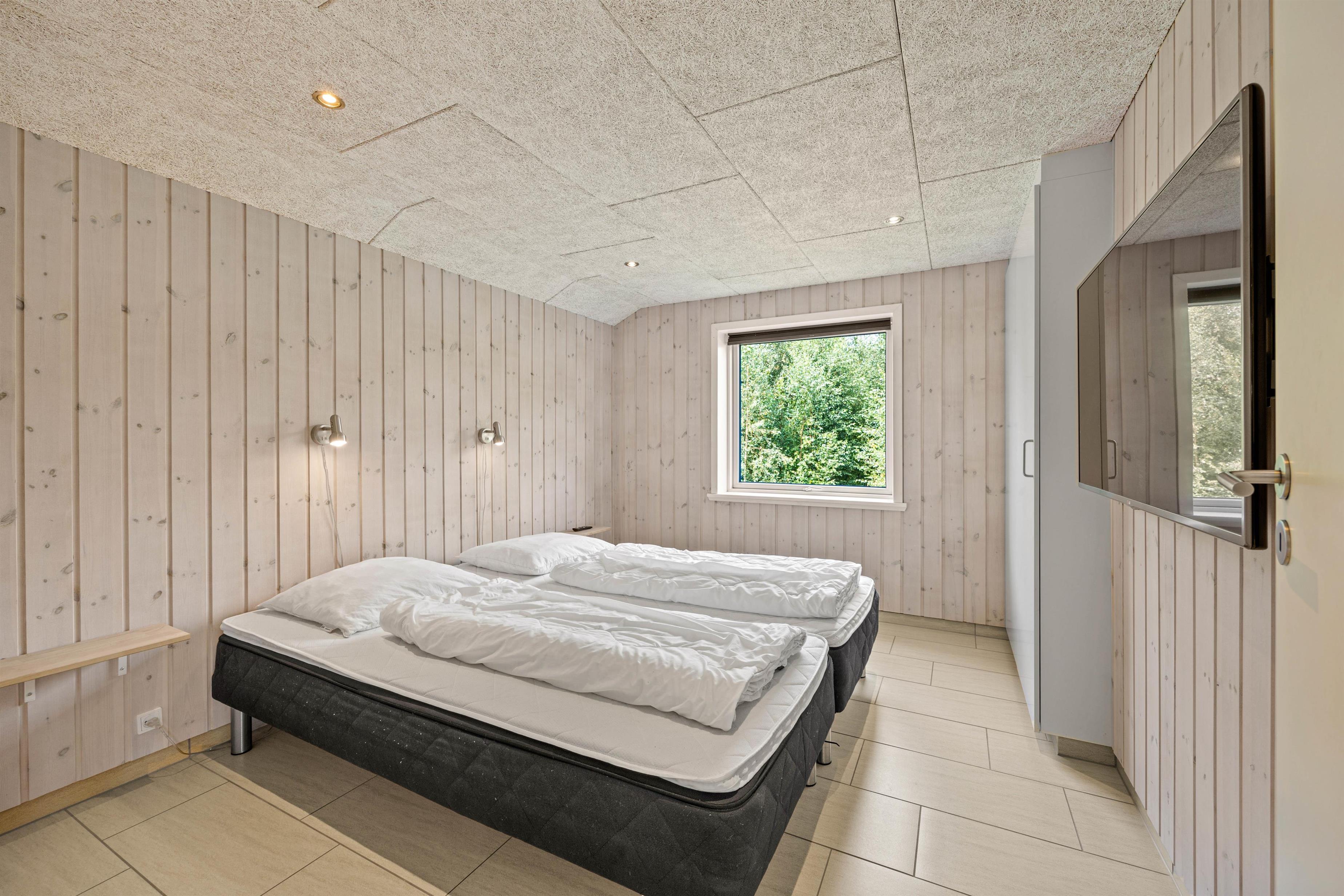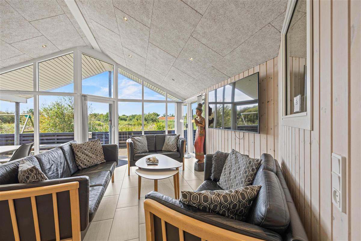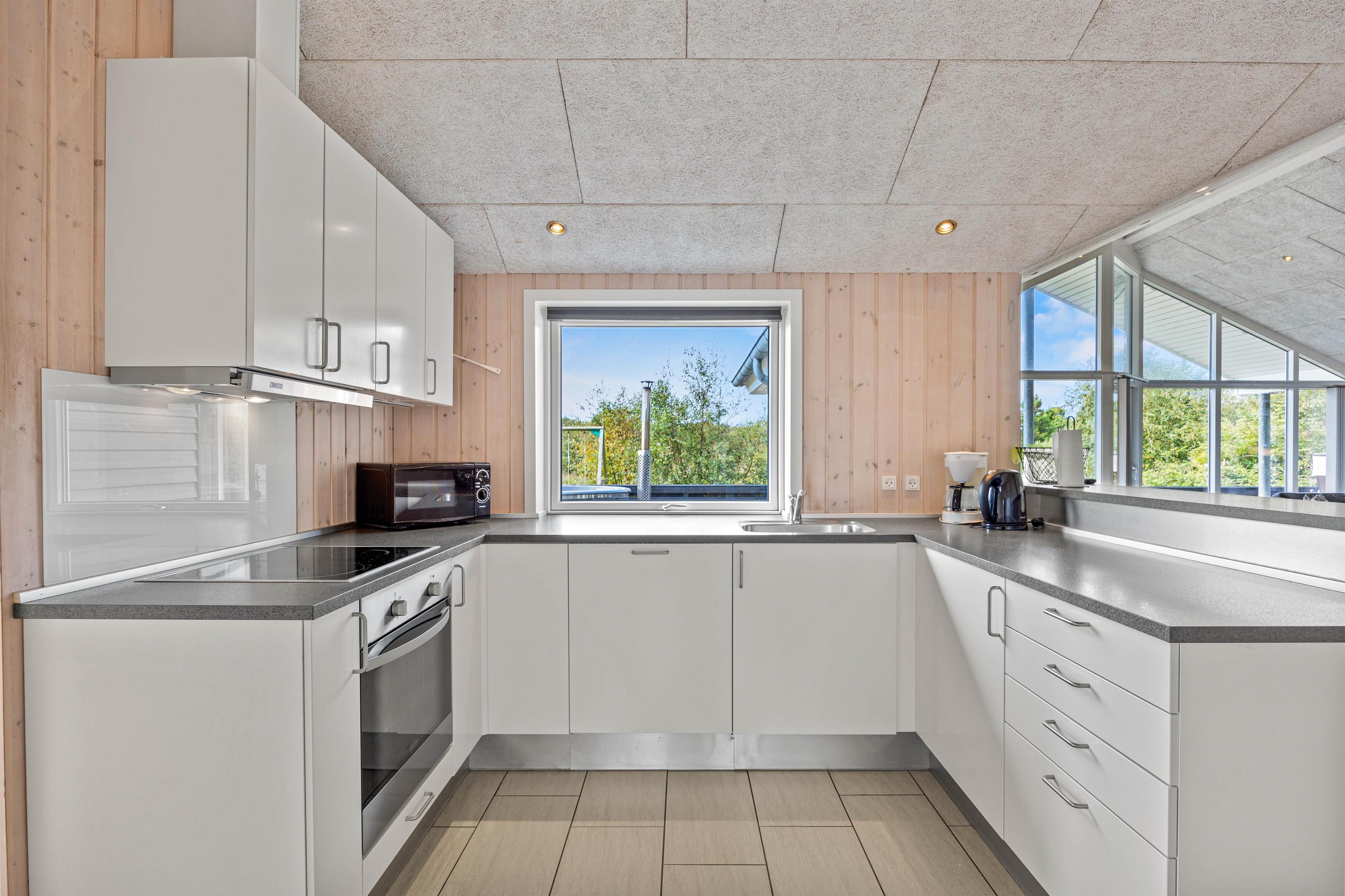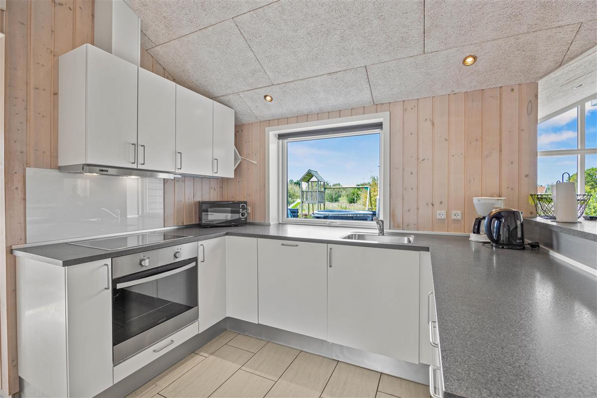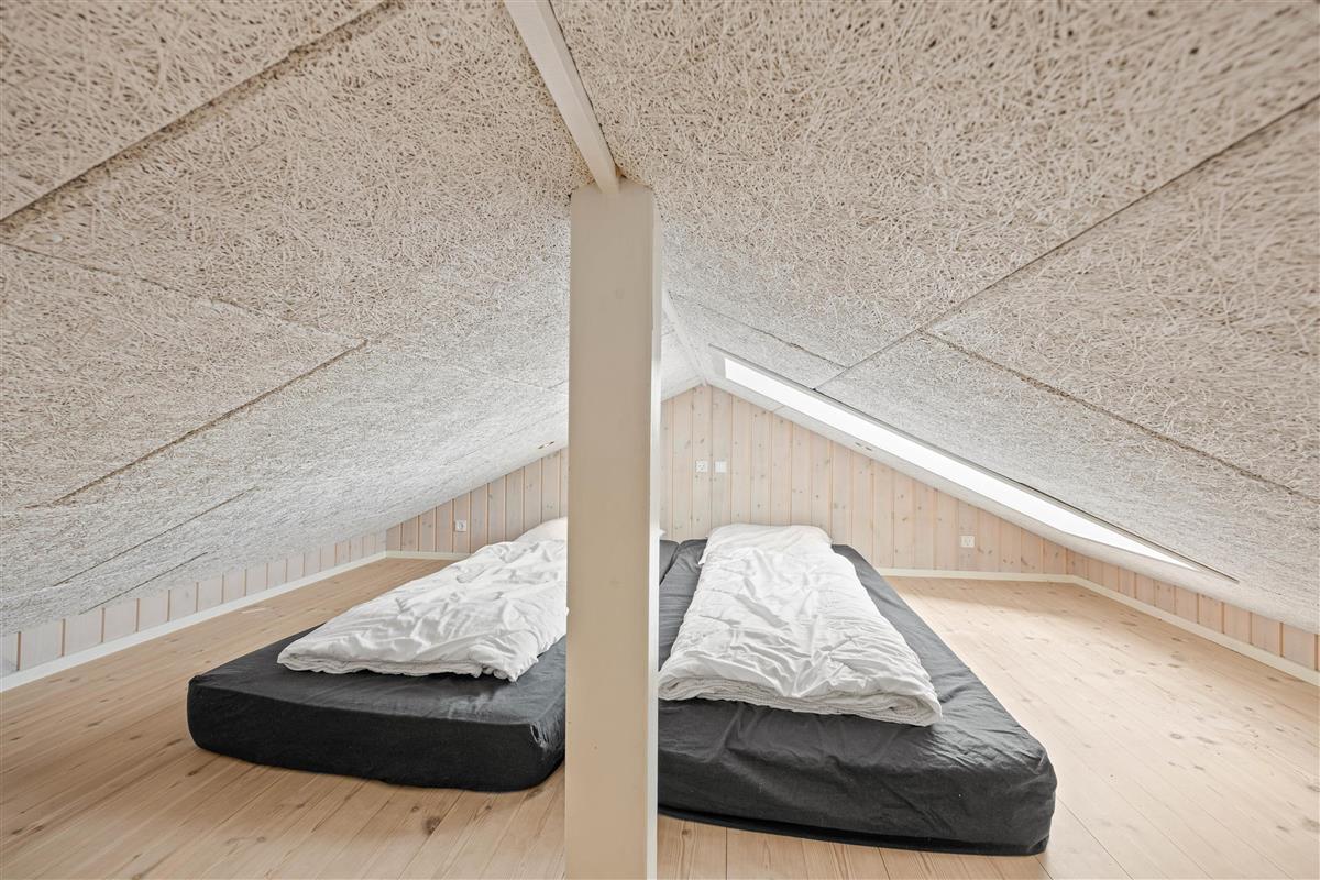 The spacious outdoor area features a hot tub on the terrace, along with plenty of seating, sun loungers and a traditional beach chair. The terrace is partially fenced, ideal for families with small children. You'll always find a sunny - or shady - spot while enjoying the peaceful views over Bolilmark's heathland. There are also swings, a slide and a football goal. The large driveway provides ample parking. An outdoor shower is available for use from April to November.