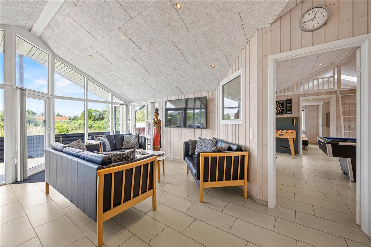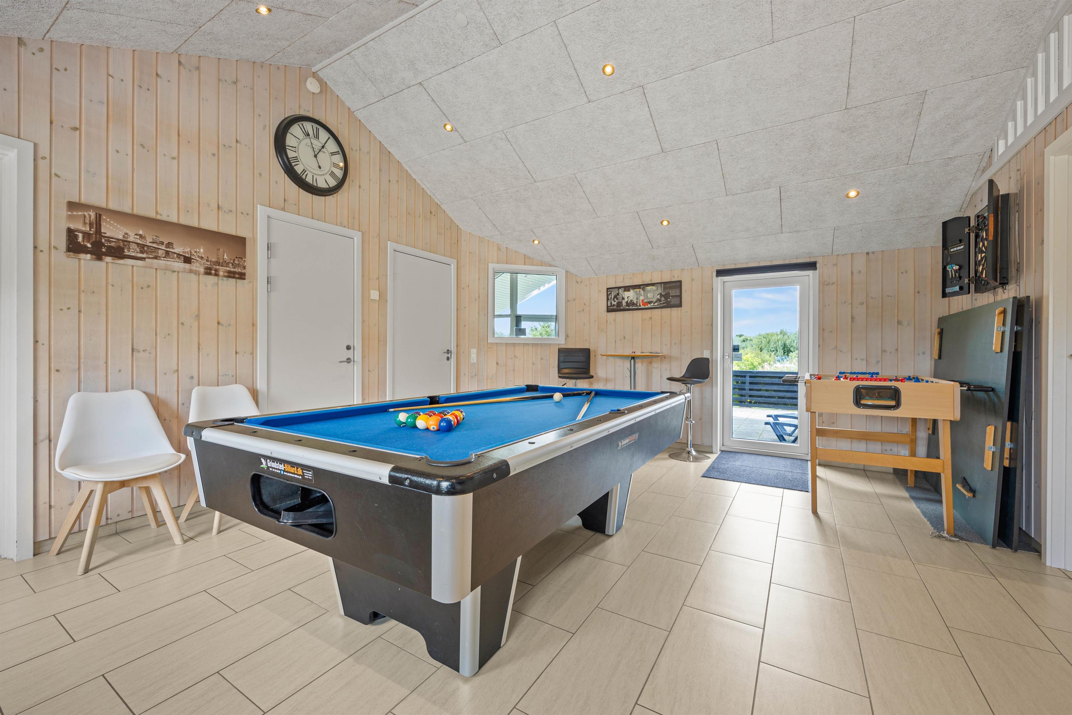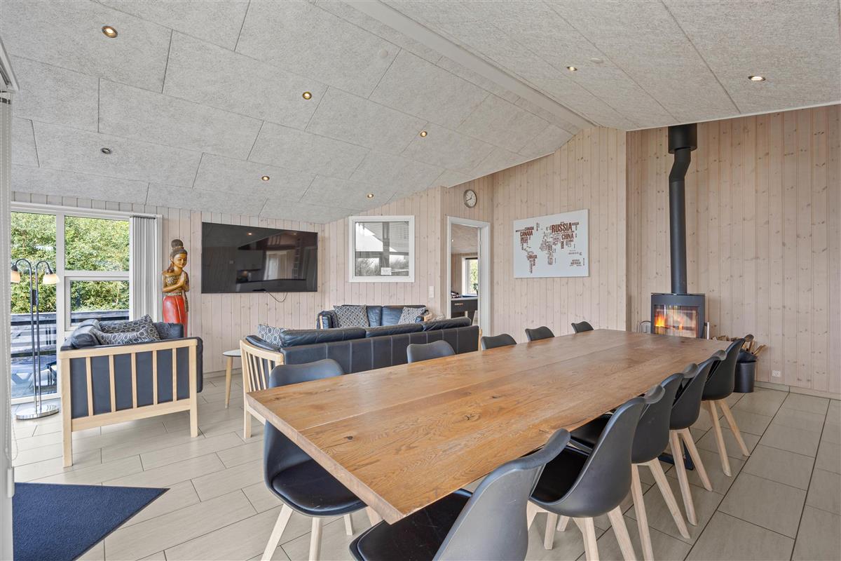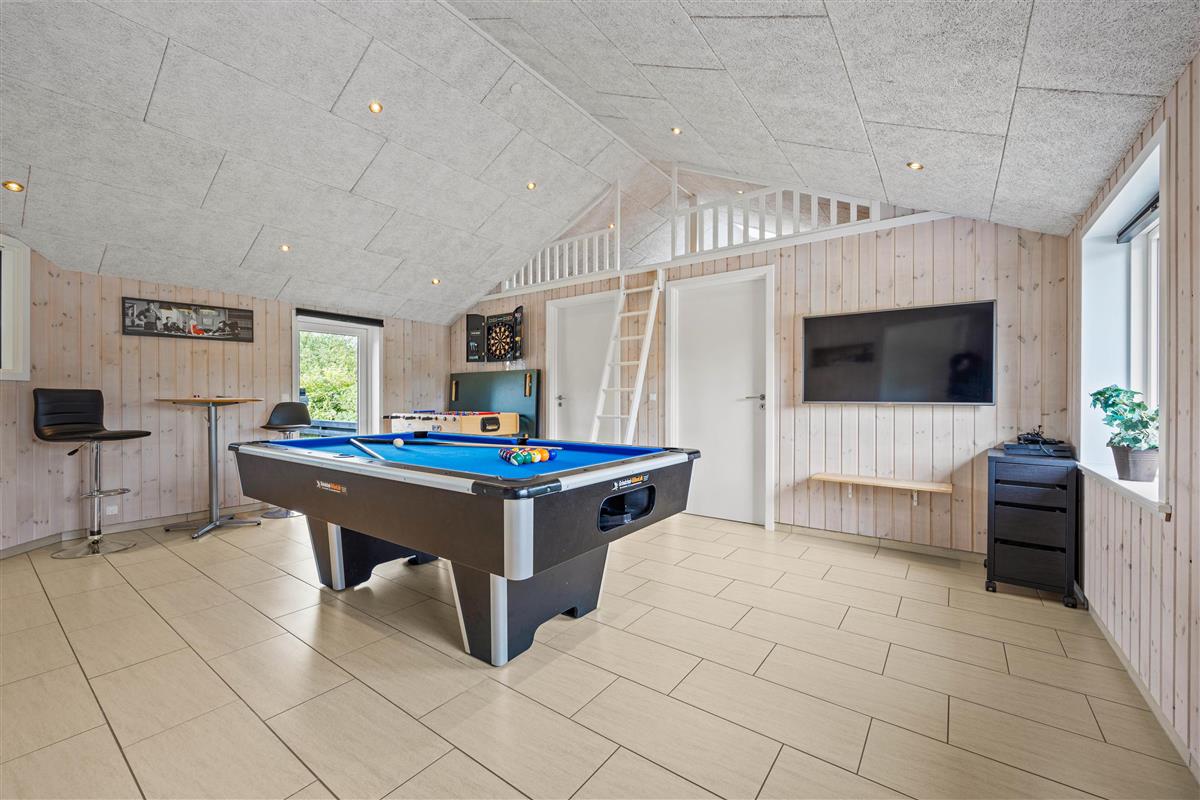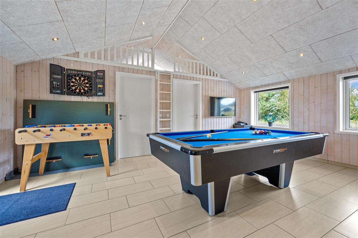 The generous living area invites relaxation and features a wood-burning stove for cosy evenings. Here you'll also find the large dining table with room for the whole family. Entertainment comes in the form of a games room with pool table, table football, darts, and even table tennis.