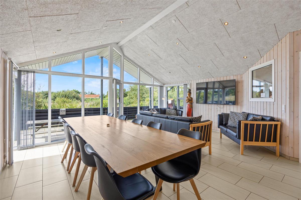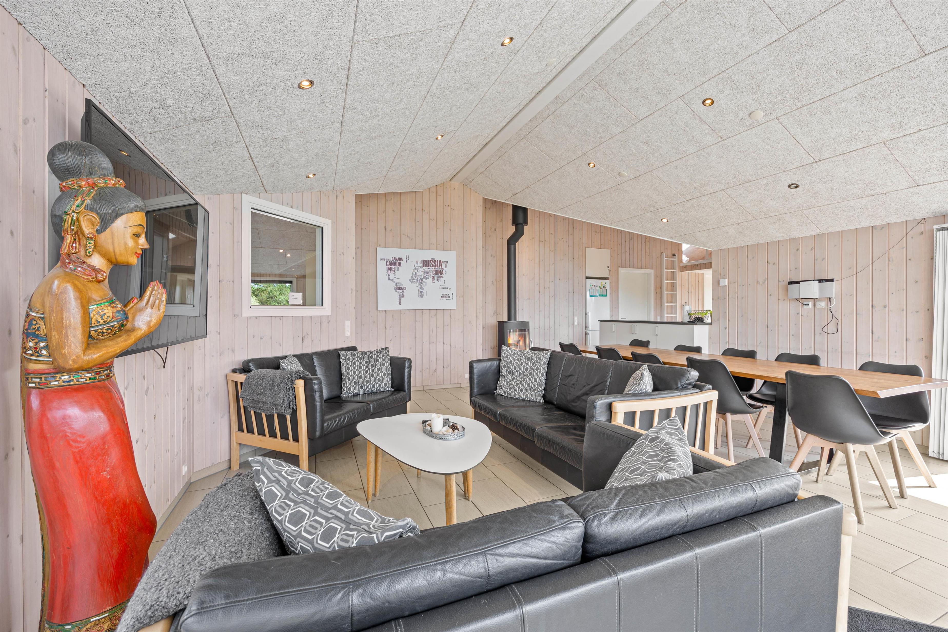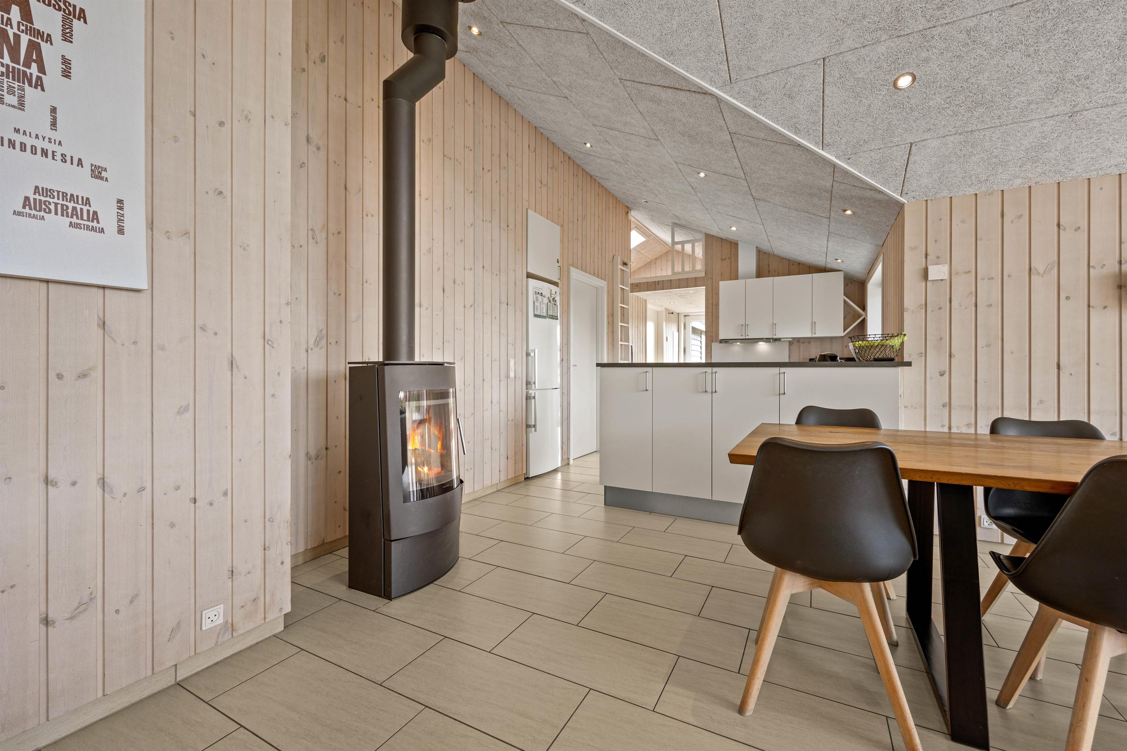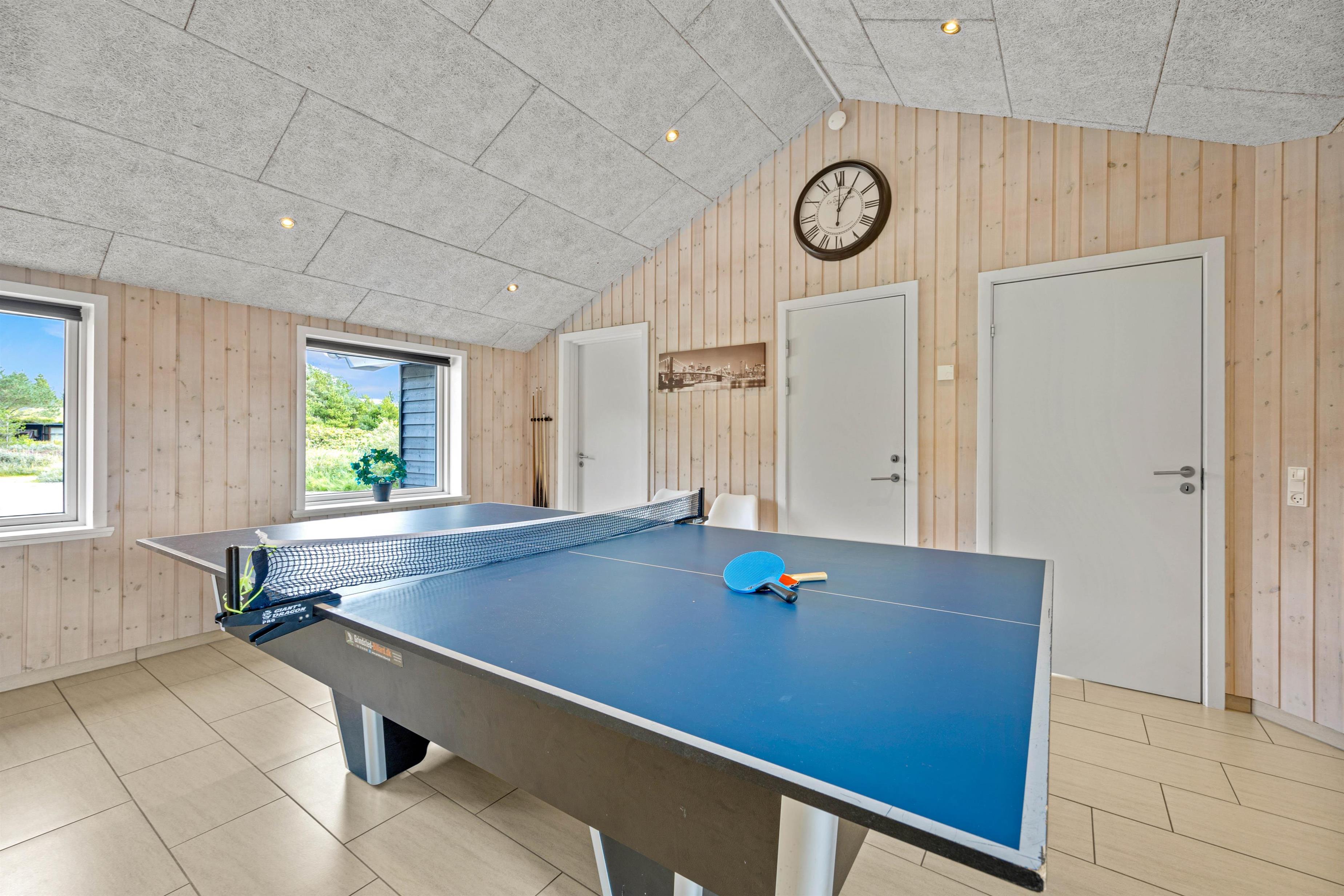 The generous living area invites relaxation and features a wood-burning stove for cosy evenings. Here you'll also find the large dining table with room for the whole family. Entertainment comes in the form of a games room with pool table, table football, darts, and even table tennis.