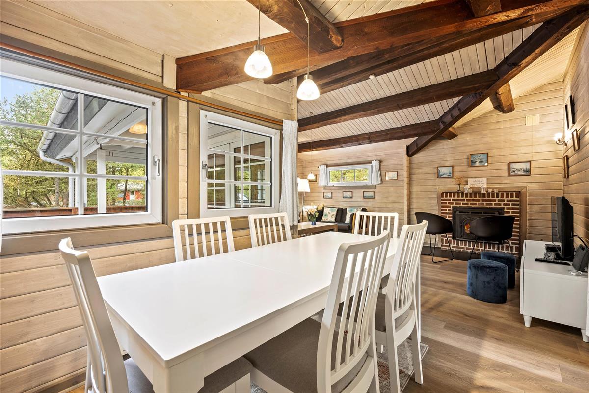 Upon entering the holiday home, you'll find a practical entrance hall. The comfortable living room features a beautiful brick fireplace and cosy seating area. Here you can watch films by the crackling fire and enjoy board games in the adjoining dining area.