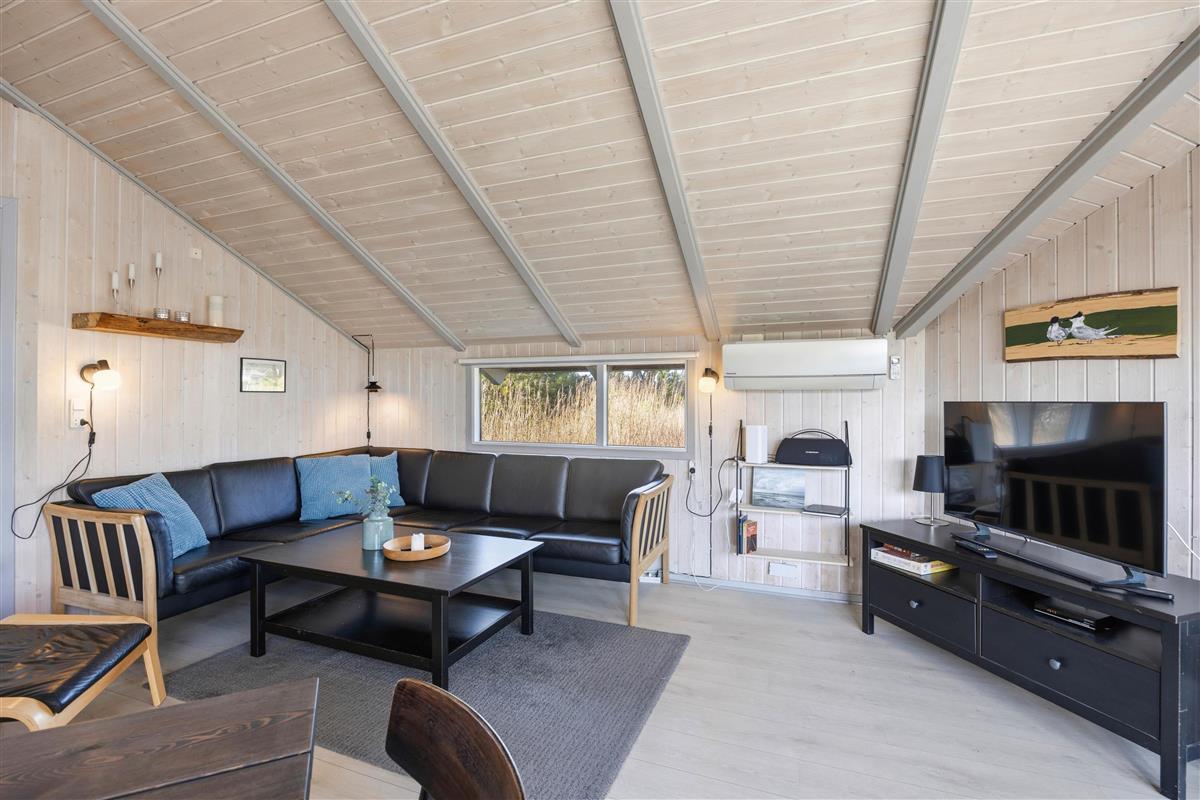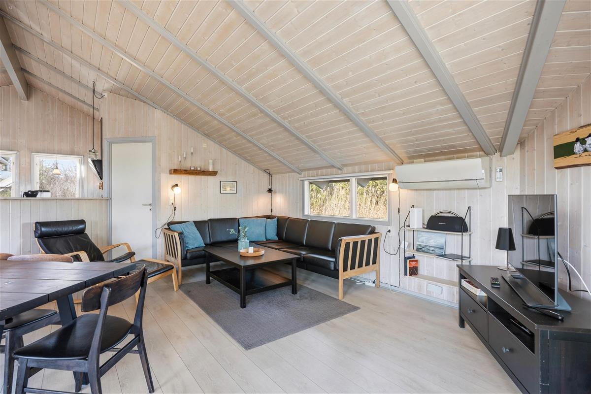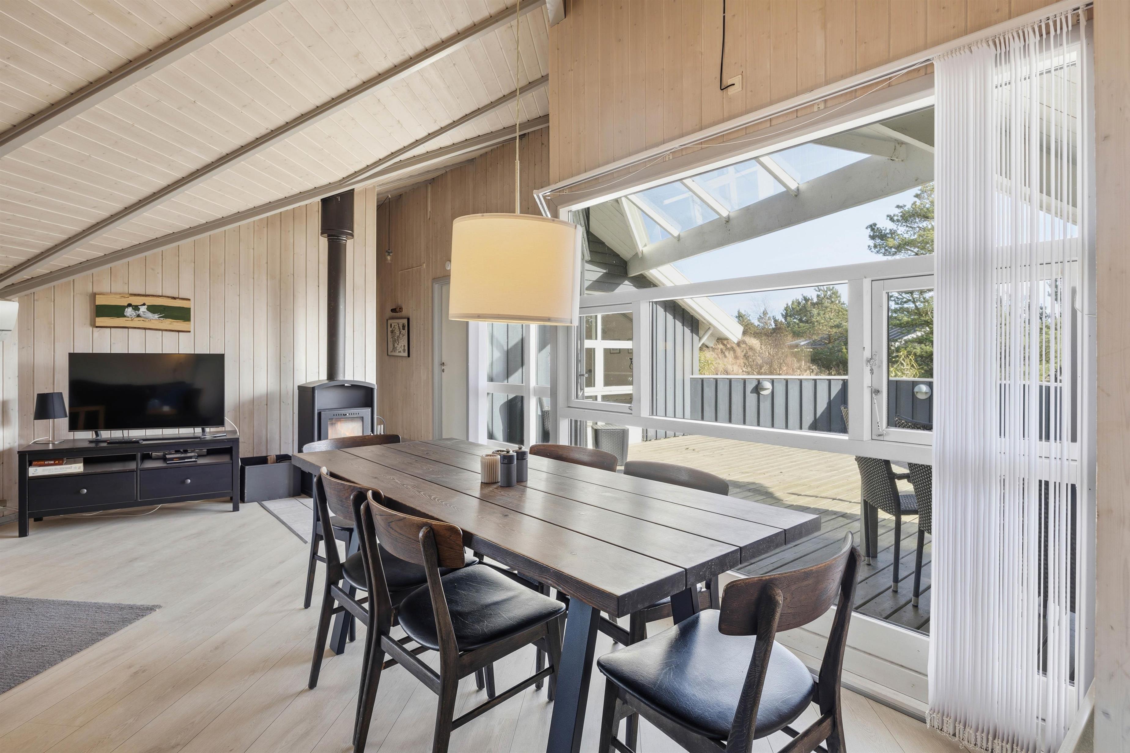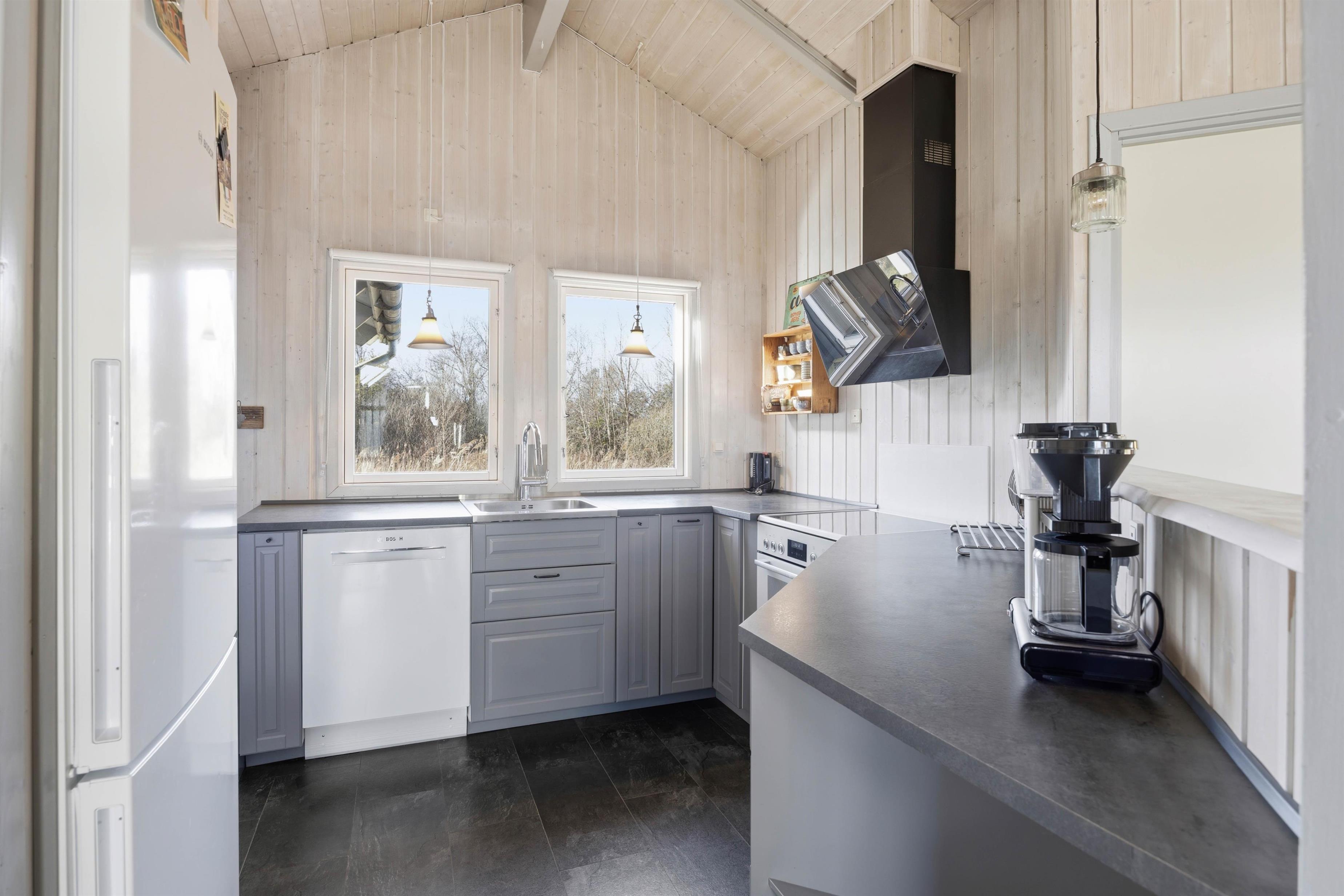 Das Ferienhaus verfügt über einen schönen Aufenthaltsraum, der Wohn- und Essbereich kombiniert und offen mit der voll ausgestatteten Küche verbunden ist. Zentral im Raum befindet sich der Kaminofen, sodass ihr ihn von allen Bereichen aus genießen könnt. Die Einrichtung ist in neutralen Farbtönen gehalten und durch die vielen Fenster strömt reichlich Tageslicht herein, was eine angenehme Atmosphäre schafft. Entspannt euch mit einem guten Buch, verbringt gemeinsame Zeit bei einem Brettspiel oder backt etwas Leckeres für den Nachmittagskaffee.