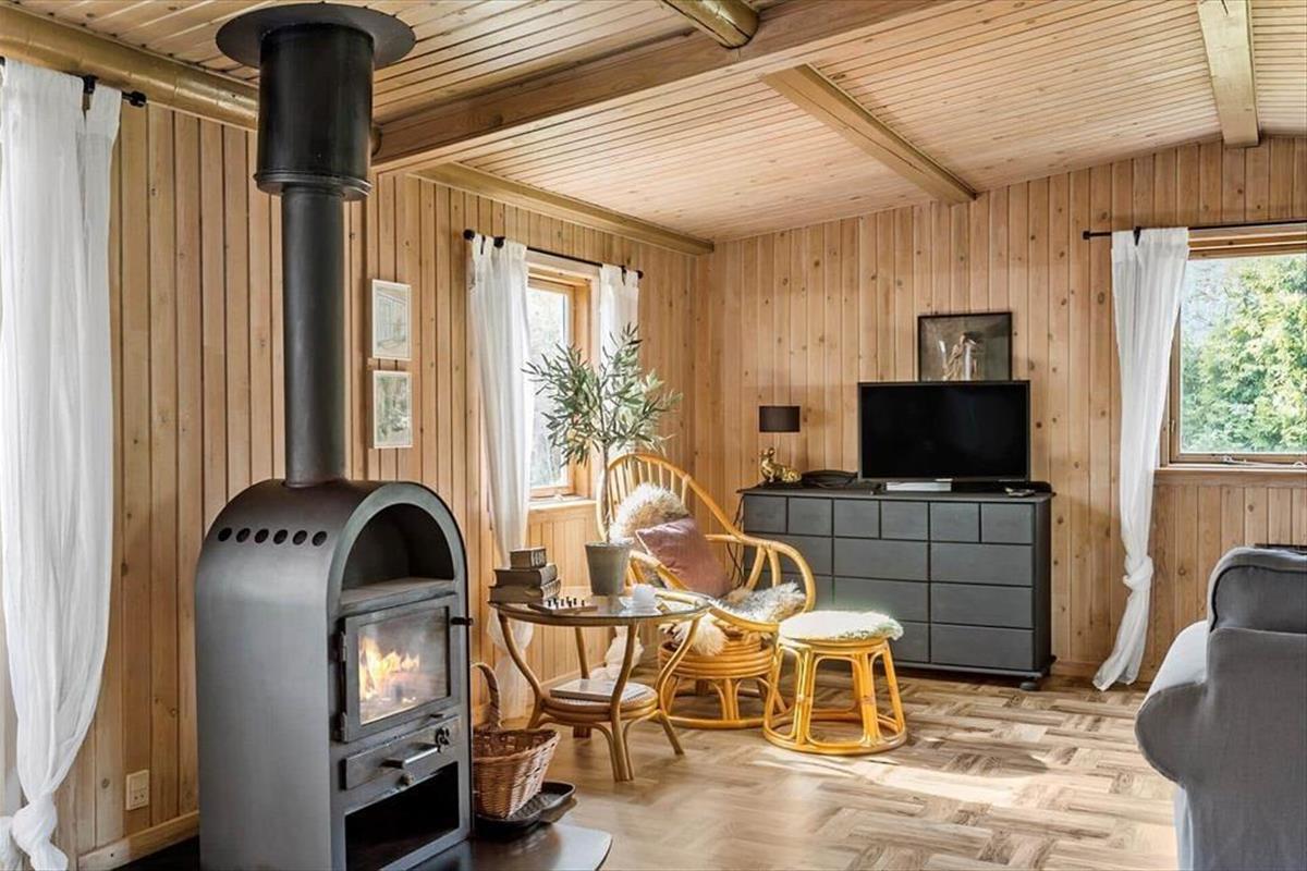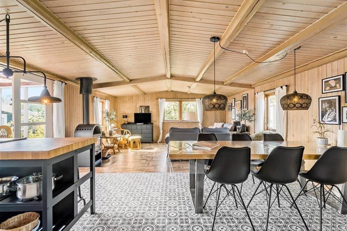 Beim Betreten erwarten dich eine warme Atmosphäre und eine Einrichtung, die echte Ferienhausstimmung ausstrahlt. Die gut ausgestattete Küche ist offen mit dem Essbereich und dem Wohnzimmer verbunden, wo der Kaminofen an kühlen Abenden Gemütlichkeit verbreitet. Hier findest du alles, was du brauchst, um gemeinsame Mahlzeiten zu genießen und dich in komfortabler Umgebung zu entspannen.