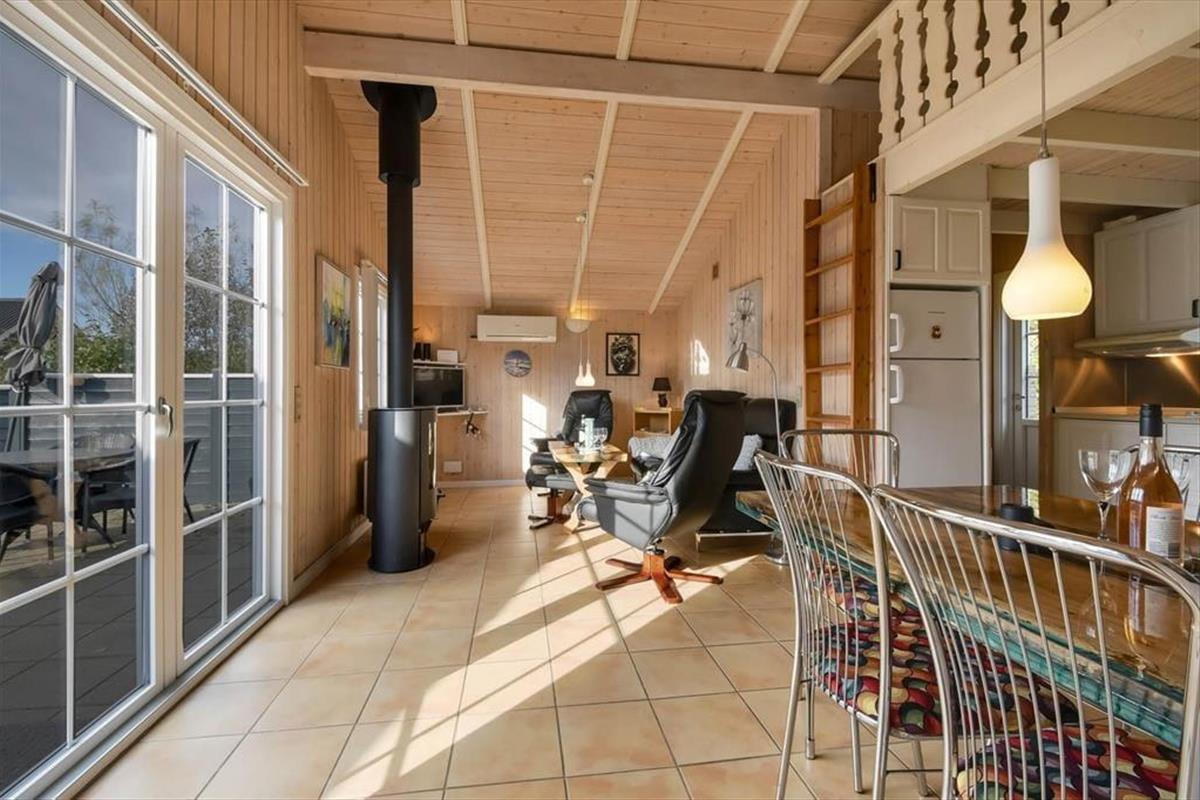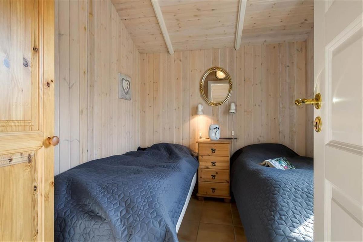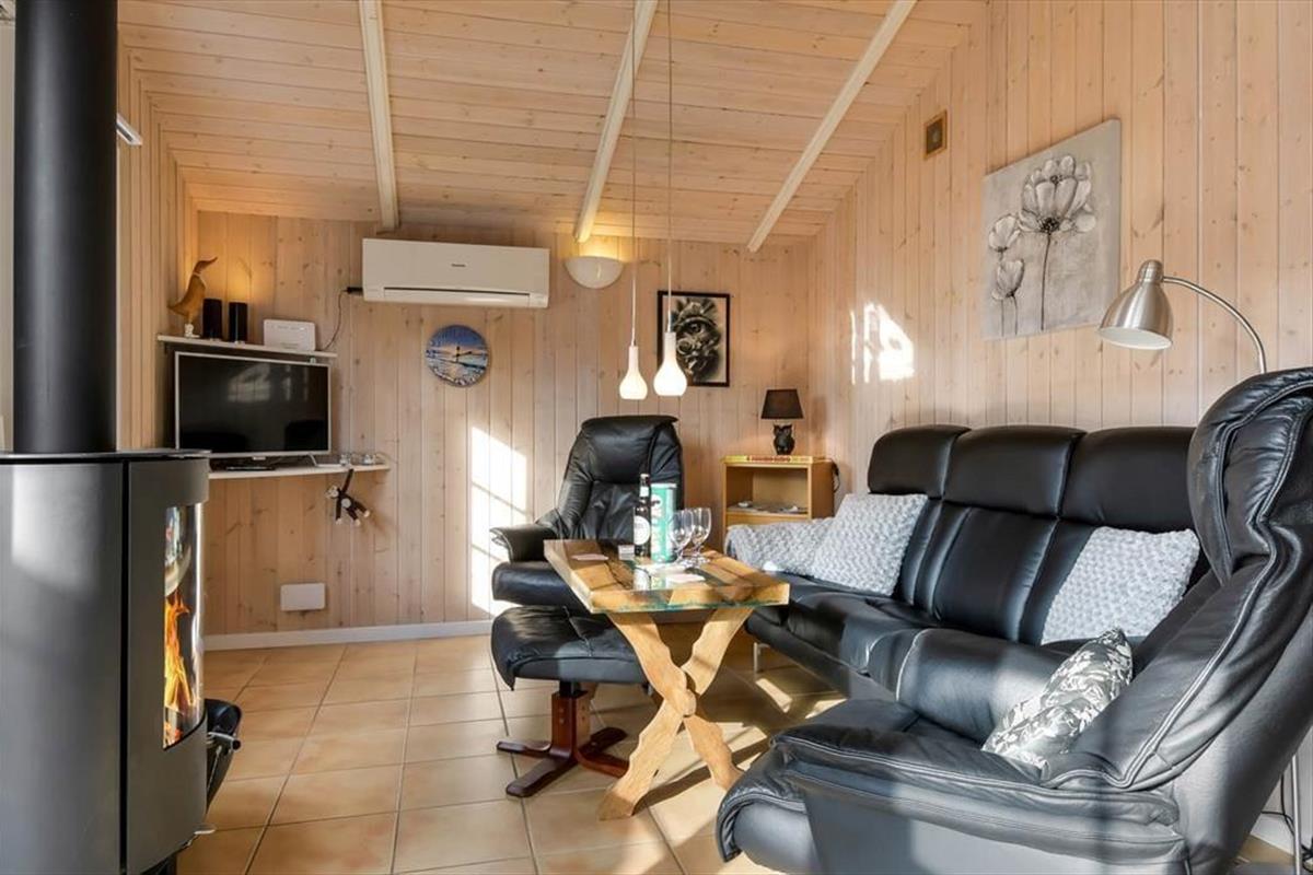 Mit seiner Wohnfläche von 50 m² zählt dieses Haus nicht zu den größten Exemplaren. Wird jedoch jeder Quadratmeter bestmöglich ausgenutzt, benötigt man nicht mehr. Dank der wohldurchdacht gewählten Einrichtung und Raumaufteilung beherbergt dieses Objekt problemlos bis zu vier übernachtende Urlauber. Die Schlafplätze verteilen sich auf einen Schlafraum mit einem Doppelbett und einen Schlafraum mit zwei Einzelbetten. Auch das Badezimmer ist ansprechend und funktionell gestaltet. Im Aufenthaltsraum, der an die offene Küche anschließt, sorgen weiche Sitzmöbel und ein Kaminofen für ein Maximum an Gemütlichkeit und laden zu entspannten Stunden ein.