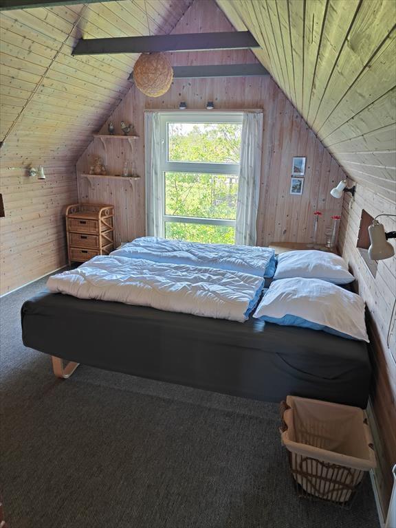 Hübsch erstrahlt das Haus mit gelber Fassade und weißen Fensterrahmen inmitten des grünen Grundstücks. Im Hausinneren erwartet Sie eine 72 m² umfassende Wohnfläche, die sich auf zwei Stockwerke verteilt. Die helle Holzverkleidung, die markanten Deckenbalken und der Kaminofen sind einige der Dinge, die dem Wohnbereich im Erdgeschoss seine angenehme Wohnatmosphäre verleihen. Dieser setzt sich aus dem Wohnzimmer und der offen angrenzenden Küche zusammen. Im Eingangsbereich steht Ihnen eine Waschmaschine zur Verfügung. Das Erdgeschoss beherbergt darüber hinaus auch ein Badezimmer und einen Schlafraum mit zwei Einzelbetten. Im oberen Stockwerk gibt es zwei weitere Schlafzimmer, eine mit zwei Einzelbetten und eines mit einem Dobbelbett.