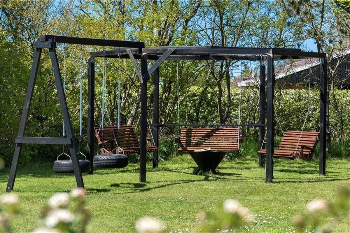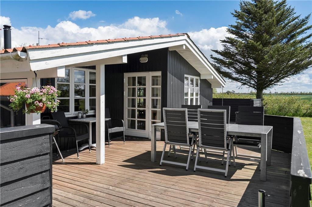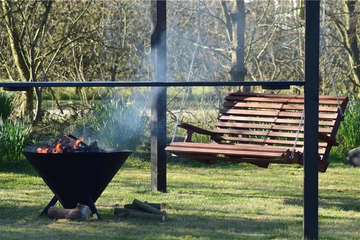 Die Terrasse ist groß und teilweise überdacht und erstreckt sich über mehrere Seiten des Ferienhauses, sodass mehrere gute Sonnenplätze zur Verfügung stehen. Im Osten blickt man auf die offene Feldlandschaft, die sich auf der anderen Seite der Hecke ausbreitet – und das ist eine schöne Aussicht, egal ob man in den Gartenstühlen entspannt oder auf der Wiese spielt. Darüber hinaus gibt es eine schöne Schaukelumgebung mit Feuerstelle.