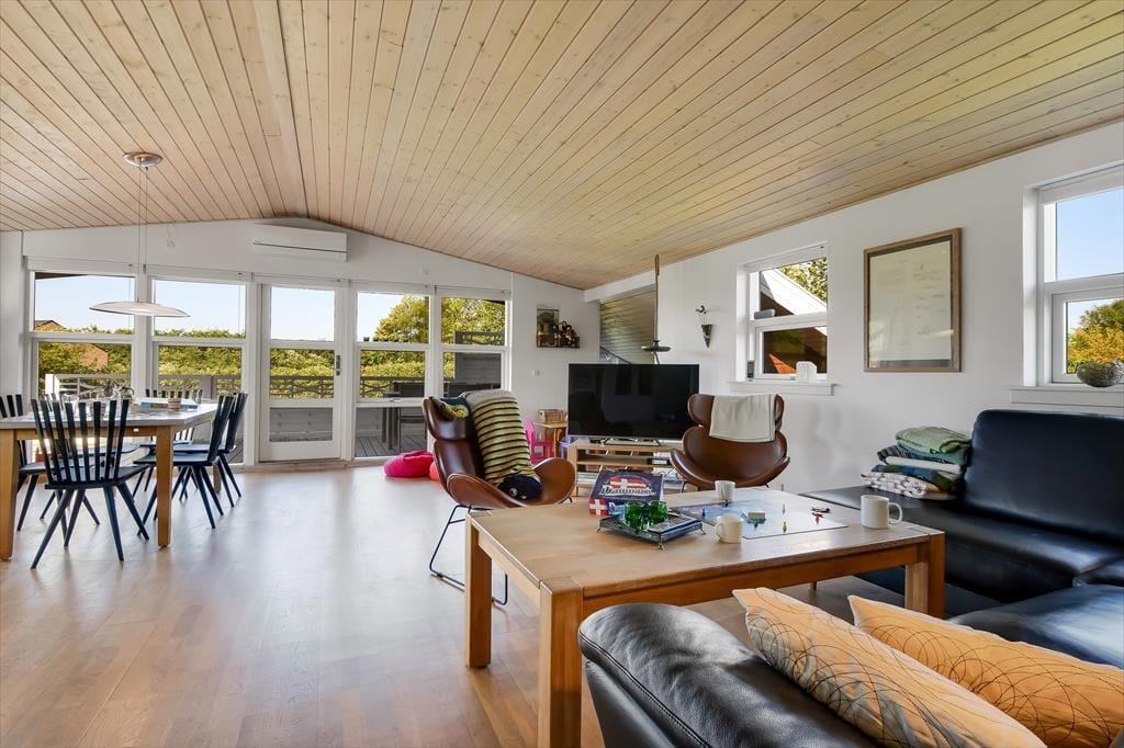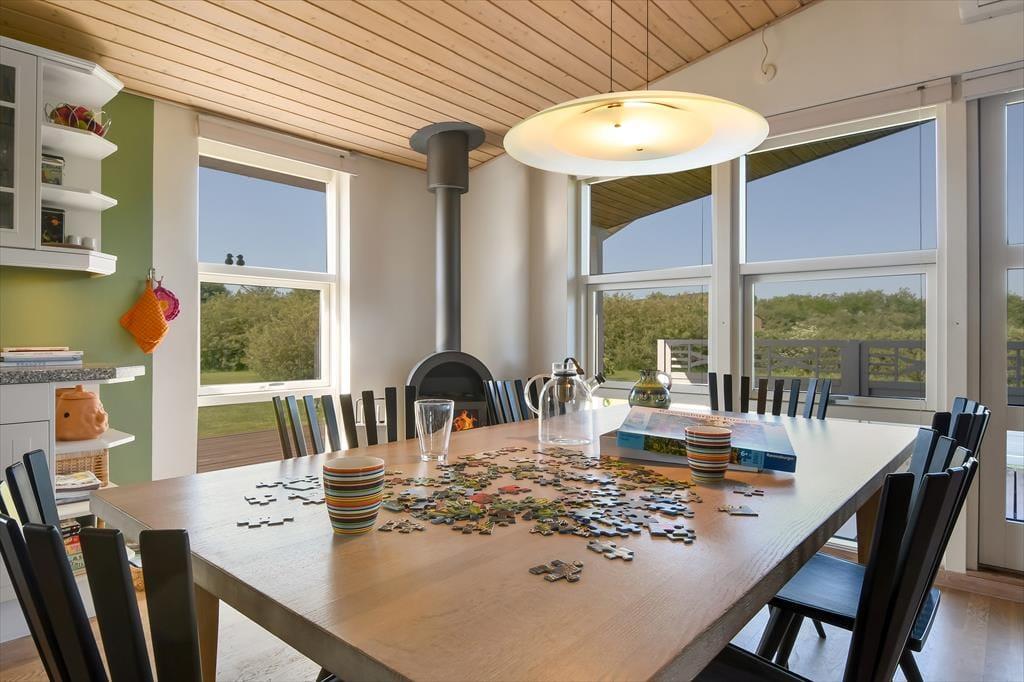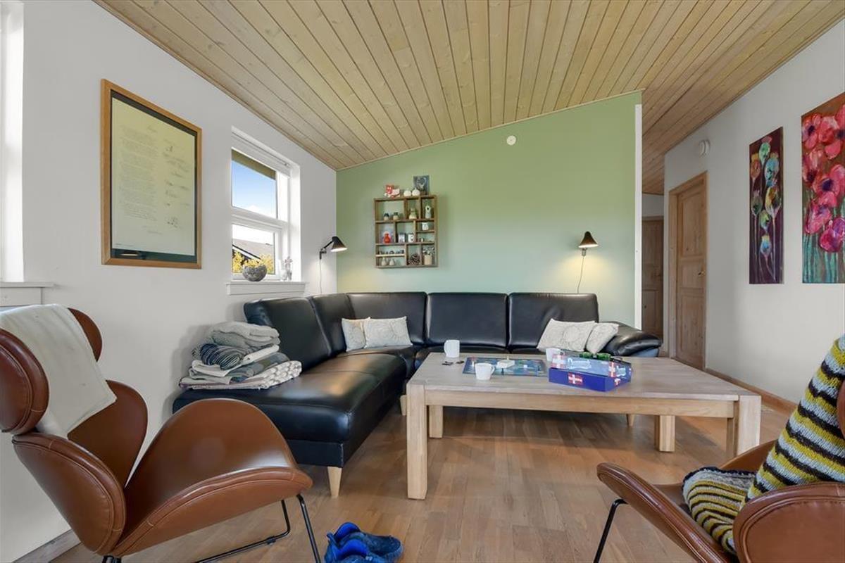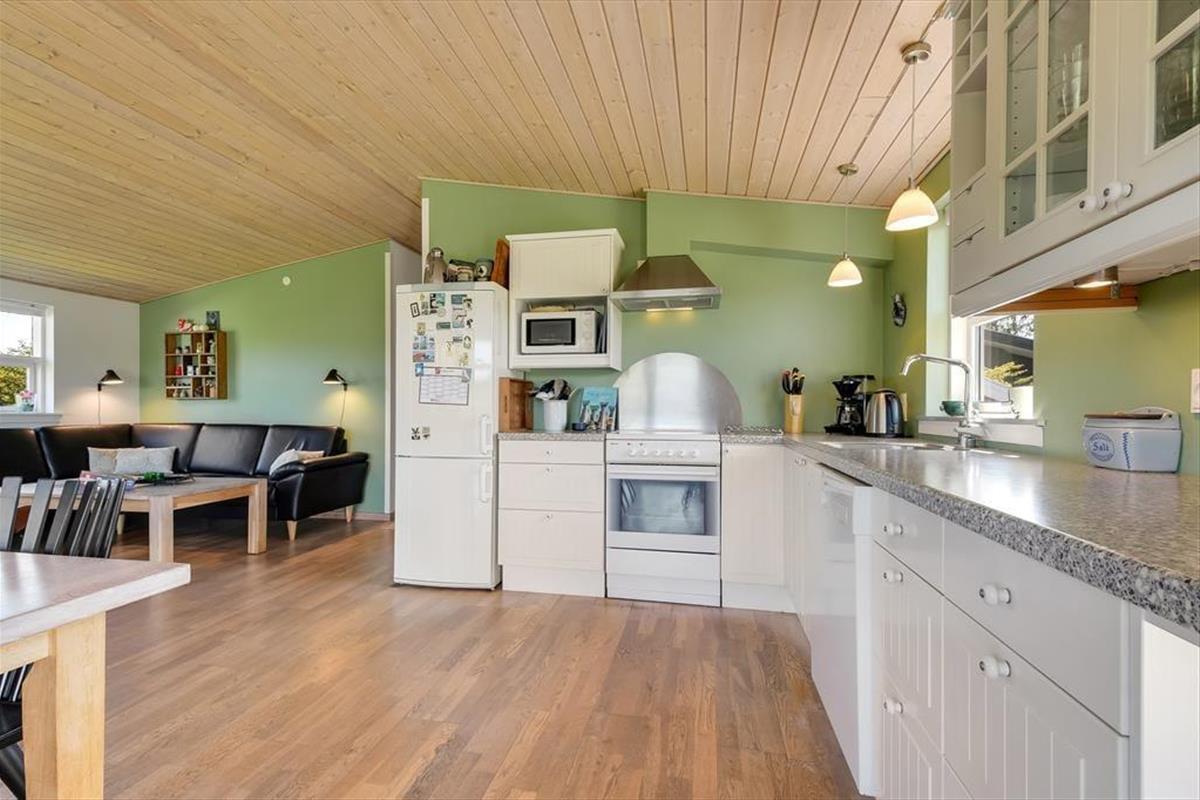Die hübsch eingerichteten Räumlichkeiten des Ferienhauses erfreuen sich jeder Menge Tageslicht – nicht zuletzt der große Aufenthaltsraum mit seiner Panoramaverglasung. Sowohl hier als auch in den anderen Räumen, inklusive drei Schlafzimmern, einem Badezimmer und einer Waschküche mit Waschmaschine und Wäschetrockner, wird deutlich, dass viel Wert darauf gelegt wurde, ein nicht nur gemütliches, sondern auch funktionelles Urlaubsdomizil zu schaffen: Badezimmer und Waschküche verfügen über eine Fußbodenheizung, alle Schlafzimmer sind mit komfortablen Doppelbetten ausgestattet und auch für ein Kinderbett, einen Hochstuhl und Spielzeug für die kleinsten Feriengäste ist gesorgt. Ein Alkoven im Wohnzimmer kann zwei Personen als zusätzlicher Schlafplatz und tagsüber den Kindern als herrliche Spielwiese dienen. Im Wohnzimmer können Sie sich auf den komfortablen Möbeln vor dem Fernseher und dem Kaminofen entspannt zurücklehnen. Dank der ins Wohnzimmer integrierten, gut ausgestatteten Küche können Sie Ihre Mahlzeiten gemeinsam zubereiten, ohne dass es eng wird.