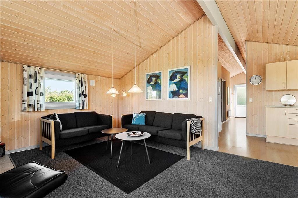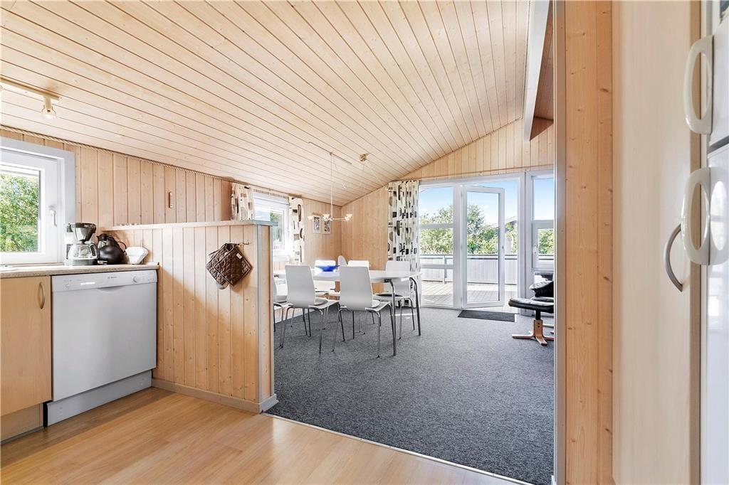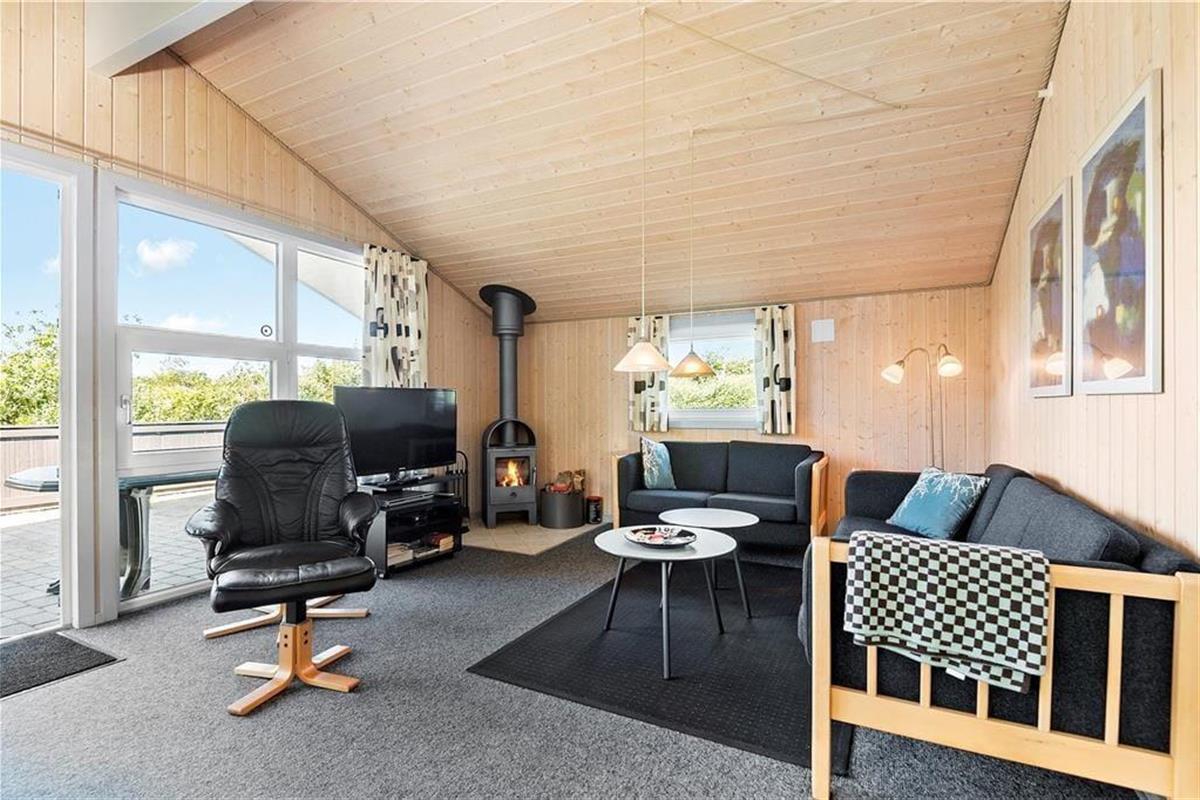 Die einladende Wohnatmosphäre bezieht sich nicht nur auf den offenen Aufenthaltsbereich, sondern auch auf die zwei Schlafräume und das Badezimmer. Letzteres verspricht mit seiner integrierten Sauna entspannte Stunden, die Sie beispielsweise nach einem erfrischenden Herbstspaziergang so richtig genießen können. Mit heimeliger Wärme und Gemütlichkeit lockt auch der Wohnraum, in dem der Kaminofen für echte dänische Ferienhausstimmung sorgt. Gemütliche Abende können in der Sofaecke oder auch bei der gemeinsamen Zubereitung der Mahlzeiten in der offenen Küche sehr schön verbracht werden. Zu den praktischen Details zählen die Waschmaschine und der Geschirrspüler. Für die jüngsten Urlaubsgäste stehen ein Kinderbett und ein Hochstuhl bereit.