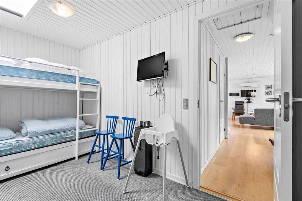 Bei diesem attraktiven Mietobjekt handelt es sich um ein klassisches Holzferienhaus aus dem Jahr 1983, das allerdings einer geglückten Renovierung unterzogen wurde. Nach der Modernisierung erwartet Sie nu ein schön ausgestattetes Haus mit tollen Details – inklusive Whirlpool und Sauna in einem der beiden Badezimmer, einem großen Hauswirtschaftsbereich mit Waschmaschine und Trockner sowie einer gut ausgestatteten Küche, die offen in den schönen Wohnraum integriert ist, welcher von der behaglichen Wärme des Kaminofens verwöhnt wird. Machen Sie es sich mit einem Brettspiel, mit einem guten Essen in geselliger Runde am Esstisch oder auch mit einem spannenden Film auf dem Sofa gemütlich – Ferienhausurlaub in seiner schönsten Form! Anschliessend können Sie sich in insgesamt vier Schlafzimmer zurückziehen. Drei davon begrüßen Sie mit je einem Doppelbett. Der vierte Raum ist mit einem Etagenbett ausgestattet. Somit eignet sich dieses reizende Ferienhaus für den Urlaub von sechs Erwachsenen und zwei Kindern.
