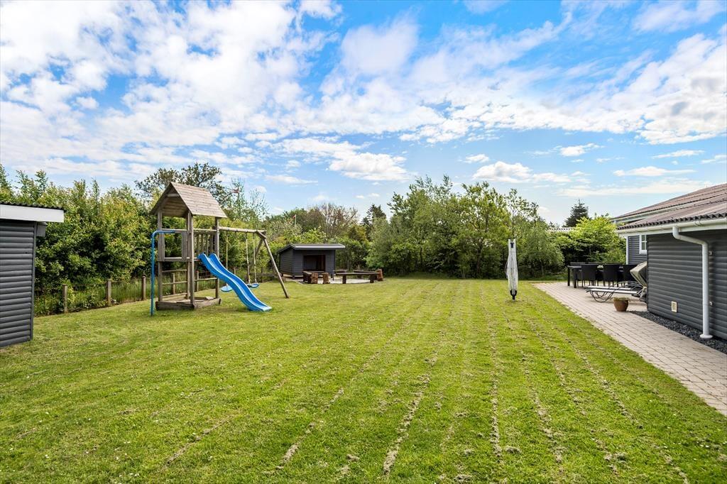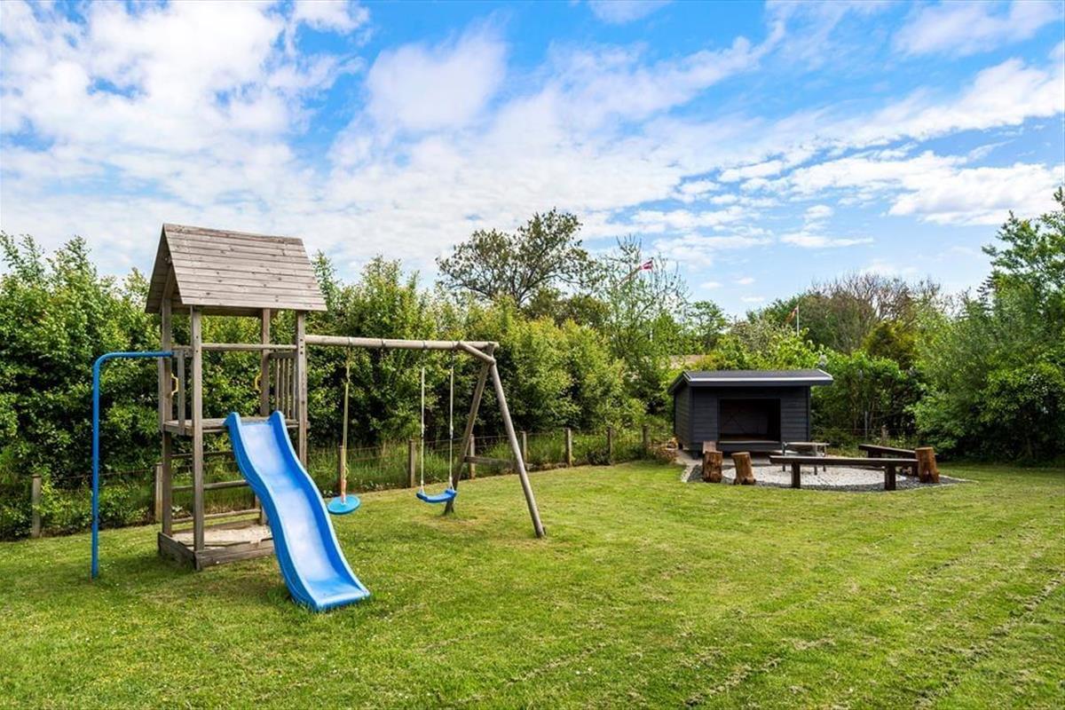 Erwachsene und Kinder wird es, sobald die Sommersonne vom Himmel lacht, hinaus auf das Ferienhausgrundstück ziehen. Dieses bietet mit einer Fläche von 1.200 m² viel Platz zum Spielen und Erholen. Im ungestörten hinteren Teil des Gartens lockt ein Schaukelgerüst für die Kleinsten. Hier befindet sich darüber hinaus auch die attraktive Feuerstelle, an der Sie allabendlich in gemütlicher Runde Stockbrot und Grillwurst rösten können. Gemütlich geht es auch auf den Terrassen zu, die sich rund um das Ferienhaus erstrecken. Die nach Süden gerichtete Terrasse befindet sich in direkter Verlängerung des Wohnraumes und ist komplett überdacht. Daher können Sie auf dieser Terrasse auch dann noch wunderbar im Freien sitzen, wenn die Dunkelheit bereits hereingebrochen ist oder es regnen sollte. Zudem können Sie einmal ausprobieren, im Shelter bei der Feuerstelle im Freien zu übernachten.
