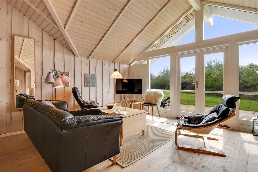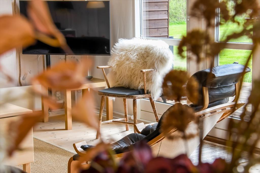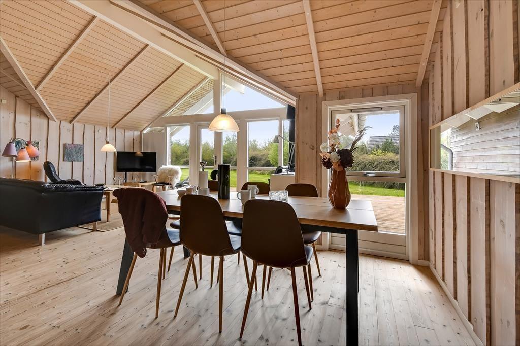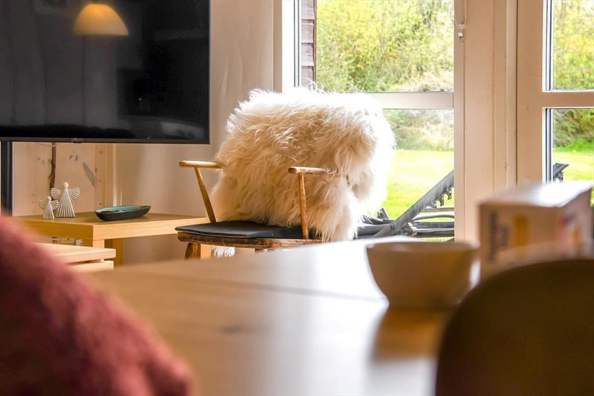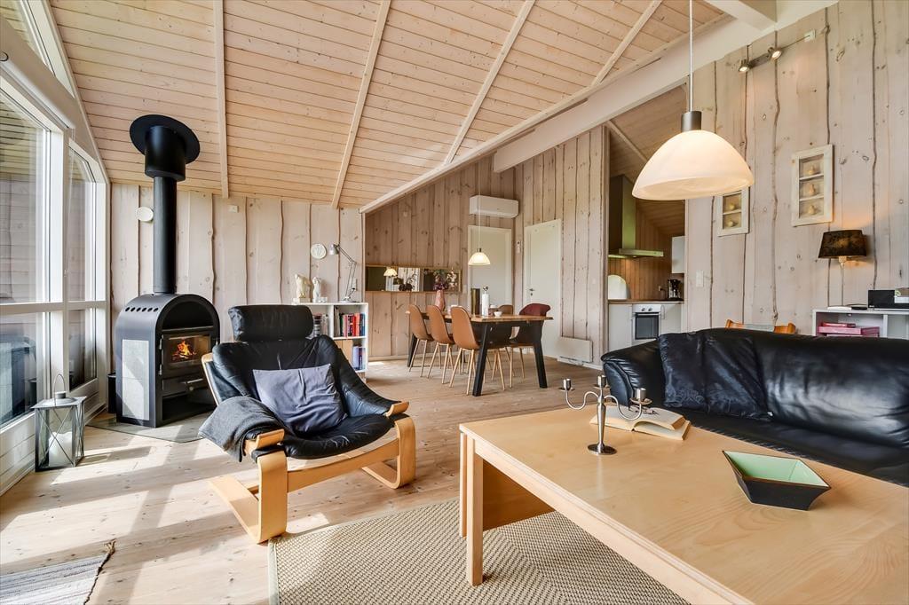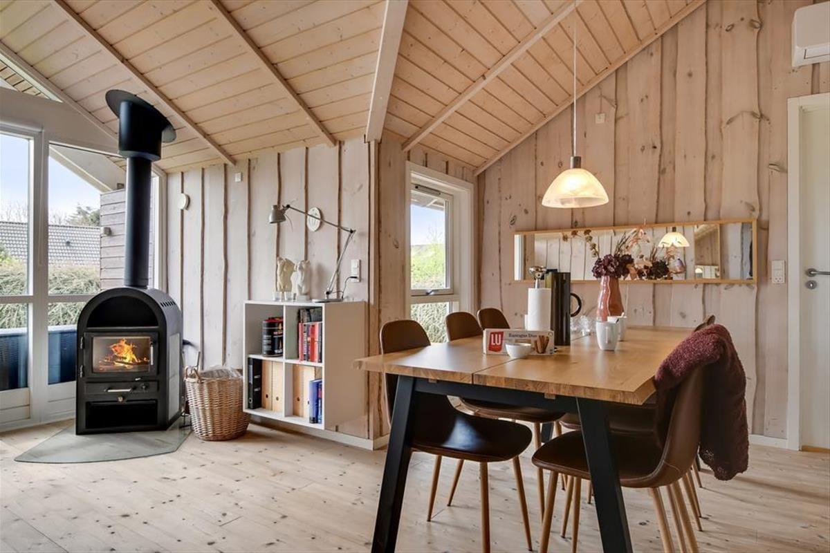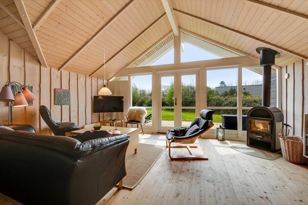 Die holzverkleideten Wände und hohen Decken verleihen dem Hausinneren ein schönes, klassisches Wohnambiente. Die wohl durchdacht ausgewählte Möblierung unterstreicht die gemütliche Atmosphäre. Für ein Maximum an Gemütlichkeit und echter dänischer Ferienhausstimmung sorgt an kühlen Nachmittagen und Abenden das behaglich knisternde Feuer im Kaminofen, das Sie sowohl am Esstisch als auch in der Sofaabteilung genießen. In der offenen Küche können Sie problemlos die kleinen und größeren Urlaubsmahlzeiten zubereiten. Im Hauswirtschaftsbereich stehen Ihnen außerdem eine Waschmaschine und ein Wäschetrockner zur Verfügung. Zur Wohnfläche zählen darüber hinaus auch drei gute Schlafräume, ein Gäste-WC und ein großes Badezimmer. Letztgenanntes ist besonders hervorzuheben, da es Ihnen mit seiner Fußbodenheizung, der Sauna und dem Whirlpool mit Sicherheit das Urlaubsleben versüßen wird.