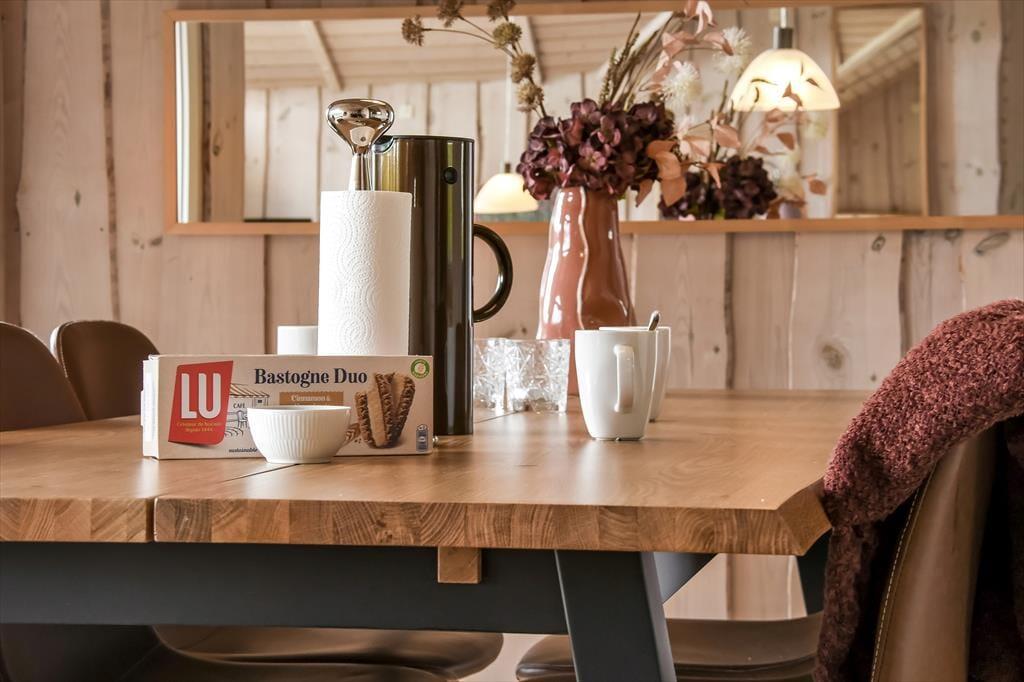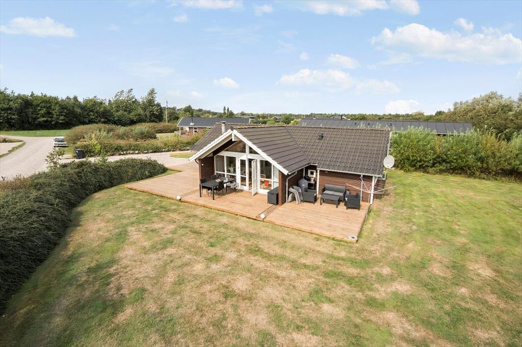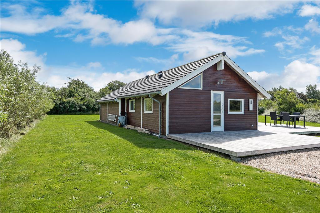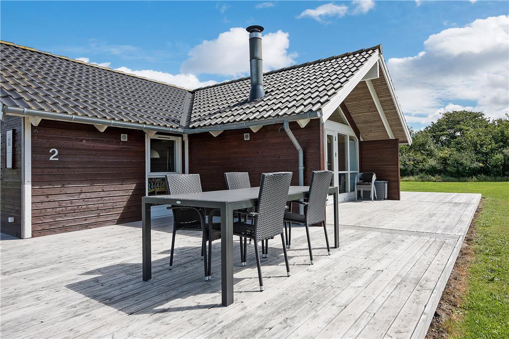 Vom Wohnraum aus genießen Sie direkten Zugang zur Holzterrasse, bei der es sich um ein ausgesprochen großes und schönes Exemplar handelt, das drei Seiten des Ferienhauses umgibt. Ein Teil der Terrasse ist überdacht, der Rest ist offen. Daher eröffnen sich Ihnen vielfältige Möglichkeiten, das Leben auf den Gartenmöbeln und Liegestühlen in vollen Zügen zu genießen.