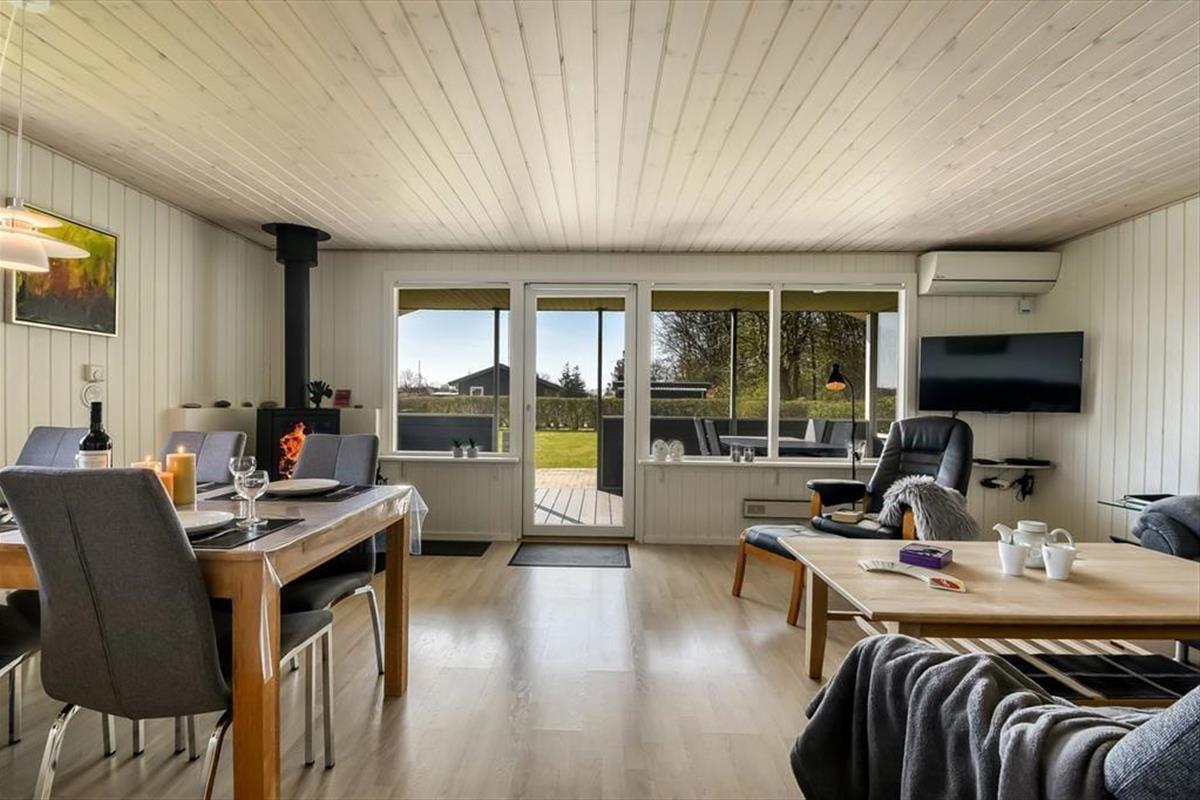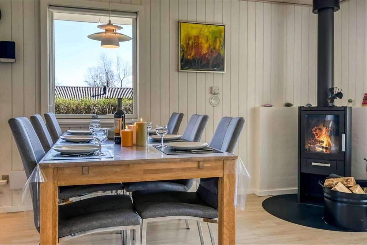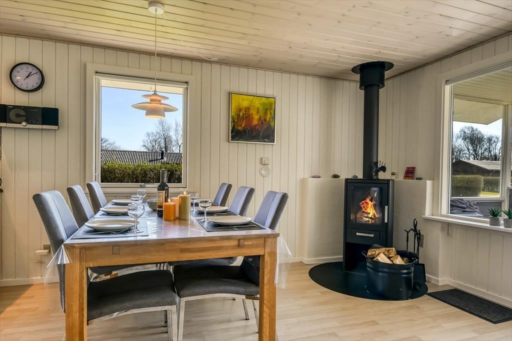 Das Ferienhaus befindet sich seit 1974 in dieser schönen, ein wenig zurückgezogenen Lage. Dank einer Renovierung in 2020 präsentiert es sich in einem gepflegten Zustand. Im Hausinneren runden helle Holzwände und die Möblierung das einladende Ambiente ab. In einer Ecke des Wohnzimmers ist ein Kaminofen platziert, der an kühlen Abenden zur gemütlichen Ferienhausstimmung beiträgt. Eine Wärmepumpe ist ebenfalls vorhanden. Aufgrund der zusätzlichen Kühlfunktion dürfen Sie sich an warmen Sommertagen auf angenehme Innentemperaturen freuen. Neben der Sofaabteilung beinhaltet der Wohnraum auch einen Fernseher mit Chromecast-Anschluss. Hinzu gesellt sich ein Esstisch, der sich der integrierten Küche anschließt. Dank der offenen Wohnlösung können Sie somit bei der Zubereitung von Mahlzeiten im Familiengeschehen involviert bleiben. Das Haus beinhaltet zudem ein gutes Badezimmer sowie ein extra Gäste WC - beides komplett renoviert in 2022, Zudem gibt es Wasch- und Trocknemöglichkeit sowie drei Schlafräume mit Platz für insgesamt acht übernachtende Urlauber.