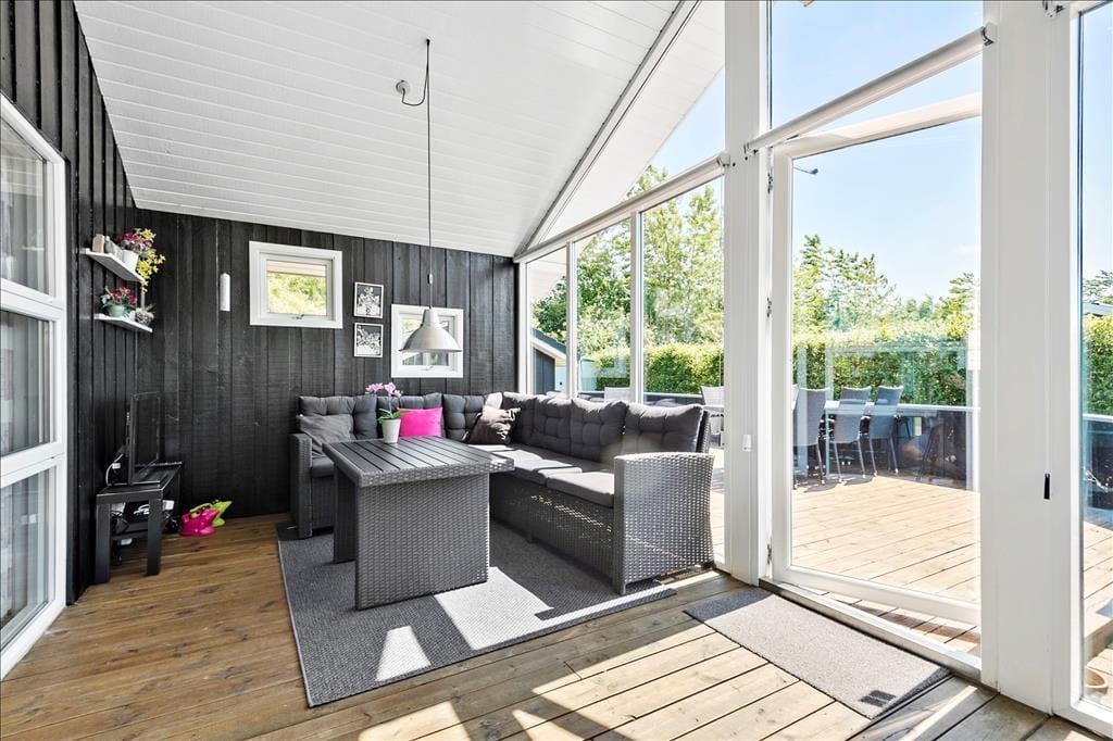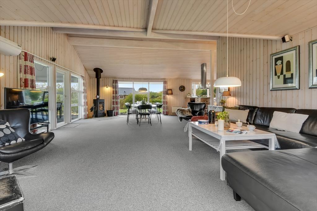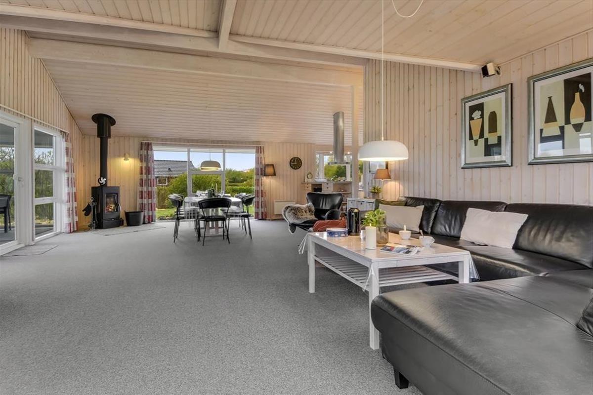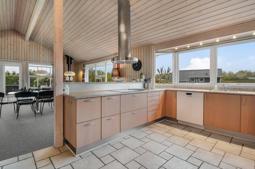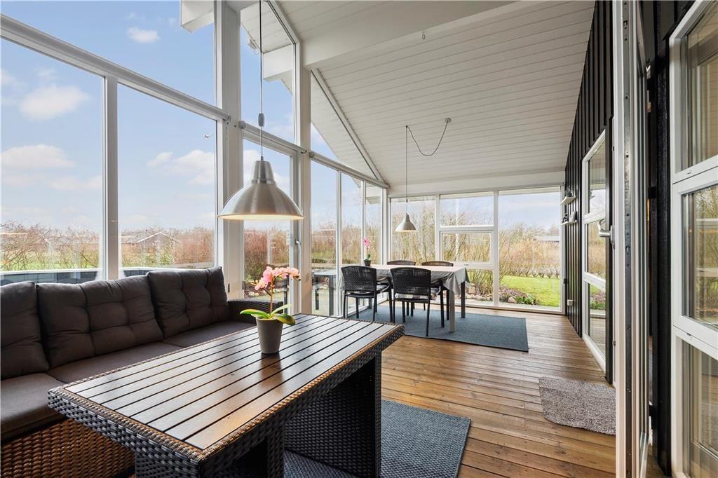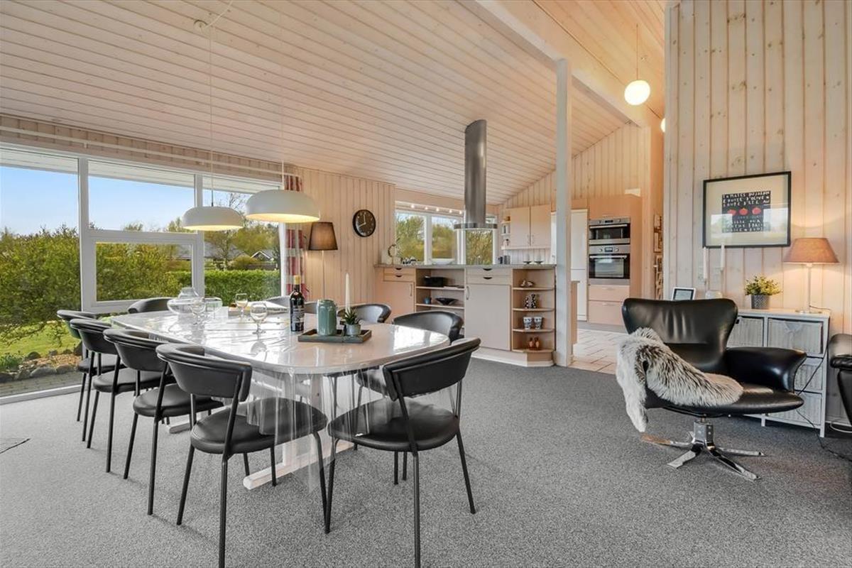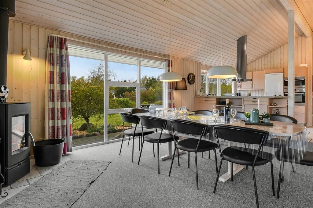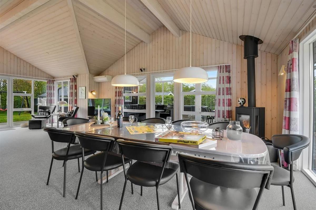 Im Hausinneren können Sie sich auf einer Fläche von insgesamt 174 m² frei entfalten. Die Einrichtung bildet dabei einen hervorragenden Rahmen für das gemütliche Beisammensein. Das Herzstück stellt der große Küchen- und Essbereich dar, der offen mit dem Wohnraum verbunden ist. Hier fällt das Licht von mehreren Seiten ein. Zudem genießen Sie einen schönen Blick hinaus ins Grüne. Vom Wohnraum und vom Wintergarten aus können Sie direkt auf die große Terrasse treten. Das Haus beherbergt darüber hinaus vier geräumige Schlafzimmer und zwei Badezimmer, von denen eines mit einer Sauna zu verwöhnen weiß. Im Essbereich sorgt ein Kaminofen für heimelige Wärme und echte dänische Ferienhausstimmung. Hervorzuheben ist zudem die in allen Räumen installierte Fußbodenheizung.