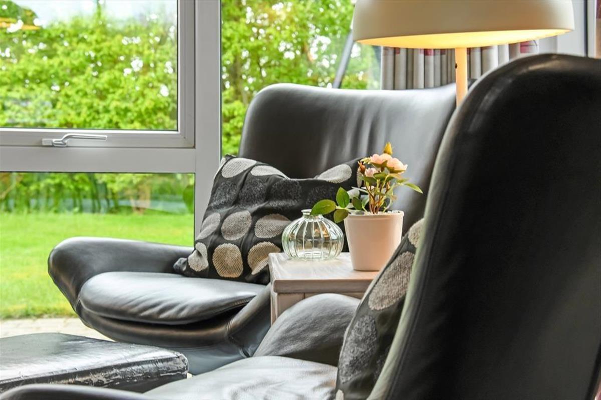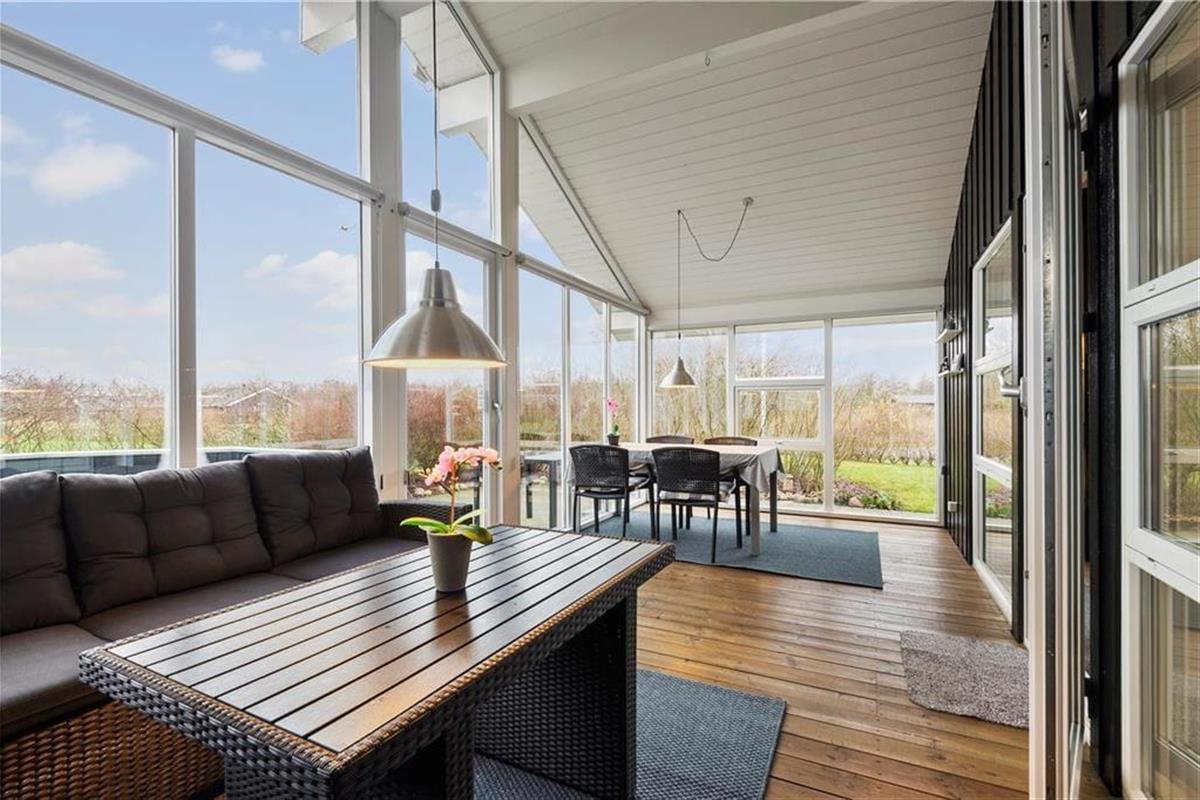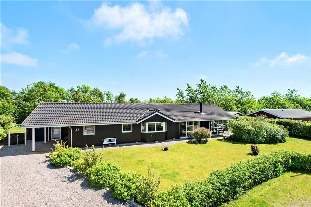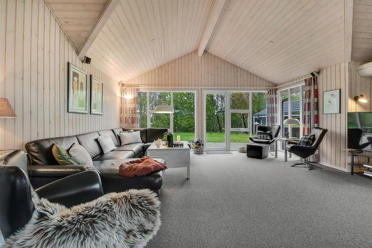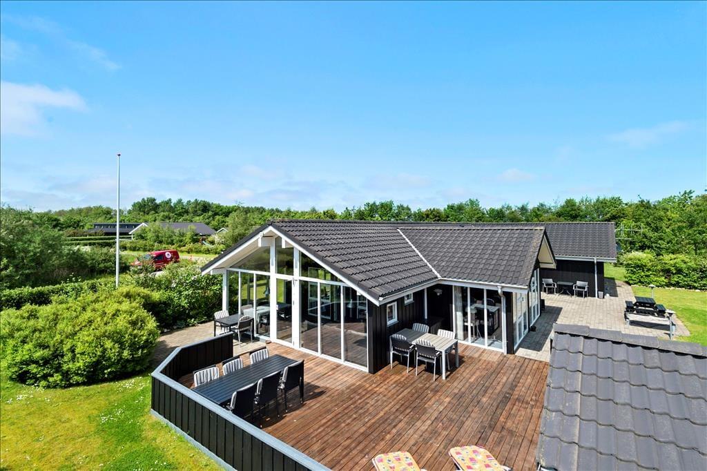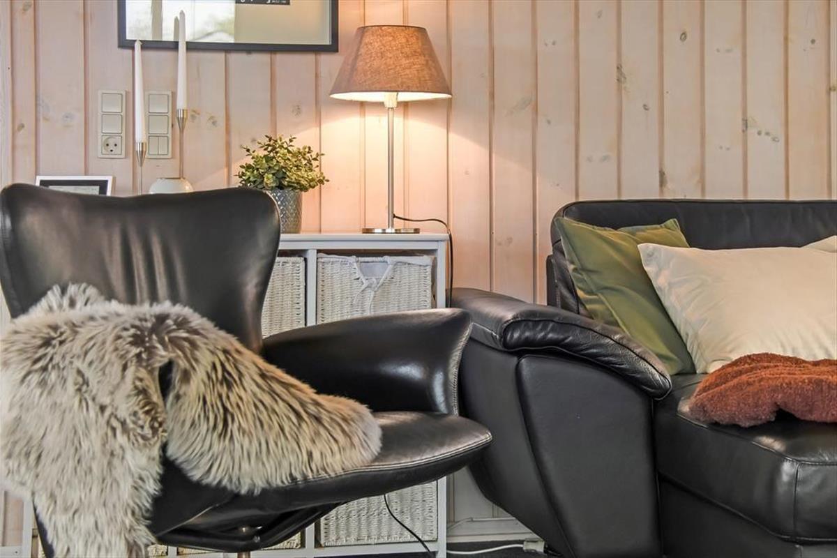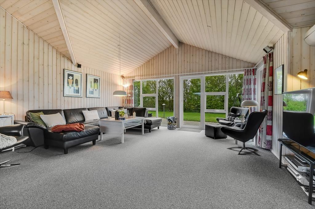 Im Hausinneren können Sie sich auf einer Fläche von insgesamt 174 m² frei entfalten. Die Einrichtung bildet dabei einen hervorragenden Rahmen für das gemütliche Beisammensein. Das Herzstück stellt der große Küchen- und Essbereich dar, der offen mit dem Wohnraum verbunden ist. Hier fällt das Licht von mehreren Seiten ein. Zudem genießen Sie einen schönen Blick hinaus ins Grüne. Vom Wohnraum und vom Wintergarten aus können Sie direkt auf die große Terrasse treten. Das Haus beherbergt darüber hinaus vier geräumige Schlafzimmer und zwei Badezimmer, von denen eines mit einer Sauna zu verwöhnen weiß. Im Essbereich sorgt ein Kaminofen für heimelige Wärme und echte dänische Ferienhausstimmung. Hervorzuheben ist zudem die in allen Räumen installierte Fußbodenheizung.