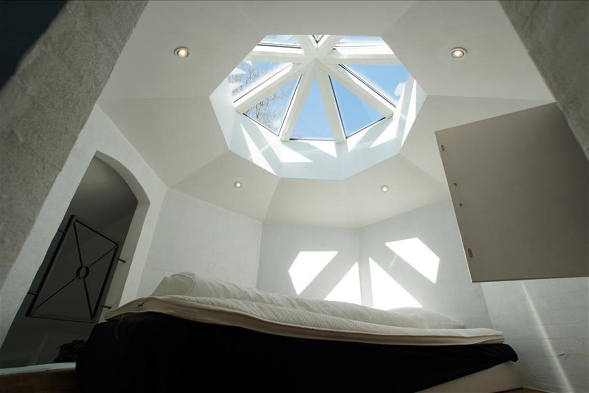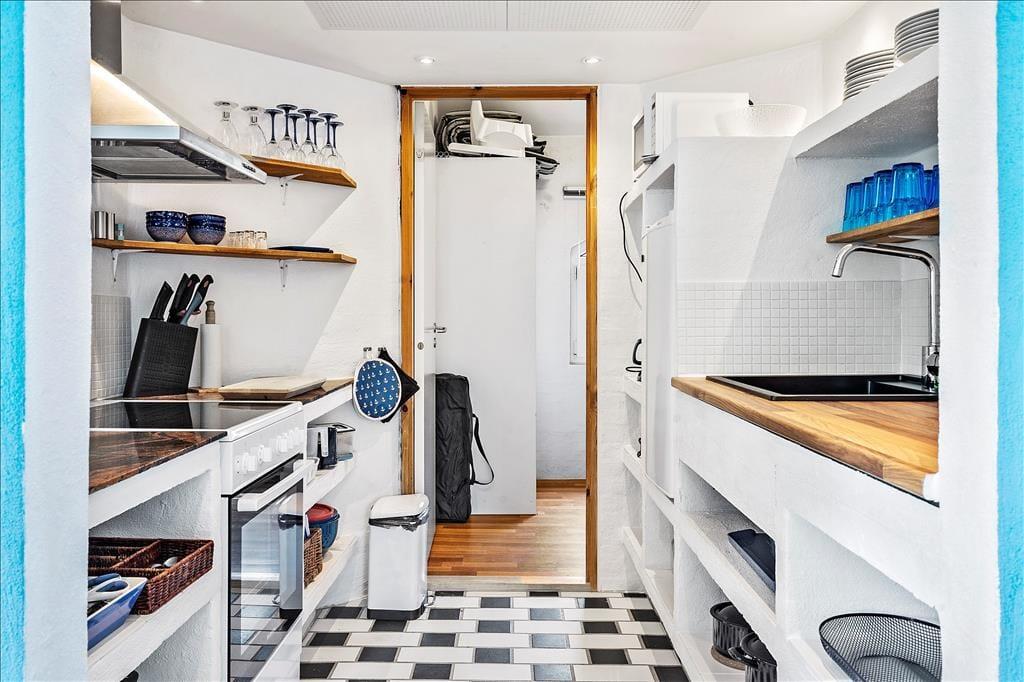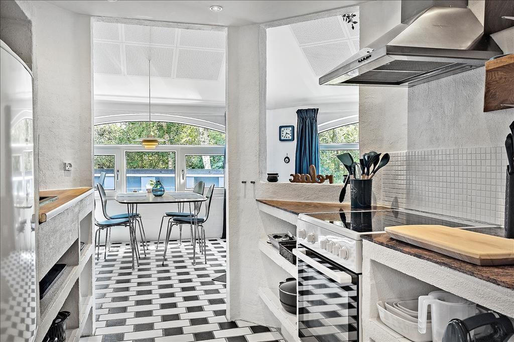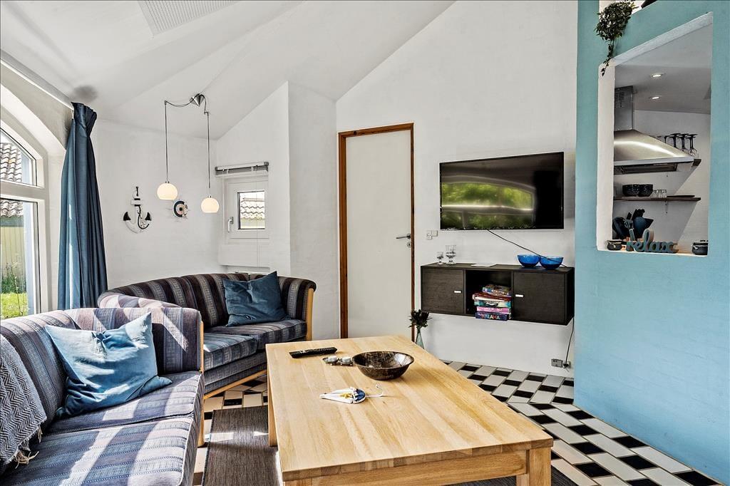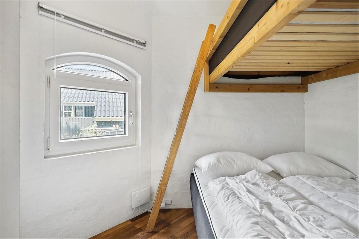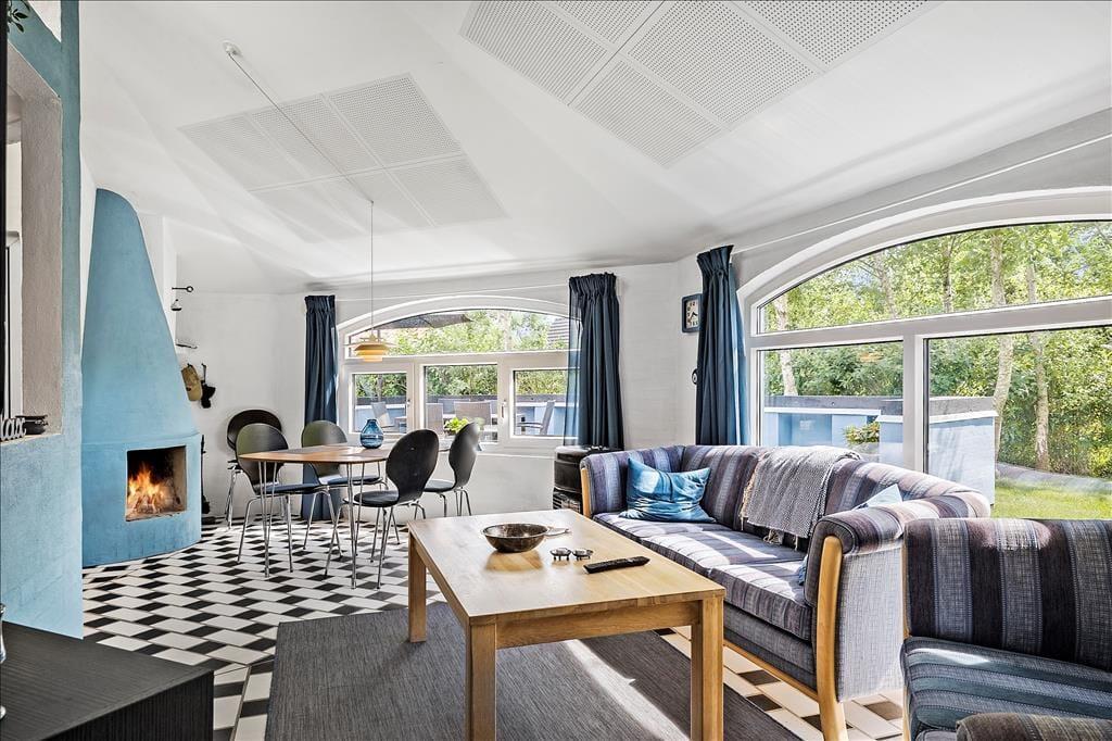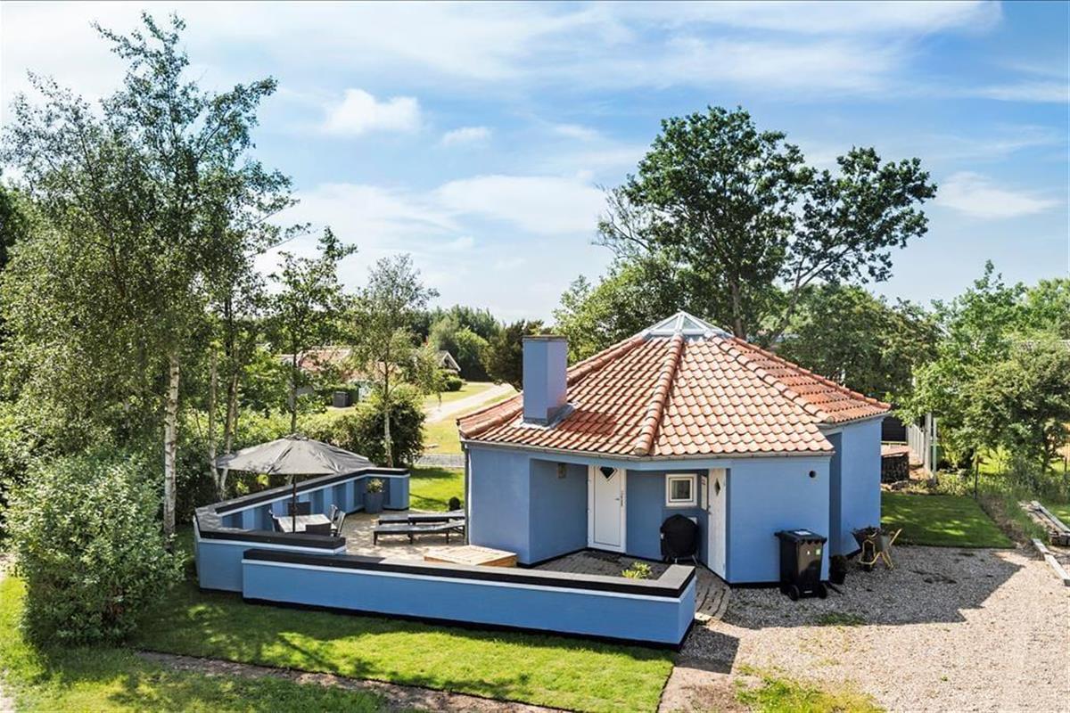 Dieses Ferienhaus hebt sich mit seinem spanisch inspirierten Baustil und seiner achteckigen Form von der Menge ab. Im Hausinneren gehören der gemauerte Kamin und die Fliesenböden zu den interessanten Blickfängen. Das Dachfenster gewährt einen schönen Tageslichteinfall. Der Aufenthaltsraum setzt sich offen aus der Küche und dem Wohnraum zusammen - inklusive eines Smart-TV, mit dem Sie Serien und Filme über Ihren eigenen Streamingdienst streamen können (beachten Sie bitte, dass kein Fernsehprogramm vorhanden ist). Das gesamte Haus ist mit Fußbodenheizung ausgestattet, auch im Bad und den zwei Schlafzimmern. Eines der Schlafzimmer beinhaltet ein Doppel-/Dreiviertelbett mit einem darüber angebrachten Hochbett, das Platz für zwei kleinere Kinder bietet. Das zweite Schlafzimmer ist mit einem Etagenbett ausgestattet. Erwähnen möchten wir, dass sich der Stromkasten und der Warmwasserbereiter in einem Schrank auf dem Schlafboden befinden, der ausschließlich über eine Leiter vom Wohnraum aus zugänglich ist. Auf dem Schlafboden befindet sich darüber hinaus ein Doppelbett, welches gerne als Schlafplatz genutzt werden darf. Beachten Sie jedoch, dass aus sicherheitstechnischen Gründen diesen Raum nicht reinigen kann.