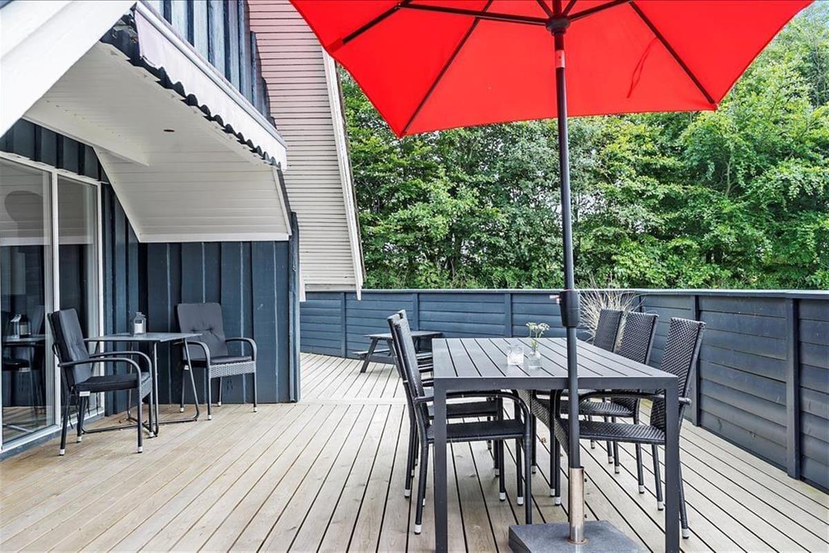 Eine schöne und abgeschirmte Holzterrasse erstreckt sich direkt vor dem Wohnraum, sodass Sie bei schönem Wetter leicht hinaus ins Freie treten können. Ergänzend bietet sich Ihnen auch ein gepflasterter Terrassenbereich in der Nähe des Hauses. Sie genießen daher die freie Wahl, welchen sonnenverwöhnten Aufenthaltsplatz Sie gerade bevorzugen. Liegestühle, Gartenmöbel und ein Grill stehen selbstverständlich zu Ihrer Verfügung. Gleiches gilt für ein Spielgerüst und eine Sandkiste, über die sich die jüngsten Familienmitglieder sicherlich besonders freuen werden. Die Grasfläche wird Jung und alt gleichermaßen zu vergnüglichen Gartenspielen wie Wikingerschach animieren. Der gesamte Garten ist eingezäunt - ein Umstand, den sicherlich insbesondere Hundebesitzer und Eltern mit abenteuerlustigen Kleinkindern sehr zu schätzen wissen werden.