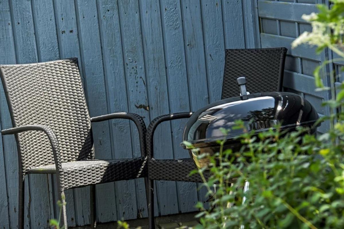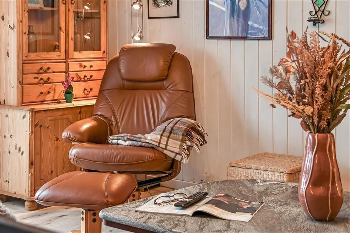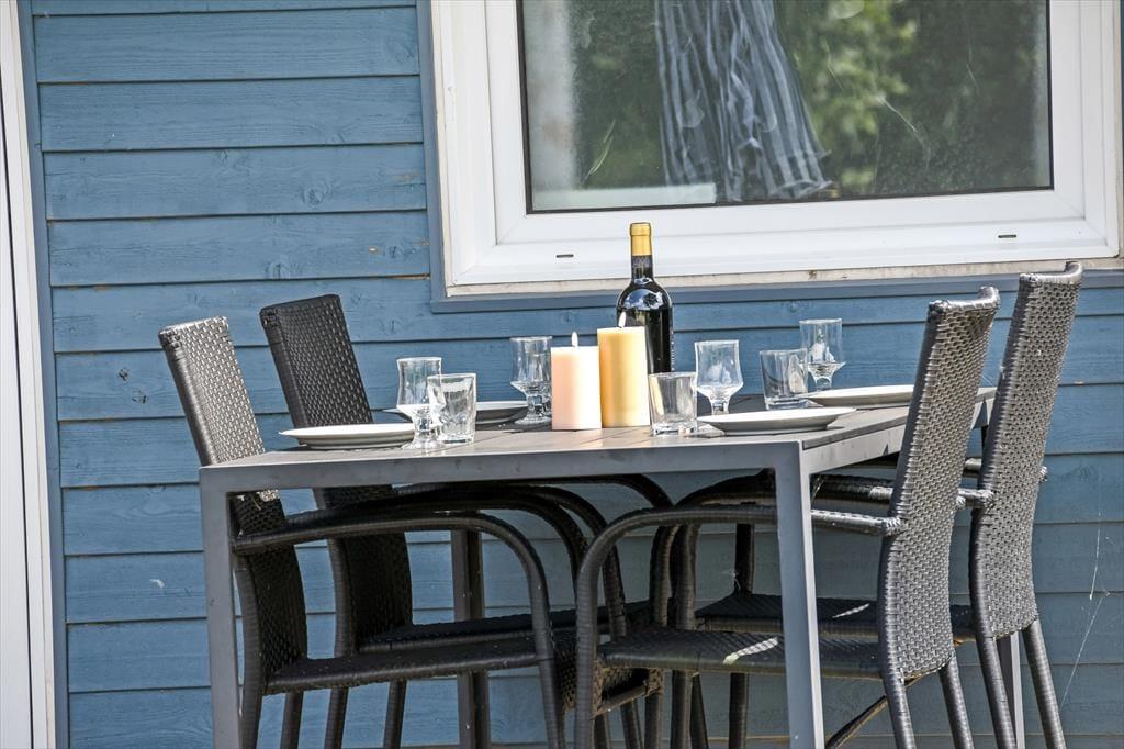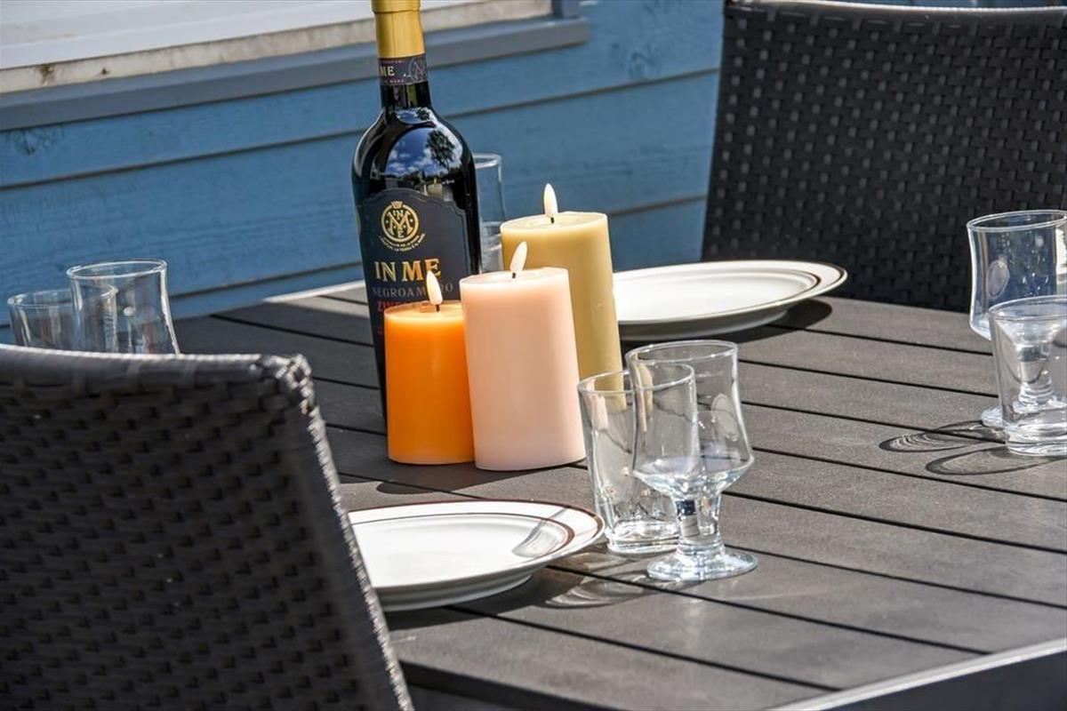 Auf dem Ferienhausgrundstück treffen Sie auf ein Carport und auf eine Grasfläche, die zum Umhertollen und zu Ballspielen einlädt. Völlig entspannt geht es hingegen auf der 20 m² großen Holzterrasse zu, auf der Gartenmöbel, Liegestühle und ein Grill zum gemütlichen Stunden und zu geselligen Runden einladen. Alternativ gibt es auch stets den schönen Balkon des Obergeschosses. Dieser ist ebenso wie die Terrasse schön zur Sonne hin ausgerichtet und verwöhnt zusätzlich mit einem Blick über den Fjord.