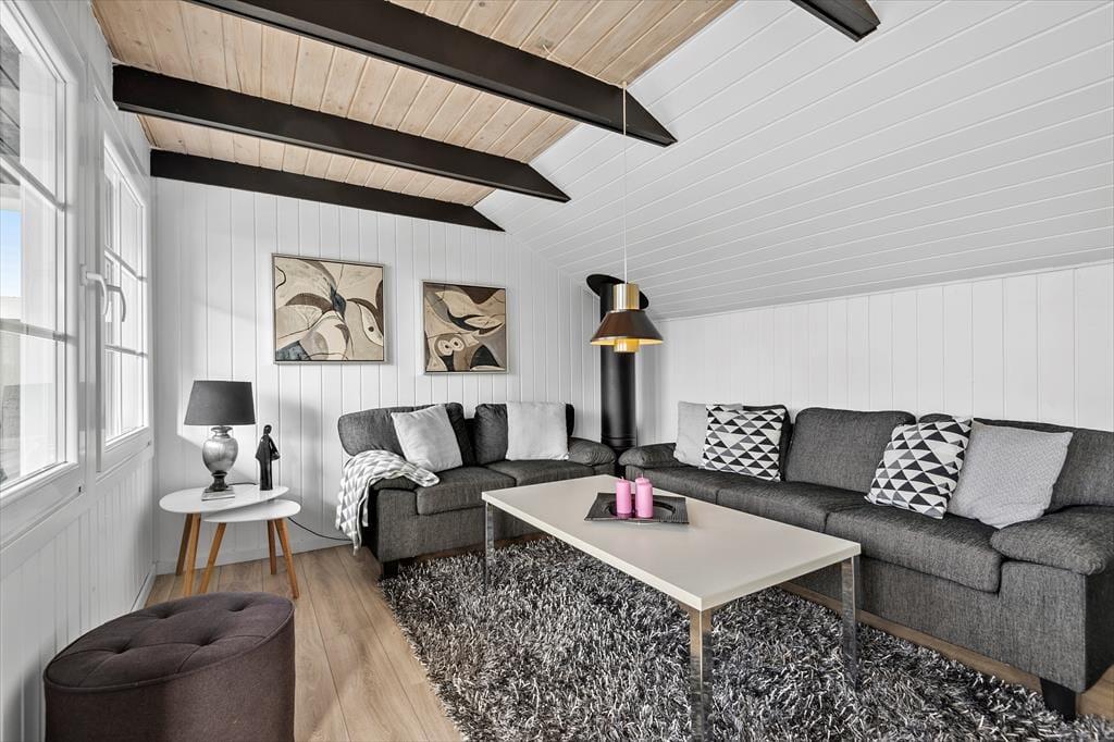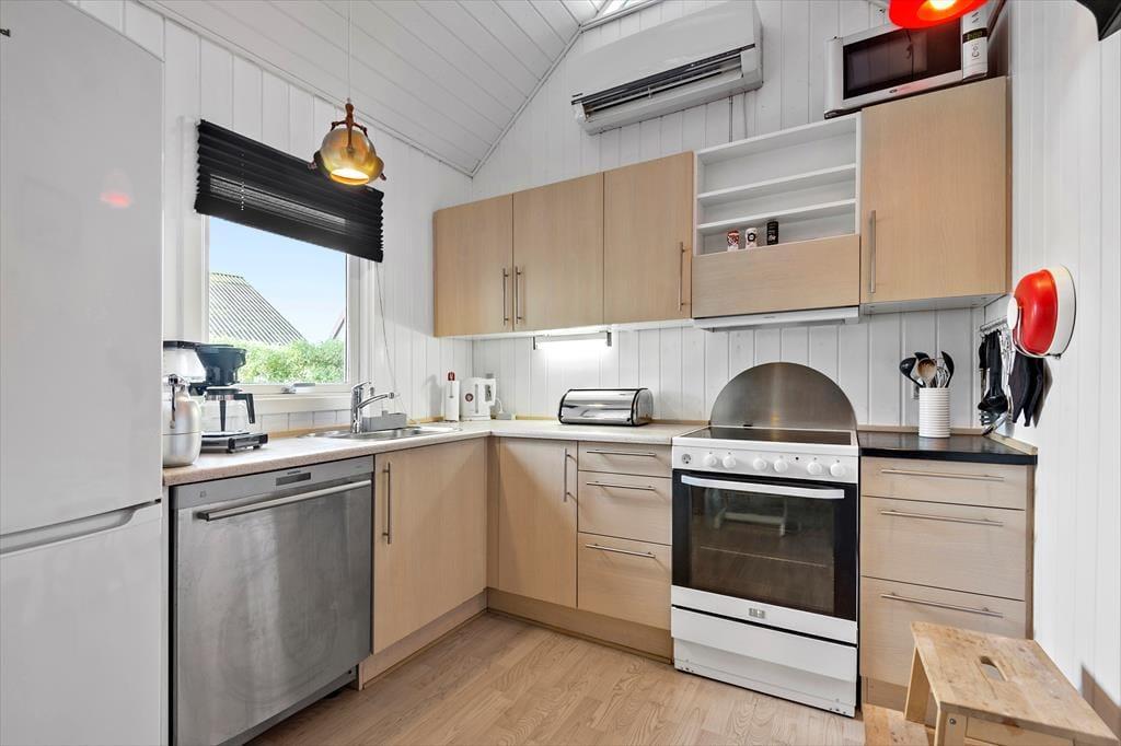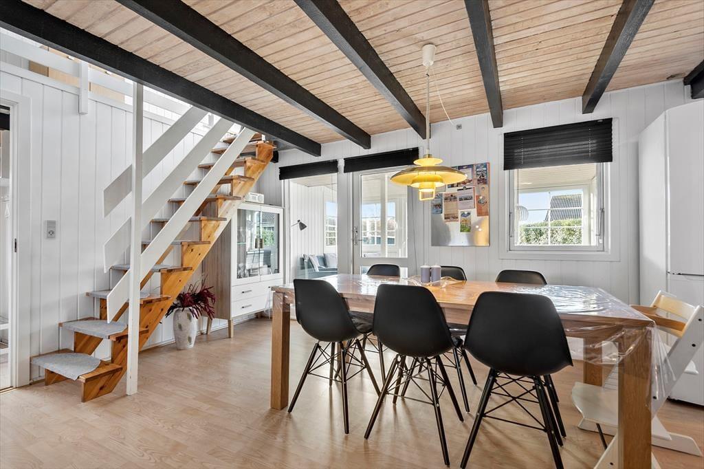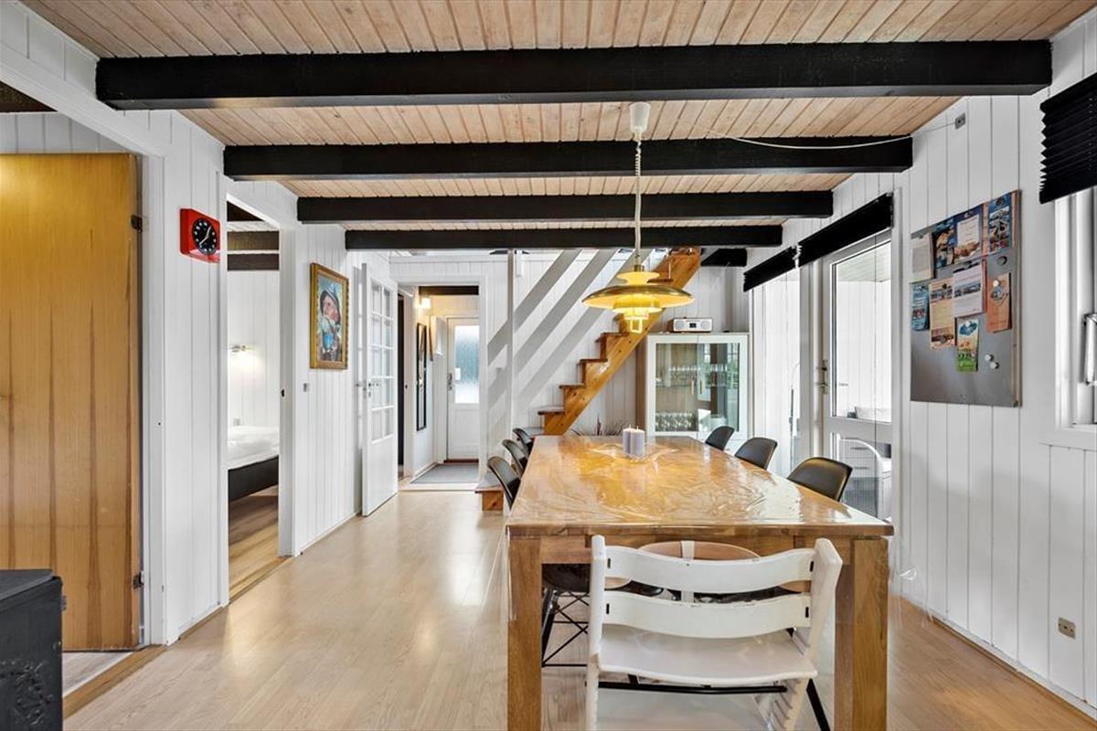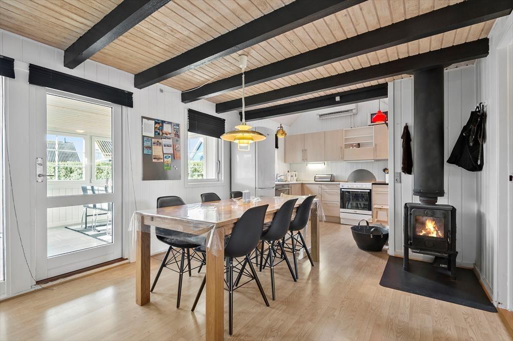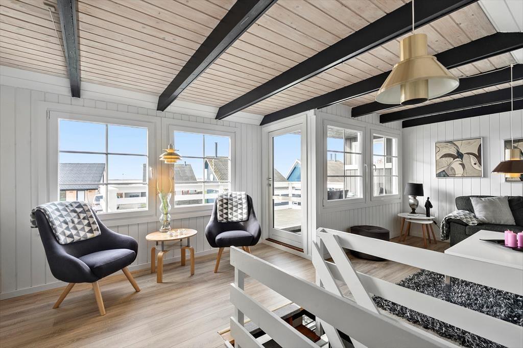 Das Ferienhaus misst 78 m² und wurde zuletzt im Jahr 2016 renoviert, wobei die Zimmer in schlichten Farbtönen und mit schönem Interieur gestaltet wurden. In der Wohnküche im Erdgeschoss trägt ein klassischer Kaminofen zur gemütlichen Atmosphäre bei und der angrenzende Wintergarten lädt bei Sonnenschein zum Verweilen ein. Ein Badezimmer mit Dusche ist Teil des Erdgeschosses, und hier finden Sie auch drei Schlafzimmer, von denen zwei über ein Doppelbett und das dritte über ein Etagenbett verfügen. Im Untergeschoss gibt es demnach ausreichend Schlafplätze für alle, aber Kinder finden es vielleicht gemütlich, in der Nische im ersten Stock zu schlafen – die tagsüber auch gut als Spielecke funktioniert. Auch die Erwachsenen können sich es sich im ersten Stock, der eine gemütliche Sofaecke mit Fernseher bietet, gemütlich machen.