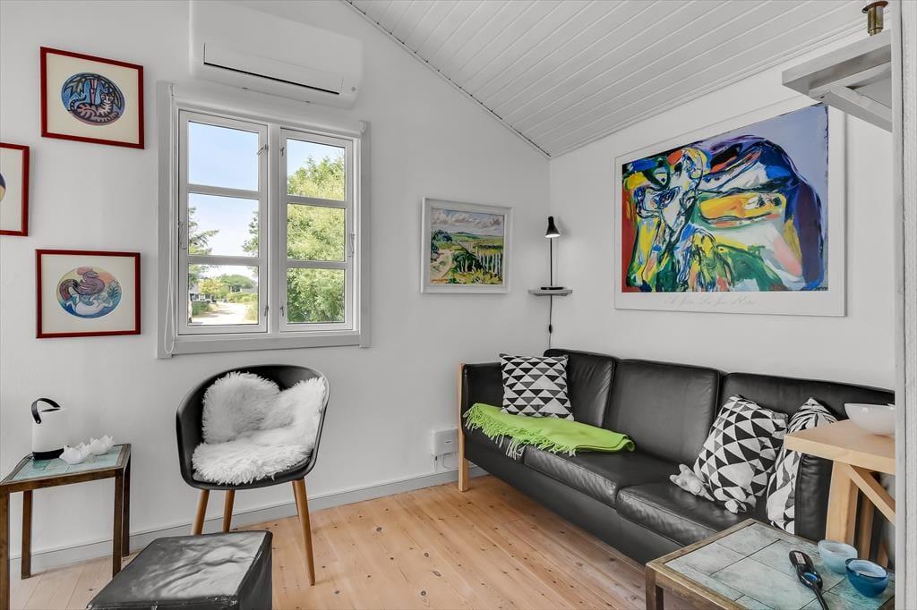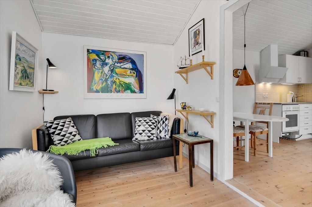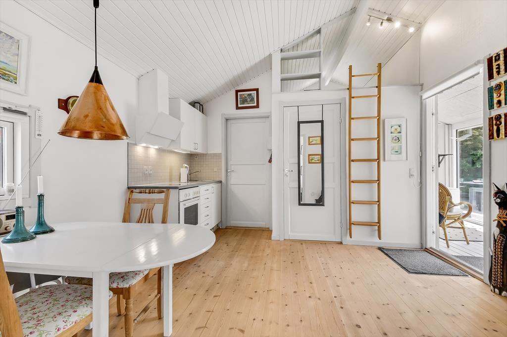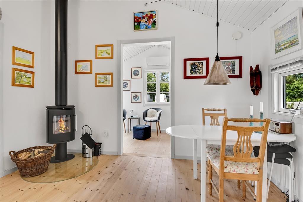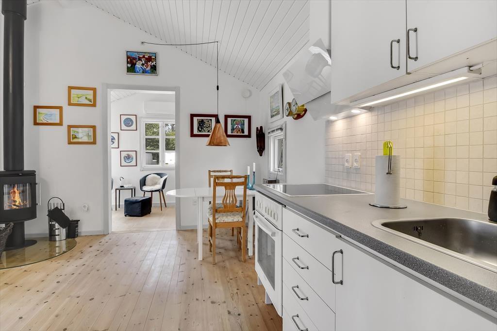 Die Einrichtung des Ferienhauses ist einfach, gemütlich und schafft sofort eine warme Atmosphäre, in der du dich wie zu Hause fühlst. Die großen Fenster sorgen den ganzen Tag für ein wunderbares Licht, und im Wohnzimmer kannst du dich mit deinen Liebsten um den Esstisch versammeln oder dich auf dem Sofa vor dem Fernseher entspannen. Der Kamin verbreitet an kühleren Tagen eine behagliche Wärme, und die offene Küche, die mit dem Wohnzimmer verbunden ist, macht es leicht, Mahlzeiten zuzubereiten, während du weiterhin Teil der Gemeinschaft bleibst. Mit Schlafplätzen, die sich im Schlafzimmer und einem gemütlichen Schlafbereich auf dem Dachboden befinden, ist für Entspannung für Groß und Klein gesorgt.