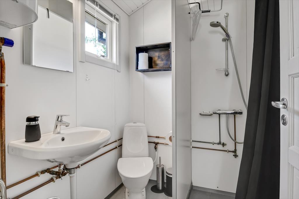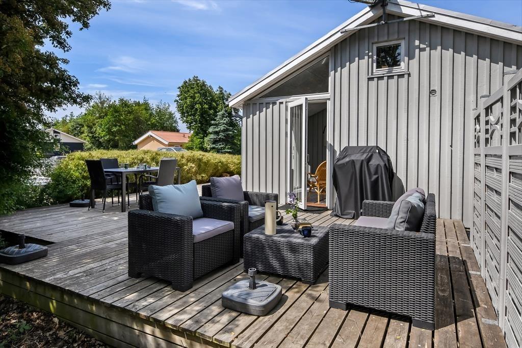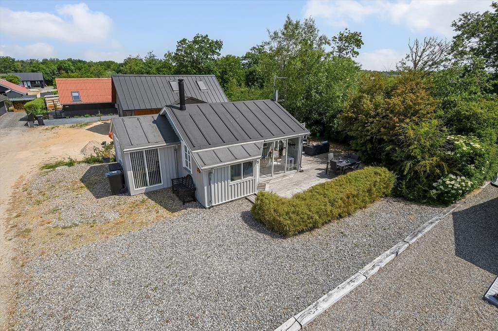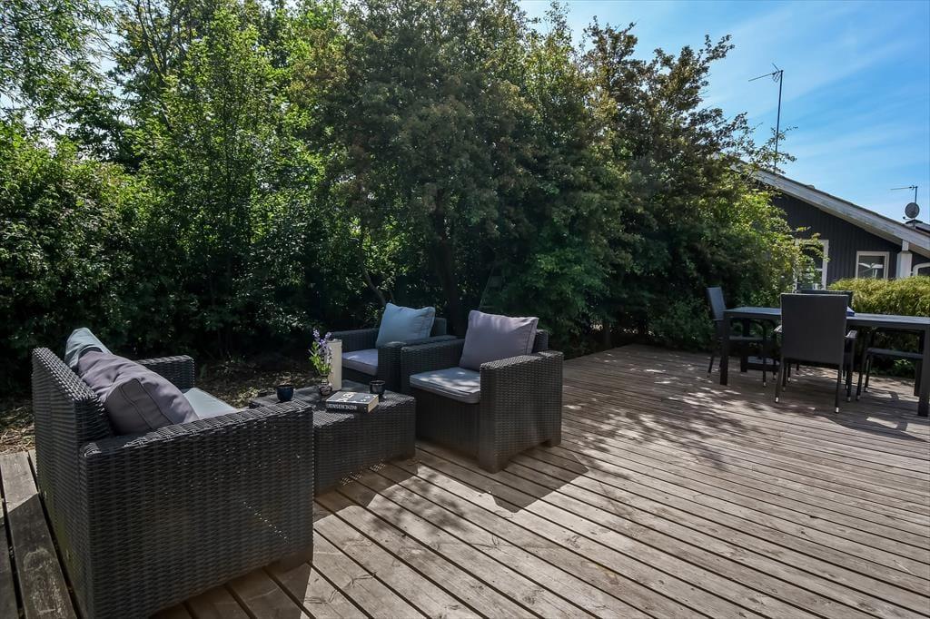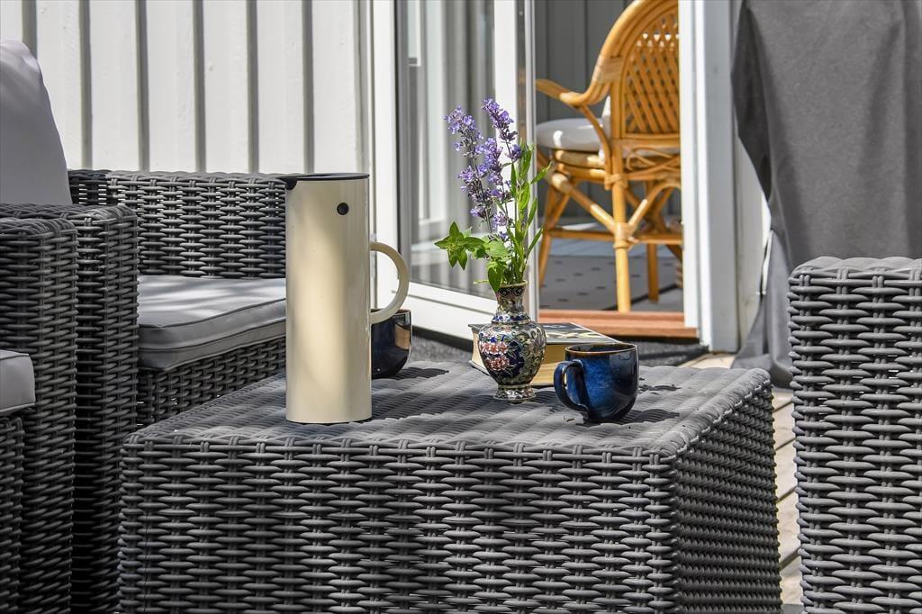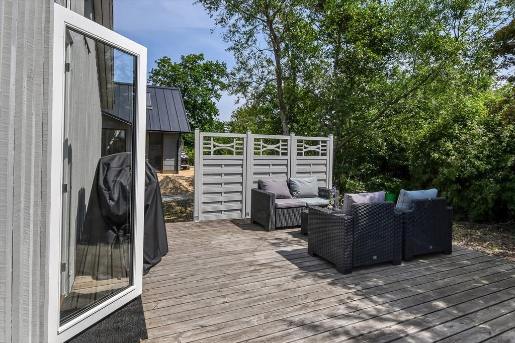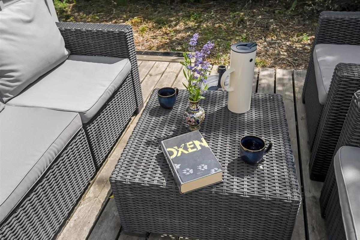 Draußen kannst du den Tag in deinem eigenen Tempo auf der gemütlichen, abgeschirmten Terrasse verbringen. Hier kannst du den Morgen mit einer Tasse Kaffee beim Sonnenaufgang beginnen und die Ruhe des Tages auf dich wirken lassen. Der Garten ist grün und geschützt, perfekt zum Spielen oder Entspannen, während du das schöne Wetter genießt. Es gibt genügend Platz, damit der Hund herumtollen kann, und der Garten lädt nach einem Tag am Fjord zu gemütlichen Grillabenden mit der Familie ein. Die Umgebung strahlt Ruhe aus, und du kannst leicht ein schattiges Plätzchen finden, um ein Buch zu lesen oder einfach die Stille um dich herum zu genießen.