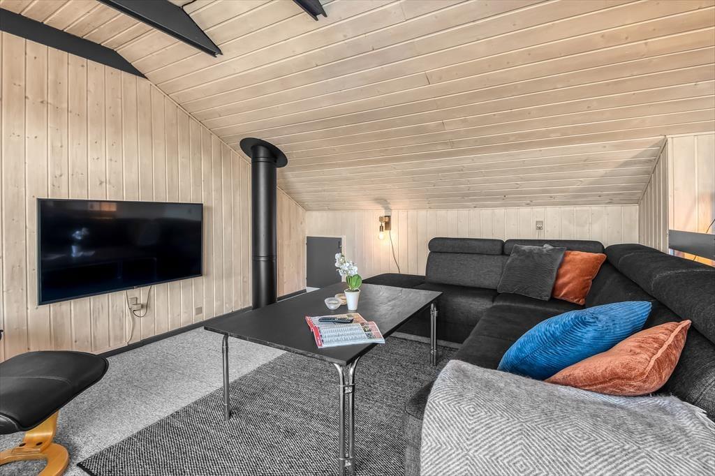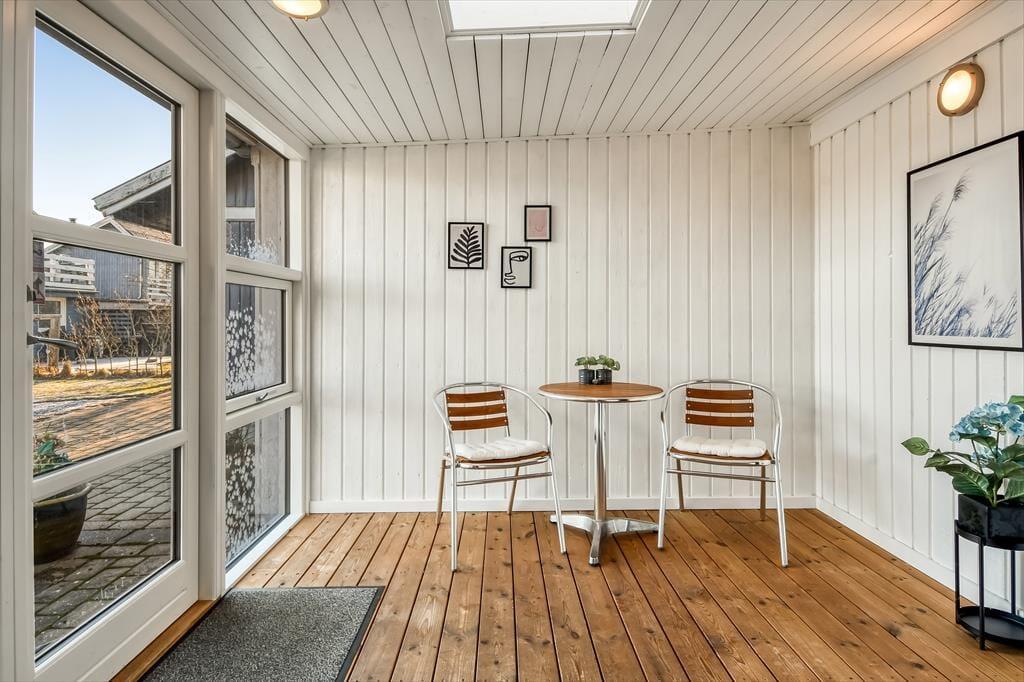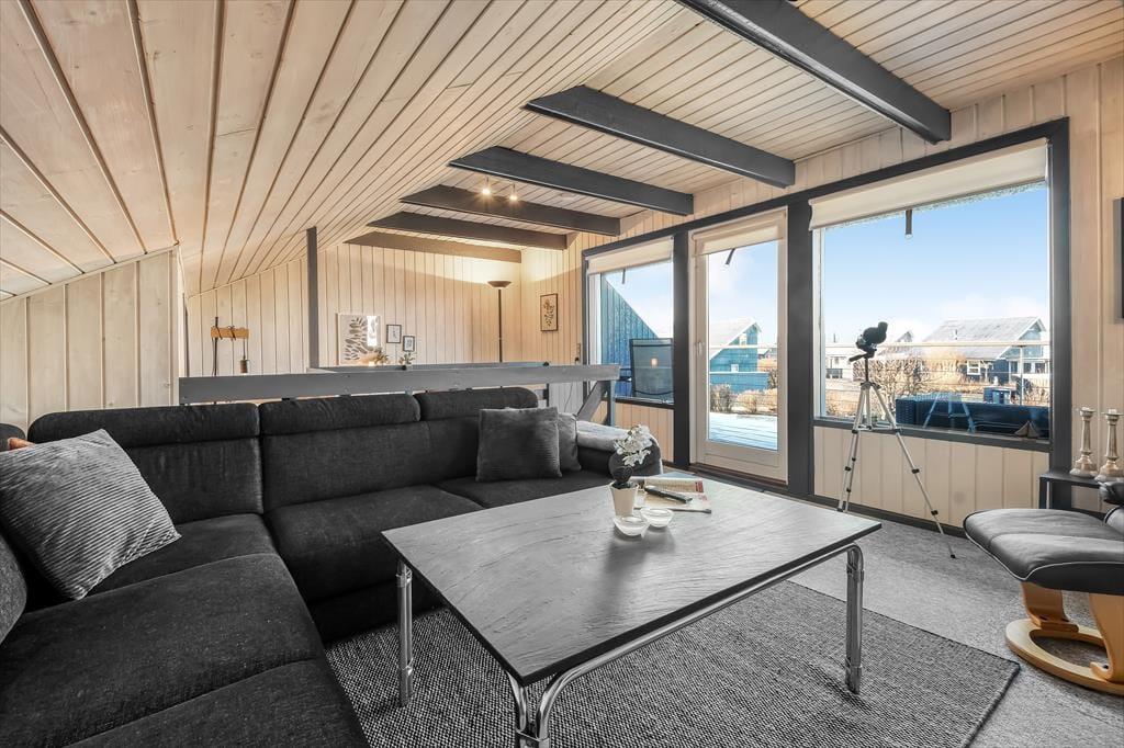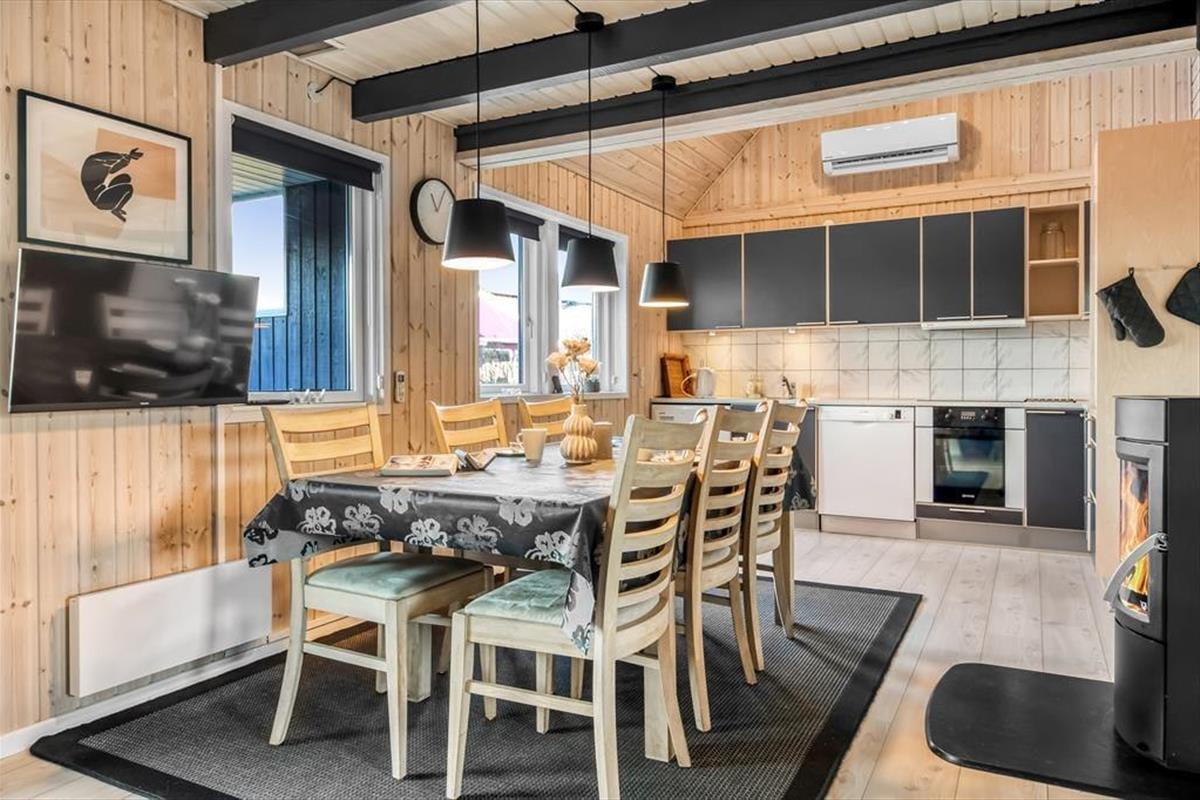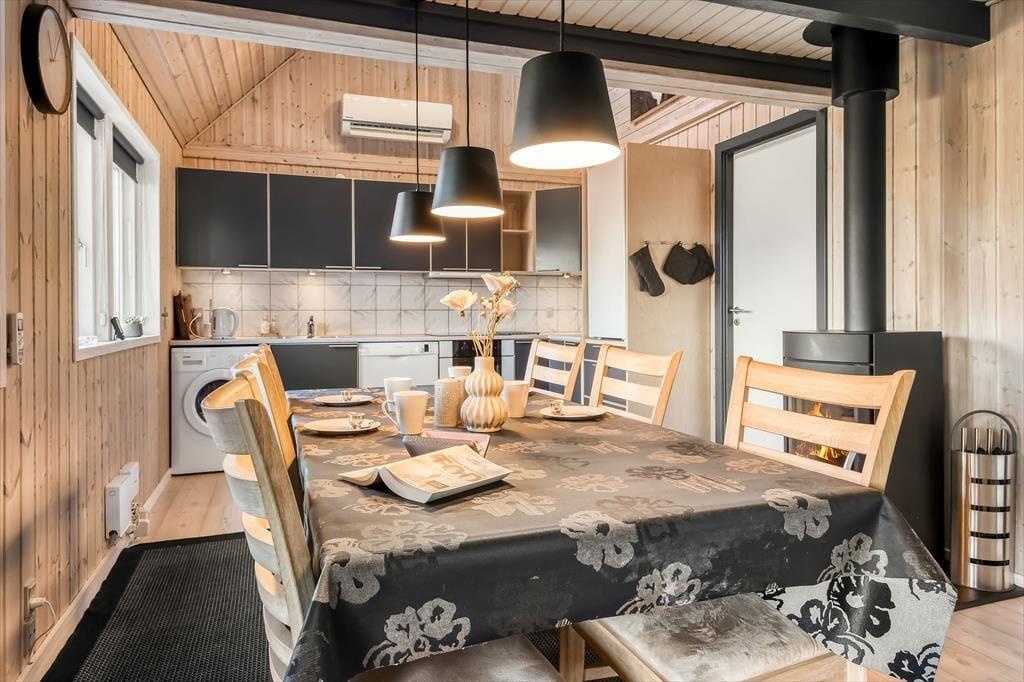 Schon beim Betreten des Hauses spüren Sie die Wärme und Persönlichkeit des Hauses. Dieses Haus ist nicht nur „eins in einer Reihe“, sondern eines, das über die Jahre hinweg mit Liebe gefüllt wurde. Treffpunkt im Erdgeschoss ist das Wohnzimmer, das mit der Küche verbunden ist. Hier finden Sie alle praktischen Dinge, die Sie zum Kochen und Wäschewaschen benötigen – aber auch jede Menge Gemütlichkeit herrscht hier, denn das Haus verfügt über einen schönen Holzofen in der Mitte des Raumes, perfekt, wenn Sie nach dem Essen noch am Tisch bleiben und vielleicht etwas spielen möchten. Oder Sie gehen direkt auf die teilweise überdachte Terrasse, wo Sie bei schönem Wetter natürlich auch das Essen und die Gesellschaft genießen können. Im Erdgeschoss finden Sie außerdem alle Schlafzimmer, die jeweils Platz für zwei Personen bieten. Hier befindet sich auch das Badezimmer des Hauses sowie ein schöner, nach Osten ausgerichteter Wintergarten und ein Abstelölraum mit Platz für alle praktischen Dinge. Im 1. Stock des Hauses ist das Wohnzimmer mit schönen Möbeln ausgestattet – und einem fantastischen Blick auf den Fjord. Selbstverständlich lässt sich dies auch vom Balkon aus genießen, denn die Aussicht ist nach Westen ausgerichtet, sodass Sie den berühmten Sonnenuntergang über der Nordsee genießen können, ohne dafür fahren zu müssen.