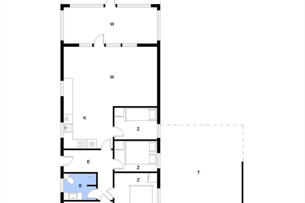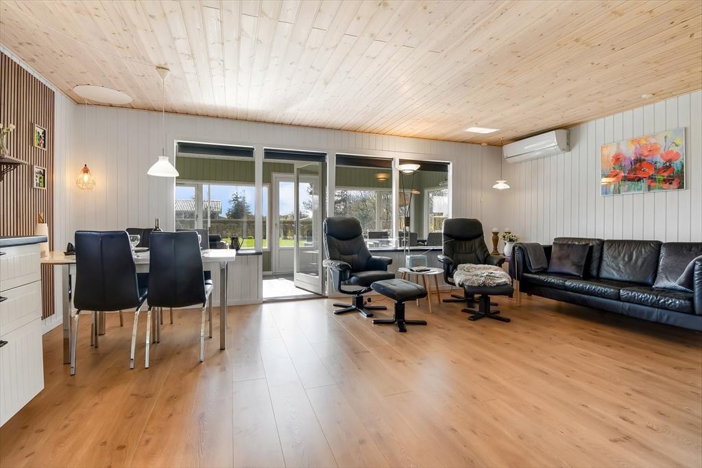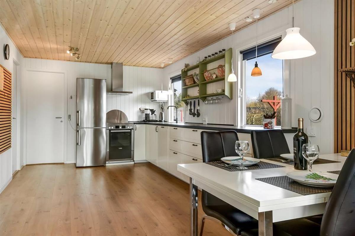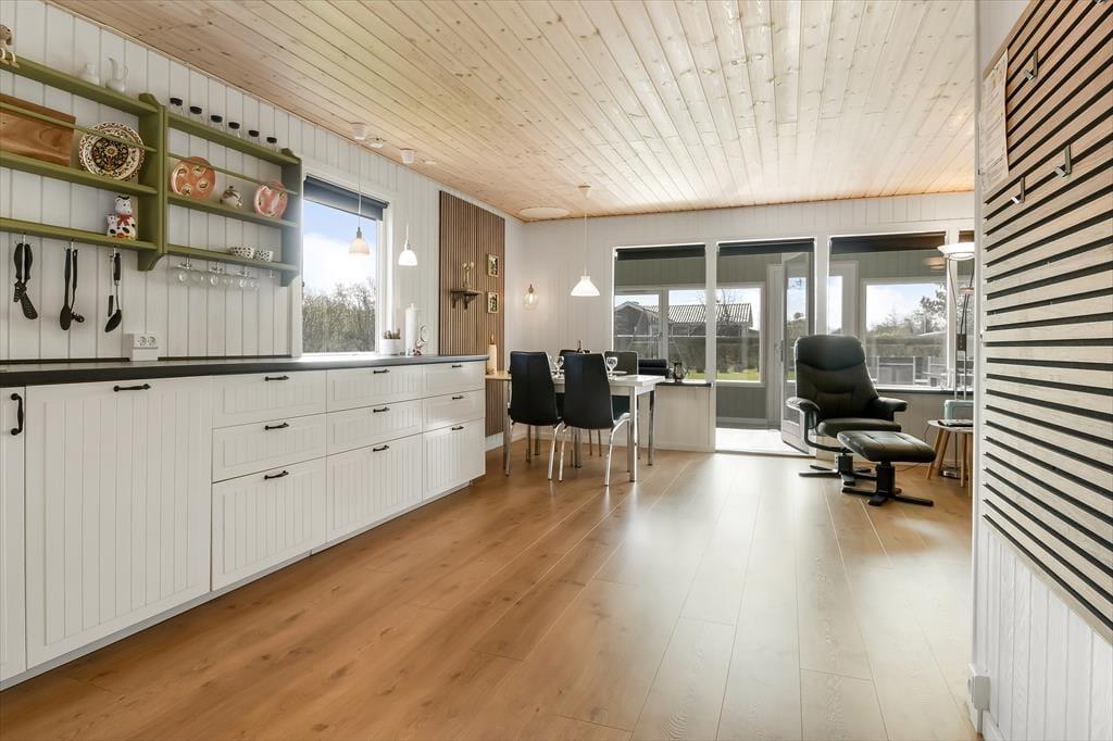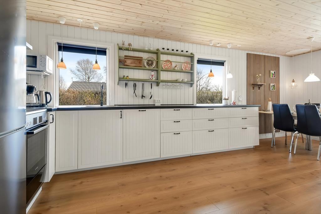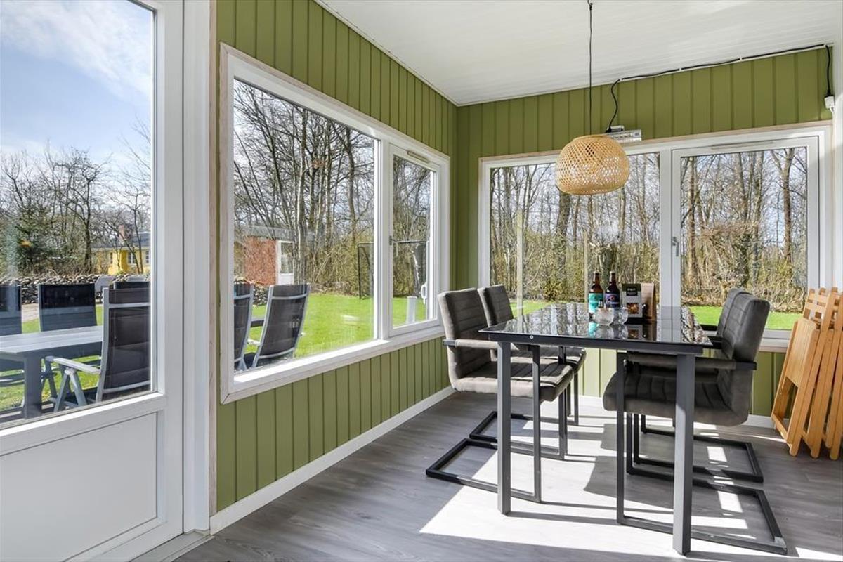 Es ist nicht nur die schwarze Holzfassade, die hier an der Adresse dafür sorgt, dass eine klassische, dänische Ferienhausatmosphäre herrscht. Im Inneren der Türen ist die Atmosphäre hell und freundlich, und die Räume laden zum Wohlfühlen ein – zum Beispiel in den drei Schlafzimmern und natürlich auch im gut ausgestatteten Wohnzimmer, in dem Wohnzimmer und Küche vereint sind. Der angrenzende Wintergarten kann an Tagen oder Abenden, an denen die Sonne scheint, ein dringend benötigter Hit sein. Und wenn es Ihnen zum Sitzen trotzdem zu heiß wird, können Sie die Gartentür öffnen, sodass Sie freien Durchgang zur Terrasse haben. Im Nebengebäude gibt es ein bequemes Sofa, und wenn Sie große Kinder oder Teenager in der Familie haben, denken diese vielleicht, dass es perfekt ist, einen privaten Rückzugsort zum Entspannen zu haben.