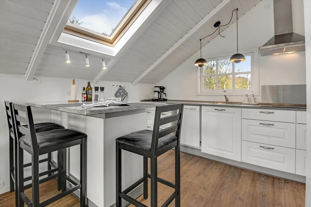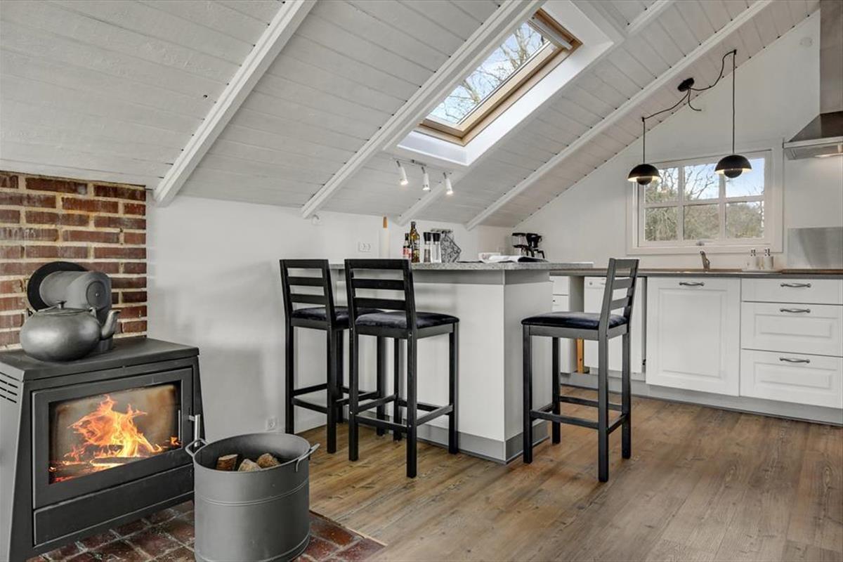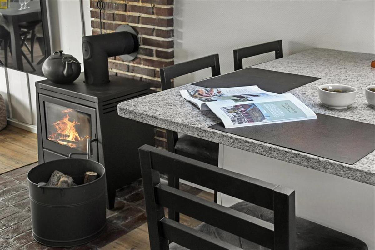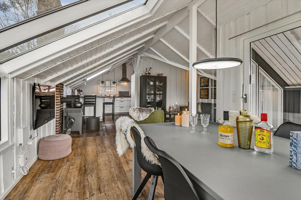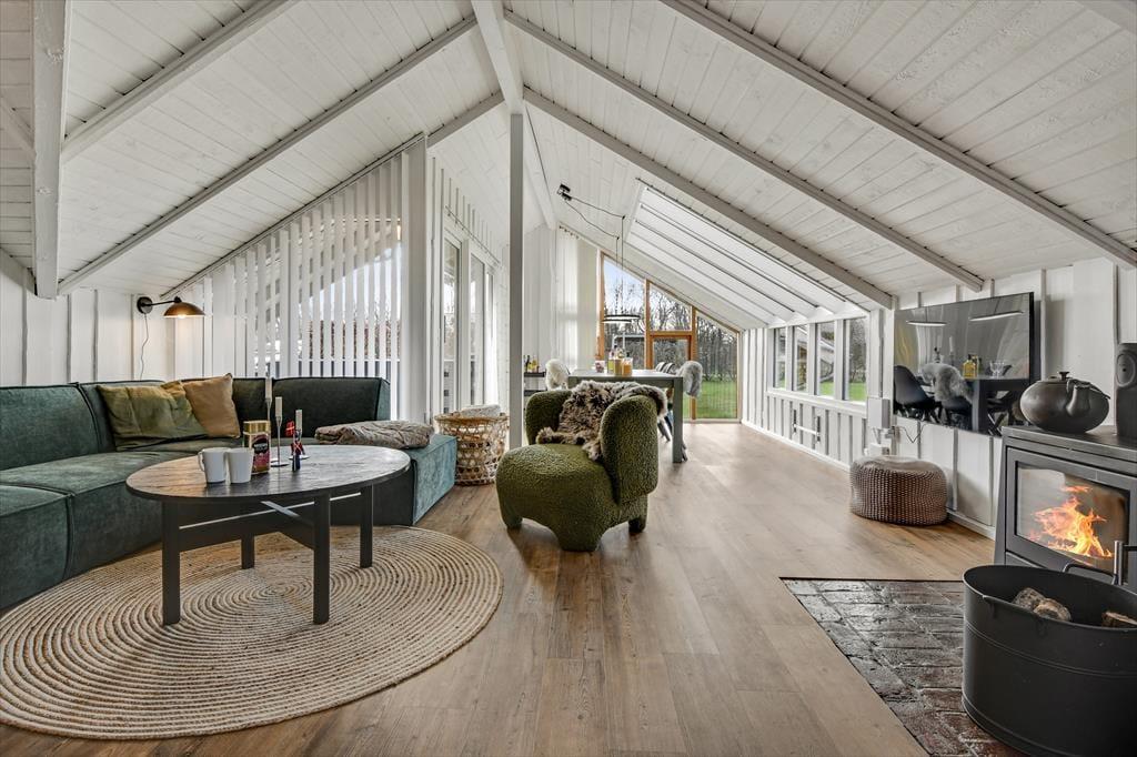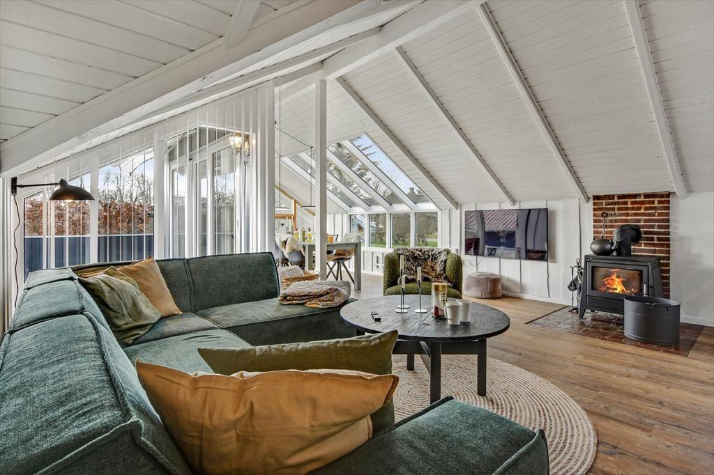 Dank der großen Fensterfront des Wohnzimmers, die bis unter das Dach reicht, können Sie vom Esstisch aus Sonne tanken und den Blick in den Garten werfen. Mit anderen Worten: Es ist ein wirklich schöner Ort zum Verweilen, egal ob Sie in Ruhe Zeitung lesen und Kaffee trinken, mit der Familie plaudern oder ein leckeres Essen mit Ihrem Partner teilen möchten. Auch die Sofaecke im Wohnzimmer lädt zum Entspannen ein – zum Beispiel bei einem Feuer im Holzofen und einem guten Film auf dem Flachbildschirm – und wenn man gerne kocht, lässt es sich hier wunderbar austoben in der offenen Küche. Ein Badezimmer und ein Schlafzimmer gehören zum Grundriss des Ferienhauses, außerdem gibt es im Nebengebäude zwei weitere Schlafzimmer, so dass Sie hier bis zu sechs Personen unterbringen können.