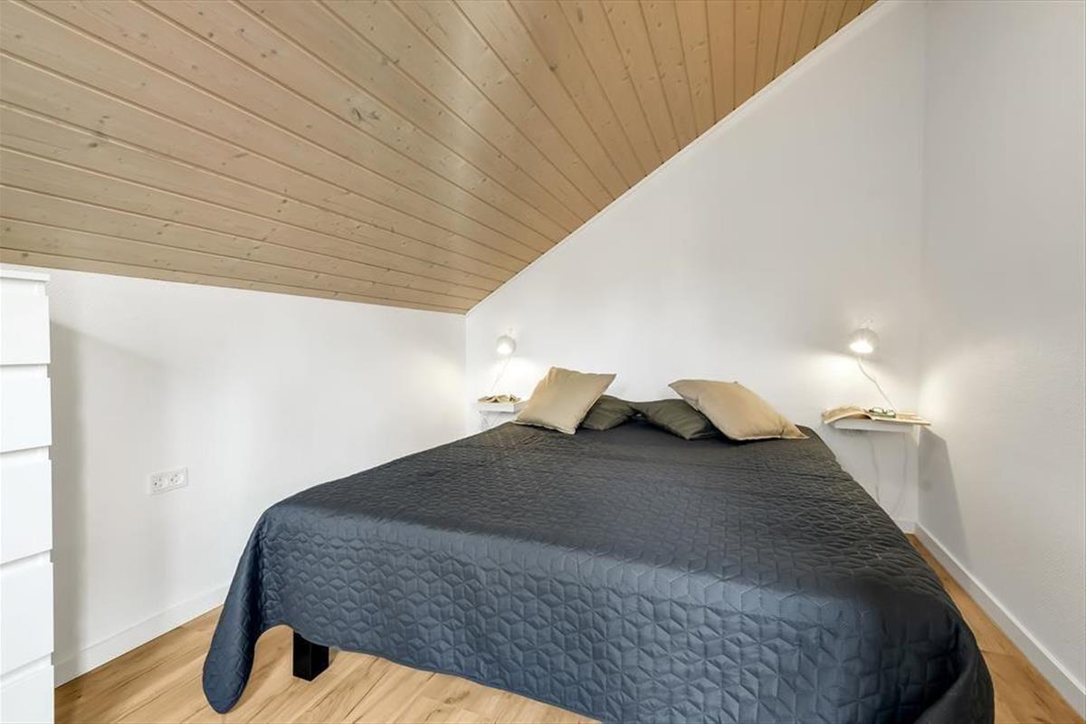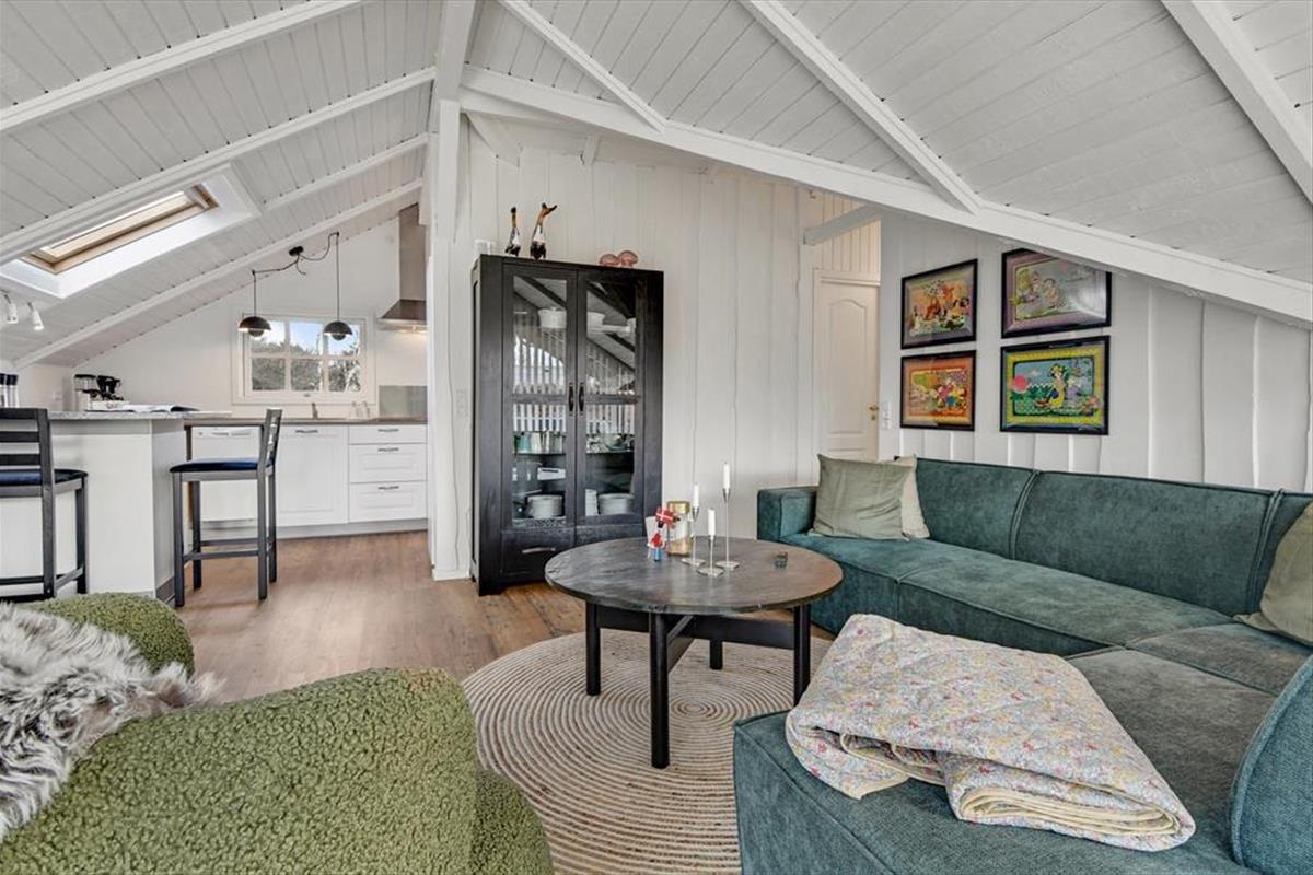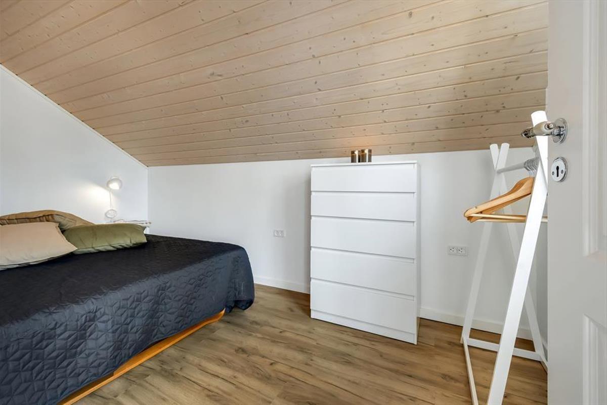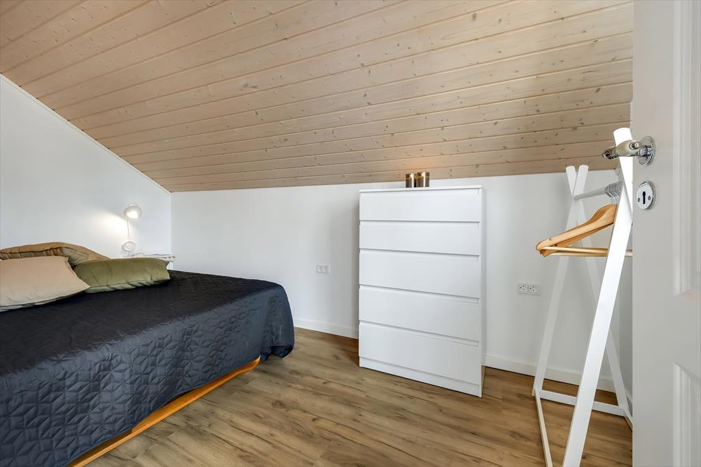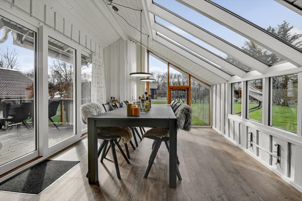 Dank der großen Fensterfront des Wohnzimmers, die bis unter das Dach reicht, können Sie vom Esstisch aus Sonne tanken und den Blick in den Garten werfen. Mit anderen Worten: Es ist ein wirklich schöner Ort zum Verweilen, egal ob Sie in Ruhe Zeitung lesen und Kaffee trinken, mit der Familie plaudern oder ein leckeres Essen mit Ihrem Partner teilen möchten. Auch die Sofaecke im Wohnzimmer lädt zum Entspannen ein – zum Beispiel bei einem Feuer im Holzofen und einem guten Film auf dem Flachbildschirm – und wenn man gerne kocht, lässt es sich hier wunderbar austoben in der offenen Küche. Ein Badezimmer und ein Schlafzimmer gehören zum Grundriss des Ferienhauses, außerdem gibt es im Nebengebäude zwei weitere Schlafzimmer, so dass Sie hier bis zu sechs Personen unterbringen können.