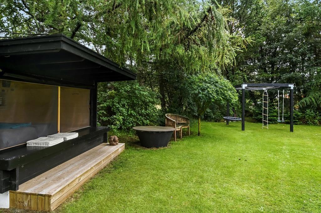 Auch im Außenbereich bietet das Ferienhaus viel Platz für Groß und Klein. Der große Garten, der von großen Bäumen umgeben ist, hat trotz dieser Bäume den ganzen Tag über viel Sonne. Es gibt sowohl ein schönes und gut ausgestattetes Miethaus als auch eine Schaukel mit normaler und Spinnenschaukel, ein Klettergerüst und einen Sandkasten. Groß und Klein können auch in der Windschtzhütte im hinteren Teil des Gartens ein Mittagsschläfchen genießen oder bei entsprechender Temperatur natürlich auch draußen übernachten. Rund um das Haus finden Sie außerdem zwei große Terrassen, beide mit Gartenmöbeln und einem Grill, sodass geselliges Beisammensein, Essen oder Entspannen an der Tagesordnung sein können.