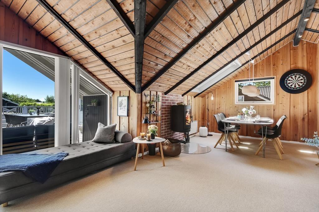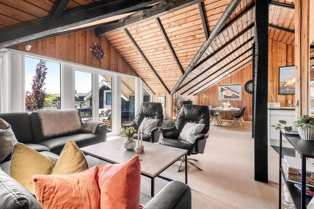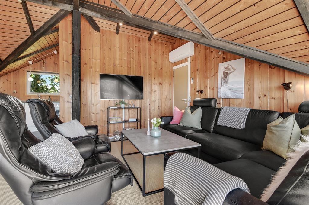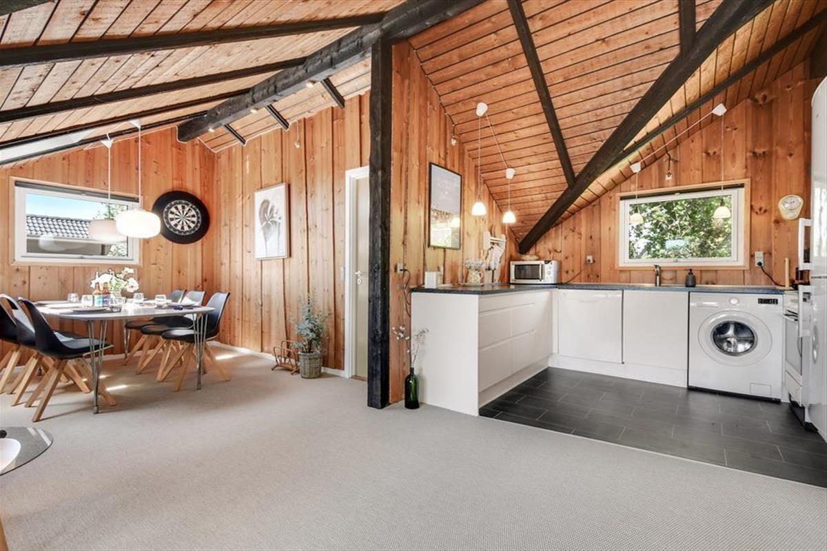Unmittelbar nach deiner Ankunft wirst du dich bei diesem Ferienhaus - drinnen wie draußen - heimisch und wohlfühlen. Dein Ferienhaus ist der Inbegriff klassisch dänischer Ferienhausatmosphäre. Herzstück deines Urlaubsdomizils ist der geräumige Aufenthaltsbereich, der sich offen aus dem Wohnraum und der Küche zusammensetzt und mit hohen Decken besticht. Die offene Balkenlage, die Holzvertäfelungen der Wände und die Mauersteinelemente verleihen dem stimmungsvollen, einladenden Raum rustikalen Charme. Du wirst dich zu jeder Zeit bestens erholen und entspannen, ganz gleich, ob du mit deinen Lieben die Mahlzeiten genießt, mit den Kindern auf dem Teppich spielst oder ihr es euch in geselliger Runde in der komfortablen Polstersitzgruppe gemütlich macht. Der Rest der Wohnfläche ist drei Schlafräumen und einem ansprechenden Duschbadezimmer überlassen.