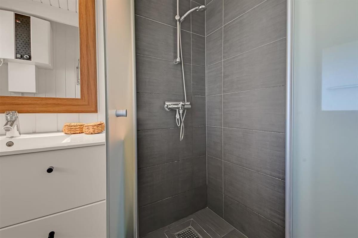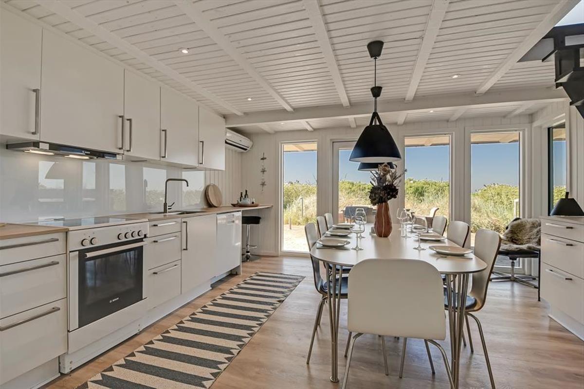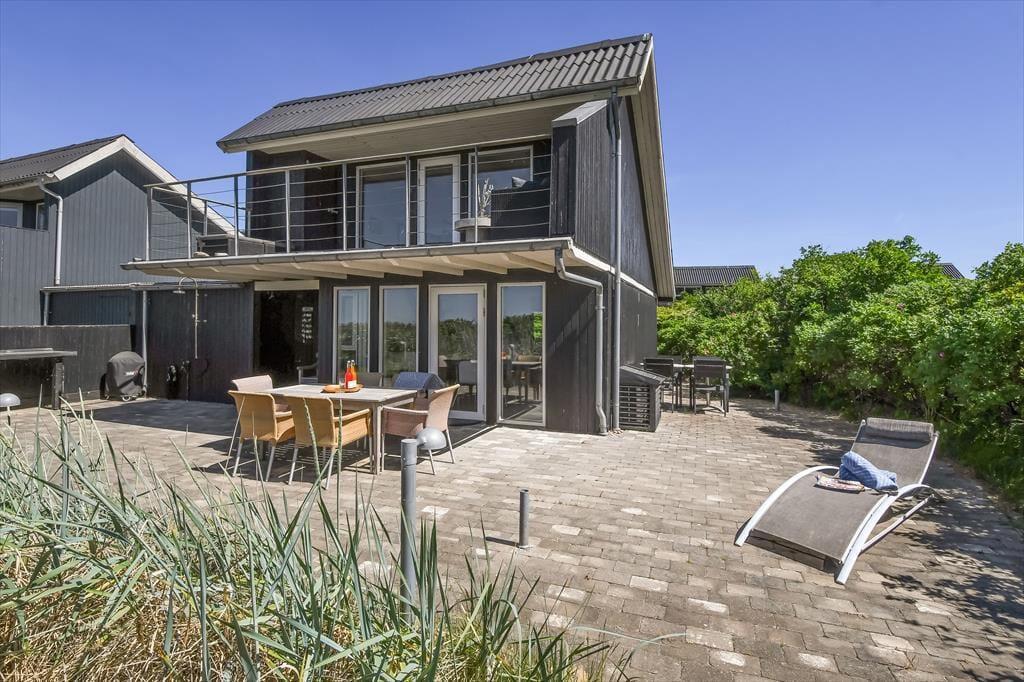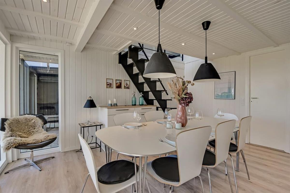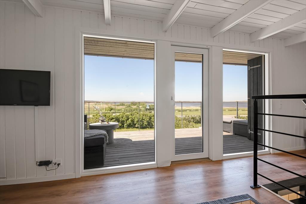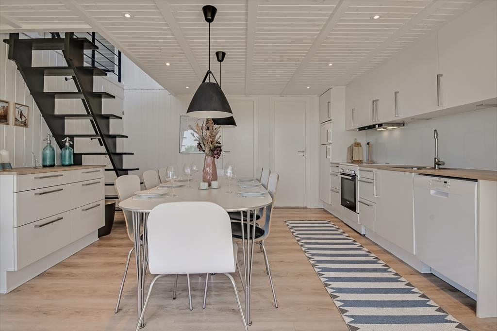Das Haus liegt direkt am Wasser, und die großen Fenster setzen es wunderbar in Szene. Hier spürst du die Nähe zum Wasser, und der Blick aus dem ersten Stock ist besonders beeindruckend. Die Aufteilung schafft einen tollen Rahmen für gemütliche Ferientreffen: Im Erdgeschoss kannst du in einer schönen Wohnküche kochen, wo das Abendessen am großen Esstisch serviert werden kann. Es gibt einen direkten Zugang zur Terrasse, die zu einer natürlichen Erweiterung des Wohnbereichs wird. Das gilt auch für den ersten Stock, wo das gemütliche Wohnzimmer mit einem Alkoven auf eine große, teilweise überdachte Aussichtsterrasse führt. Das Haus verfügt außerdem über drei gute Schlafzimmer und ein schönes Badezimmer.