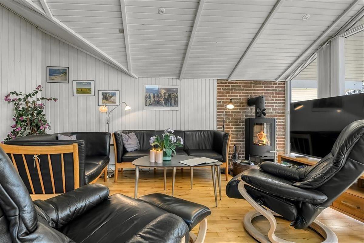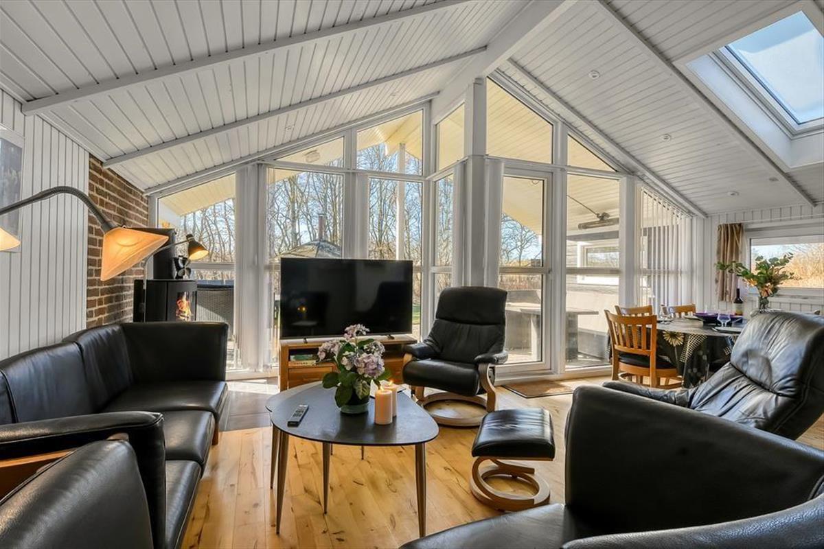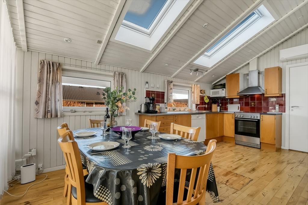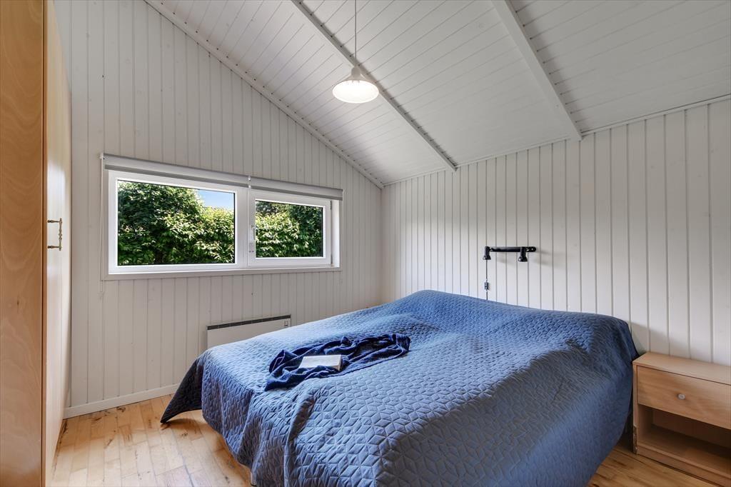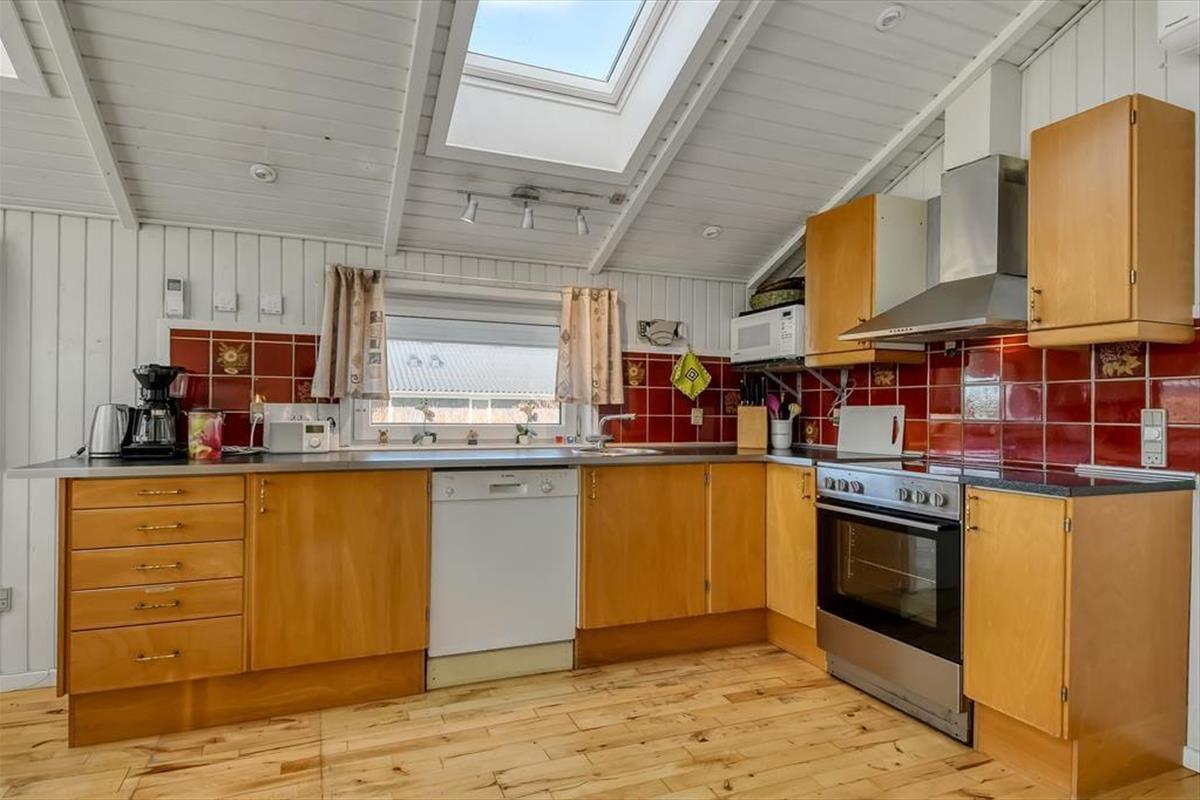 Die durchdachte Raumaufteilung bietet Platz für bis zu acht Personen – zum Beispiel für zwei Familien, oder wenn sowohl Kinder als auch Erwachsene ihre Freunde mit in den Urlaub nehmen möchten. Die vier Schlafzimmer sind paarweise angeordnet, während das Gästebad und das große Badezimmer zentral im Haus verteilt sind. Im großen Badezimmer kannst du im Whirlpool und in der Sauna herrlich entspannen. Wenn sich alle zu Brett- und Ratespielen oder zu einem köstlichen Essen versammeln, findet dies im schönen Wohnbereich statt. Eine gut ausgestattete Küche ist in das Wohnzimmer integriert, welches einen Kaminofen in der Nähe des Sofabereichs, einen gemütlichen Essbereich sowie ein großes Giebelfenster mit Terrassentür bietet.