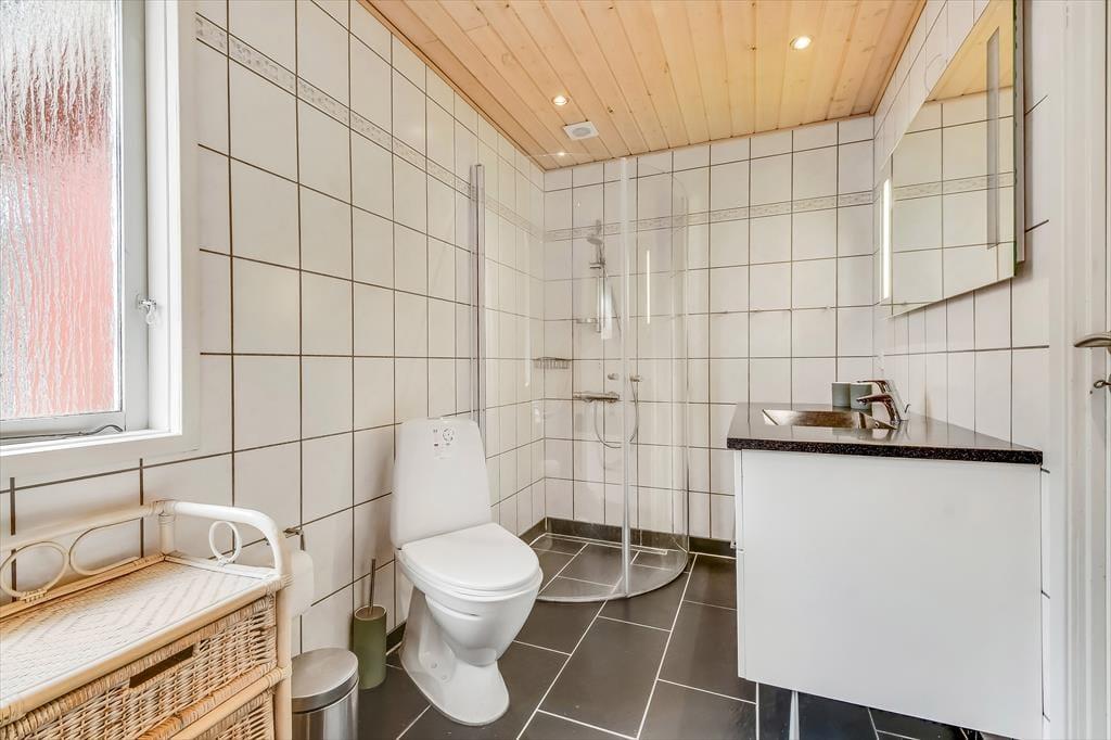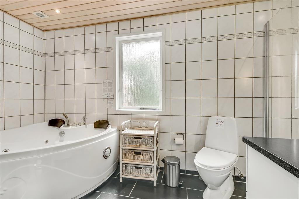 Das Ferienhaus steht seit 1975 in dieser Sackgasse und im Laufe der Zeit wurden mehrere Verbesserungen vorgenommen. So ist das Badezimmer zum Beispiel mit einem Whirlpool und einer Sauna ausgestattet worden, die einen Nachmittag in eine wohltuende Wellness-Stunde verwandeln können. Für Unterhaltung ist mit einem Flachbildfernseher und WLAN gesorgt. Wohnbereich und Küche sind offen miteinander verbunden und nur durch eine halbe Wand getrennt. Mit Kaminofen im Wohnzimmer und einer Terrassentür bietet das Haus Gemütlichkeit, egal bei welchem Wetter. Es gibt drei Schlafzimmer, sodass problemlos bis zu sechs Personen Platz finden. Zwei Hunde sind im Haus ebenfalls willkommen.