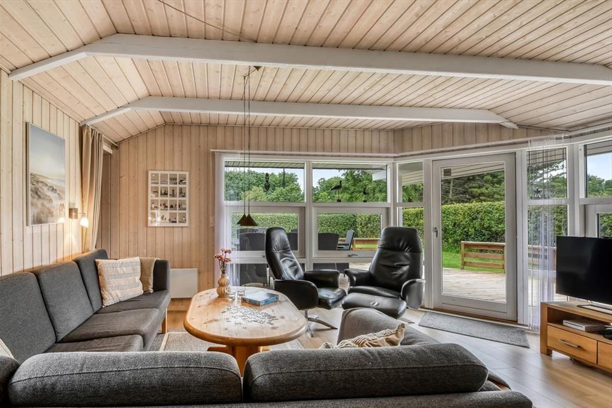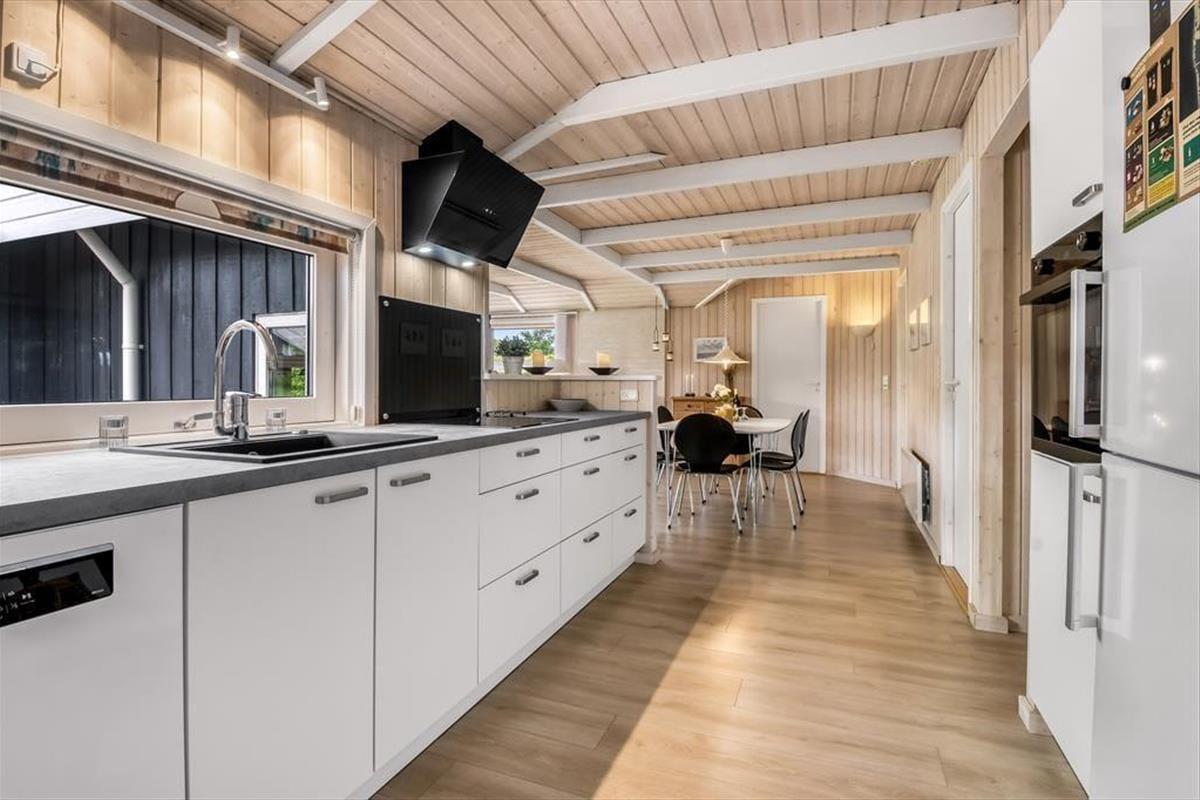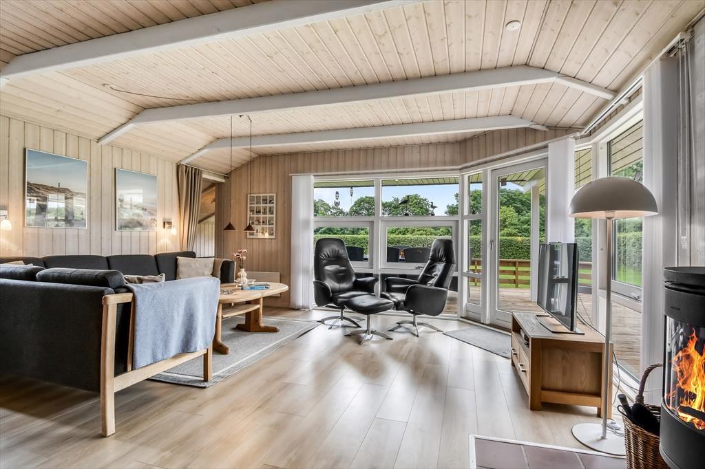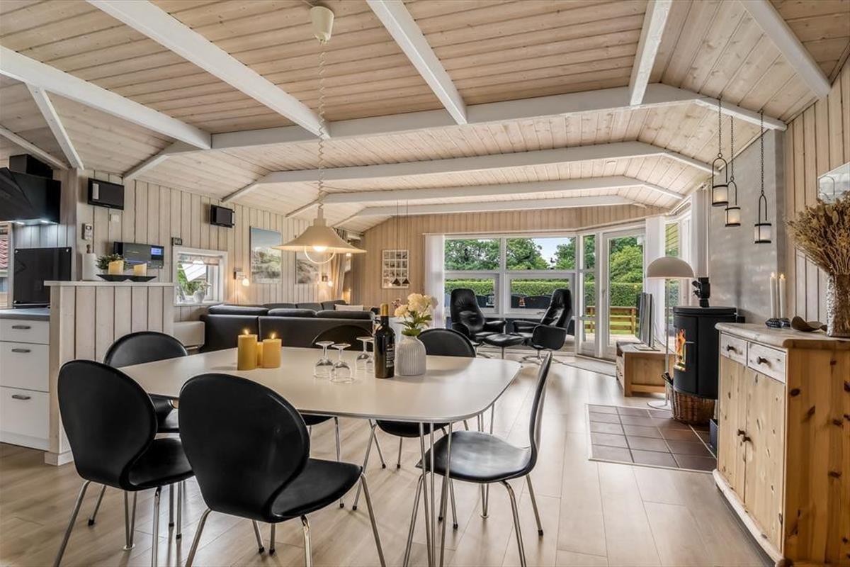 Der geräumige Wohnraum deines Ferienhauses wird im Nu zum bevorzugten Sammelpunkt deiner Lieben avancieren. Groß und Klein genießen hier unabhängig vom Wetter viele gemütliche und gesellige Stunden mit Gesellschaftsspielen, Büchern und gemeinsamen Mahlzeiten am Esstisch. In der kühlen Jahreszeit sorgt ein Kaminofen für behagliche Wärme und ein Maximum an typisch dänischem Ferienhausflair. Die moderne Küche schließt offen an den Wohnraum, sodass du selbst während der Zubereitung der täglichen Mahlzeiten die Nähe und Gesellschaft deiner Mitreisenden genießt. Die kuschelige Schlafnische dient nicht nur als gemütlicher Rückzugsort, sondern auch als Schlafgelegenheit, die zusätzlich zu den drei Schlafräumen zur Verfügung steht. Im größeren der beiden Badezimmer versüßen dir ein Whirlpool und eine Sauna die Abende.