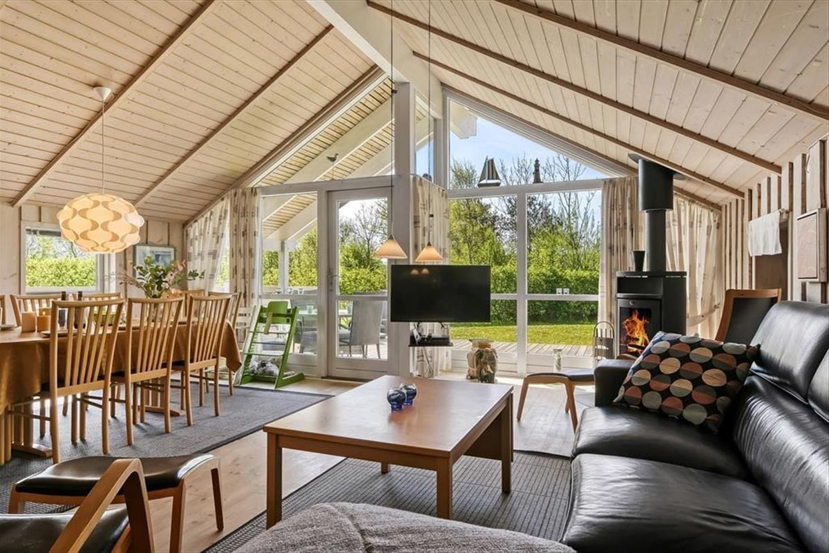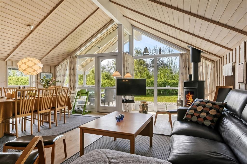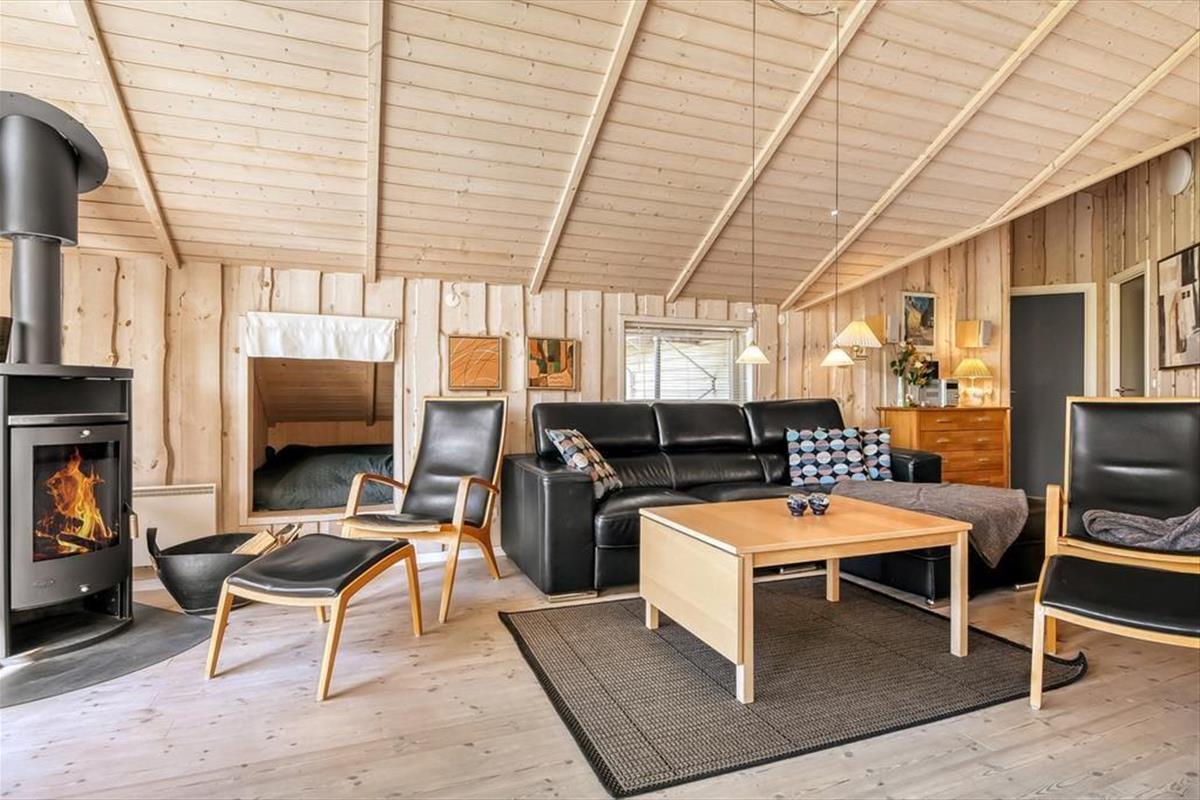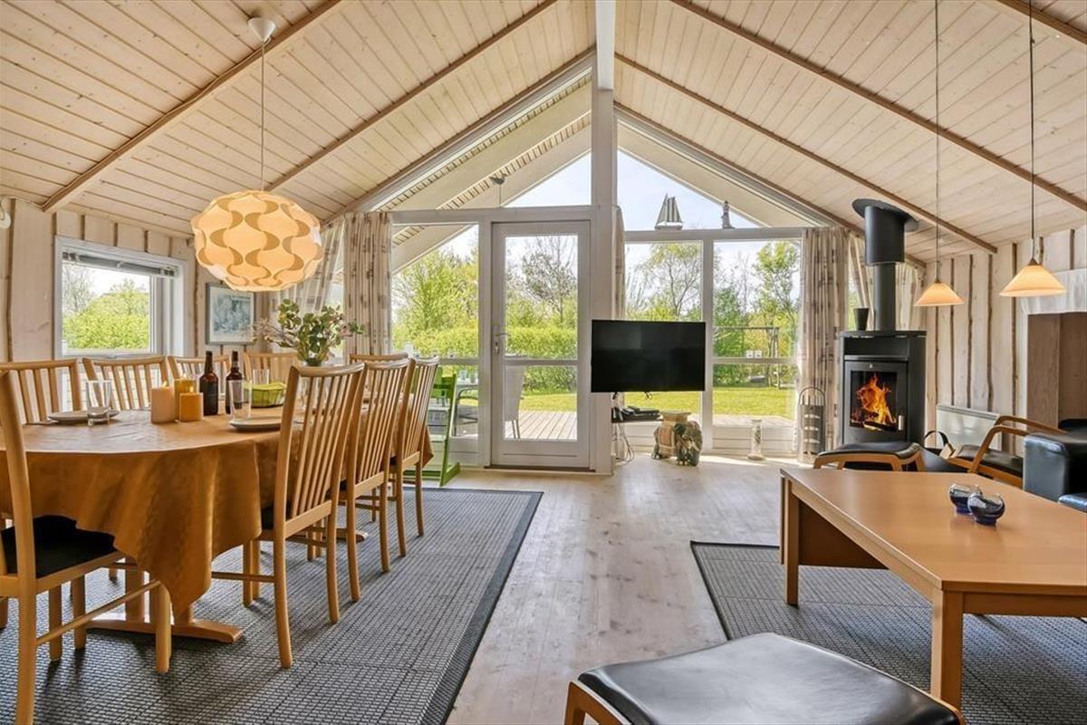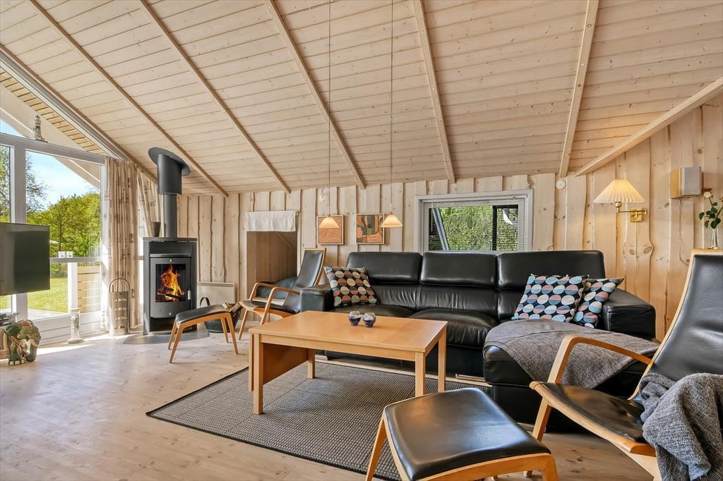 Innen bietet das Ferienhaus die perfekten Rahmenbedingungen für Geselligkeit und gemütliche Momente. Das offene Wohnzimmer mit angrenzender Küche bildet den natürlichen Mittelpunkt, wo du den Tisch fürs Essen decken, dich mit einem guten Buch zurücklehnen oder an kühlen Tagen einfach die Wärme des Kaminofens genießen kannst. Die Fenster lassen das Tageslicht herein und schaffen eine helle, angenehme Atmosphäre, die zur Ruhe und Entspannung einlädt. Die vielen Schlafmöglichkeiten machen es möglich, mit mehreren Personen zu reisen, ohne auf Komfort zu verzichten – und der Grundriss bietet sowohl Privatsphäre als auch Nähe. In dieser heimeligen Umgebung fällt es leicht, sich einzuleben und neue Urlaubserinnerungen zu schaffen.