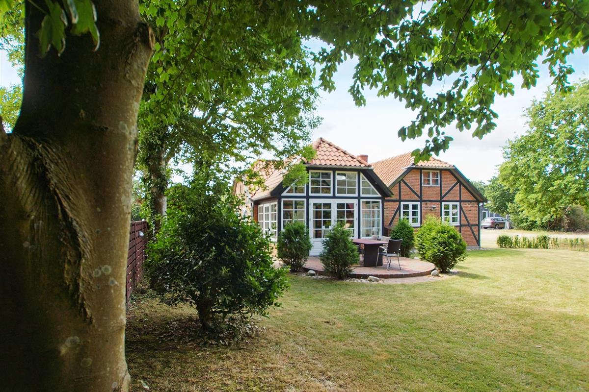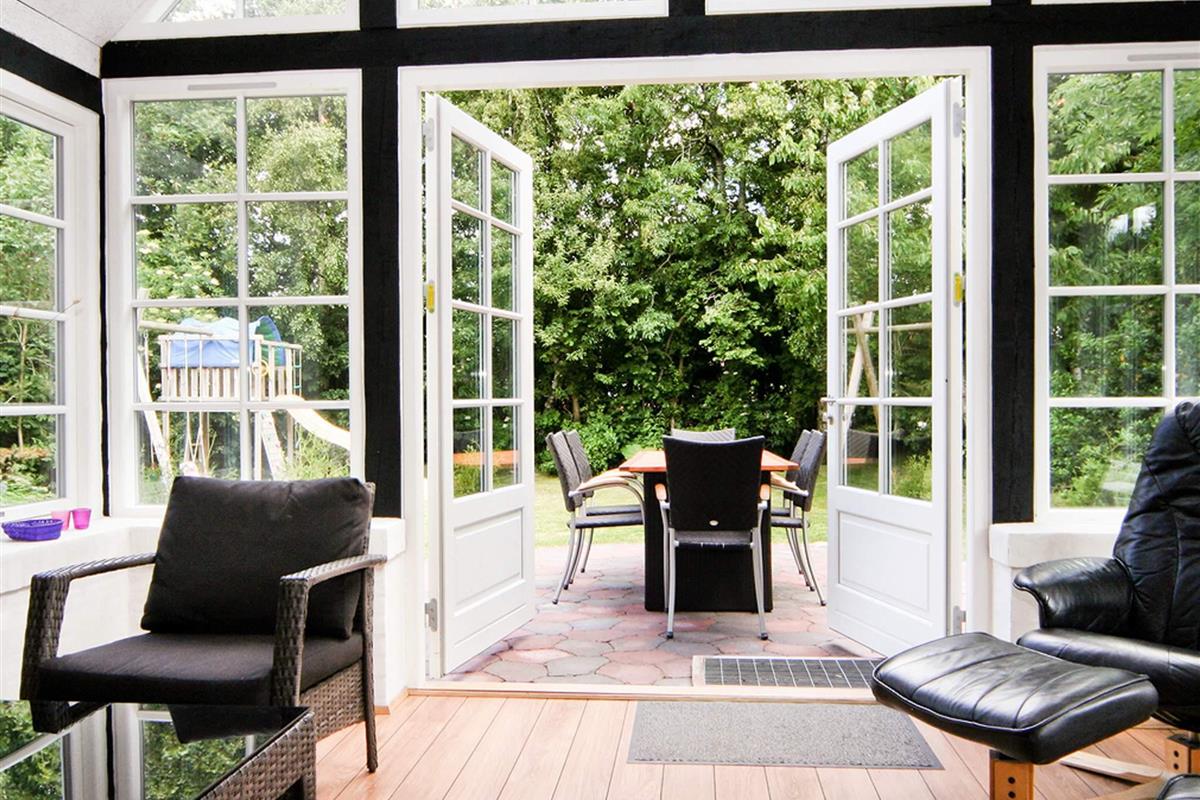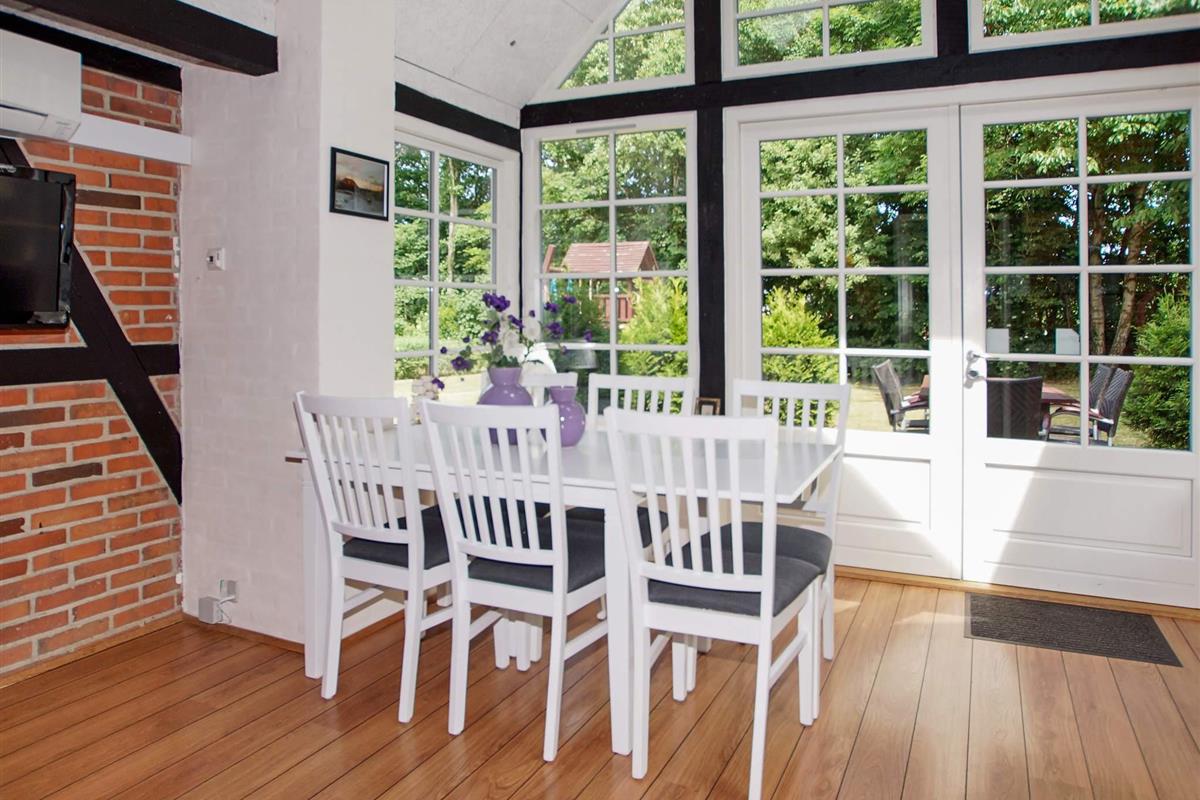 Den Mittelpunkt des Hauses bietet die verglaste Veranda, die bei Wind und Wetter einen herrlich geschützten Aufenthaltsort mit Blick in die Natur bietet. Eine klimafreundliche Wärmepumpe sorgt hier zu jeder Jahreszweit für ein angenehmes Innenklima.