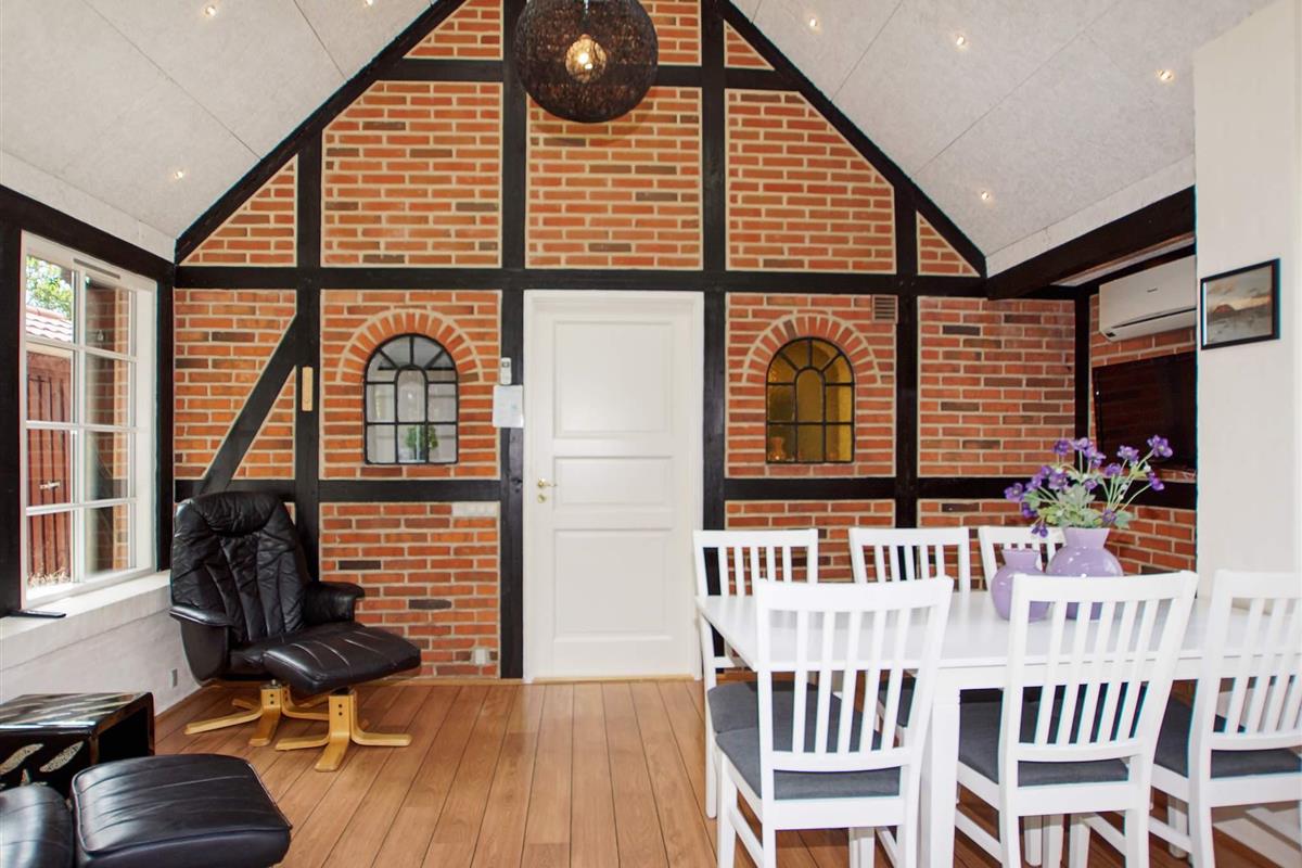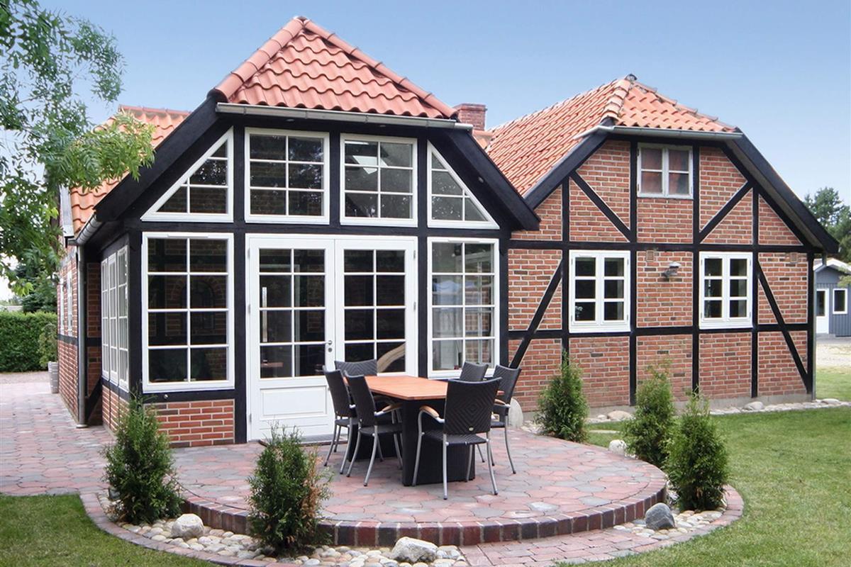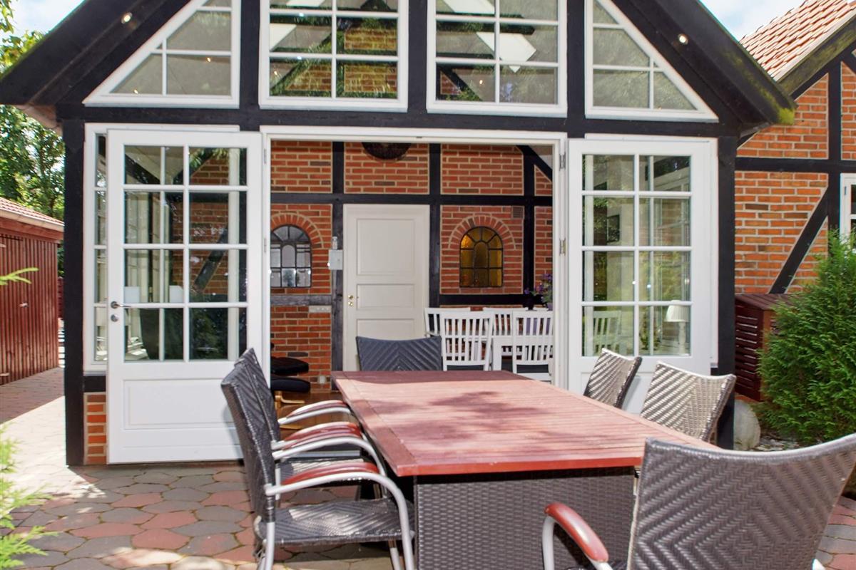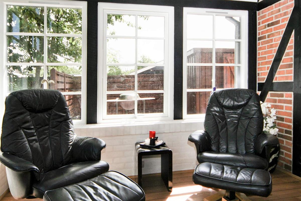 Den Mittelpunkt des Hauses bietet die verglaste Veranda, die bei Wind und Wetter einen herrlich geschützten Aufenthaltsort mit Blick in die Natur bietet. Eine klimafreundliche Wärmepumpe sorgt hier zu jeder Jahreszweit für ein angenehmes Innenklima.