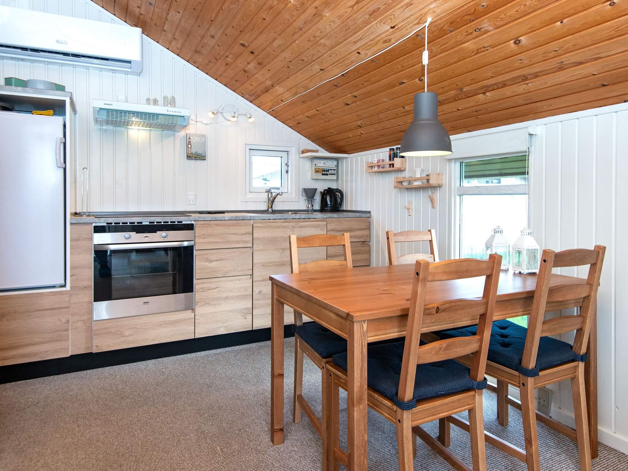 Der Innenbereich umfasst ein Schlafzimmer mit Doppelbett und ein kleineres Zimmer mit Etagenbett für Kinder. Der offene Küchen- und Wohnbereich ist hell und praktisch und bietet alles, was Sie für gemütliche Mahlzeiten und gemeinsame Abende benötigen. Von hier aus gelangen Sie direkt auf die 25 m² große Holzterrasse, die den ganzen Tag über ideal gelegen ist und viel Sonne bietet. Die Terrasse ist ein wunderbarer Ort, um im Freien zu speisen oder einfach an der frischen Luft zu entspannen. Der Garten ist komplett eingezäunt, sodass Sie auch mit Hund unbesorgt reisen können.