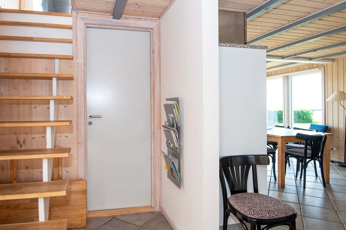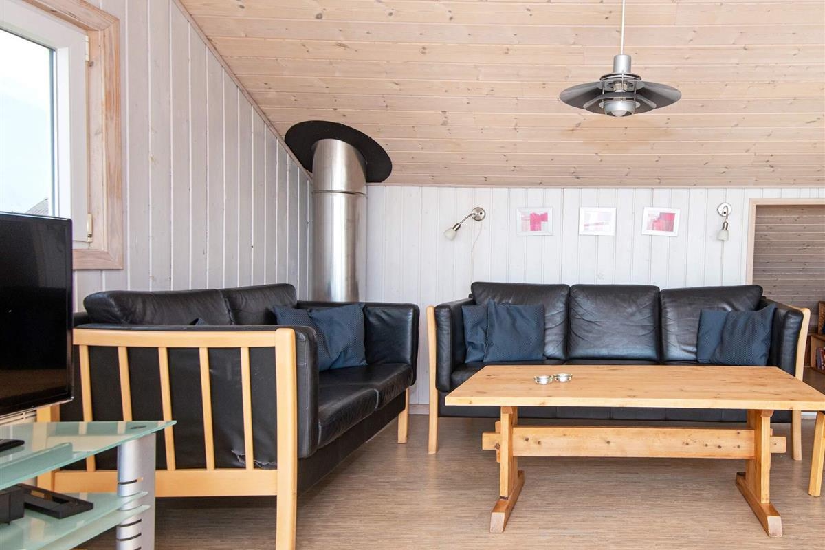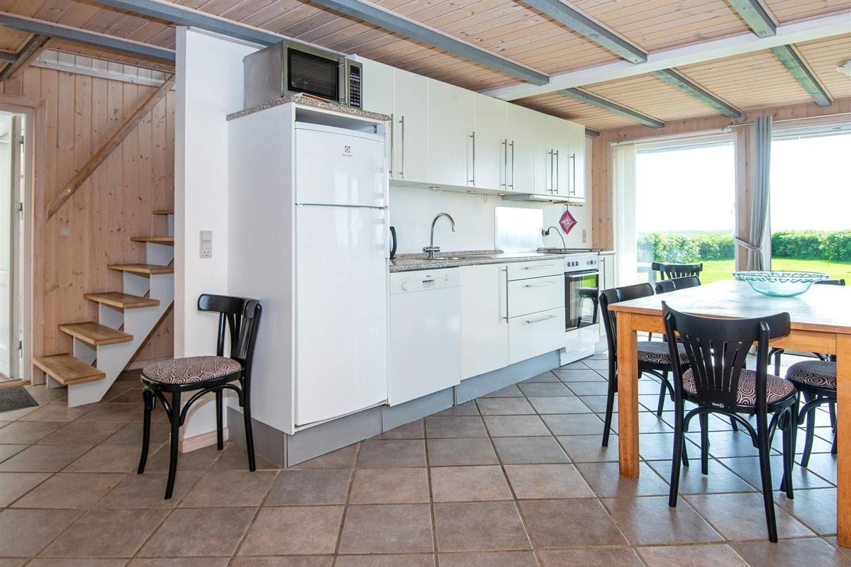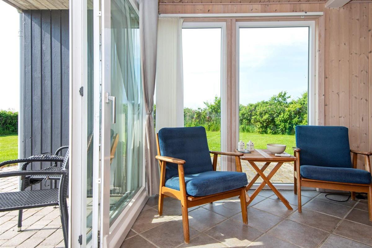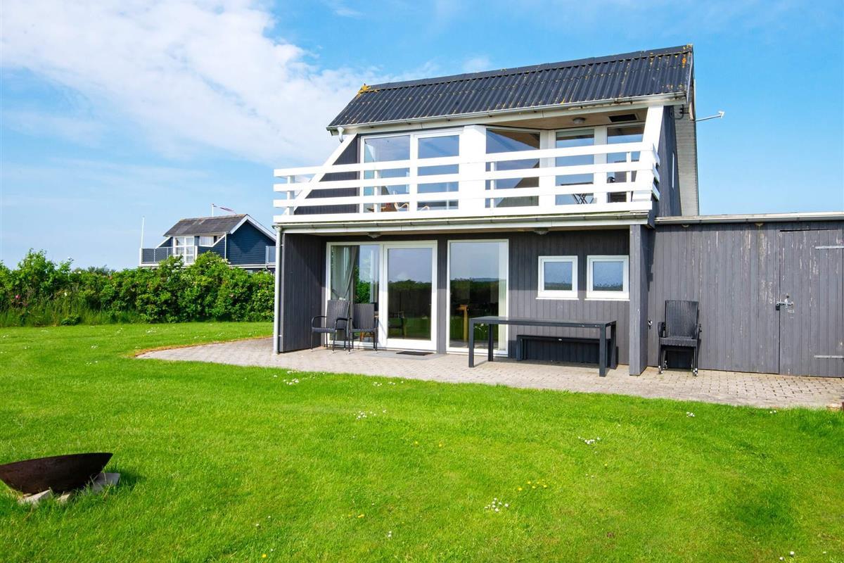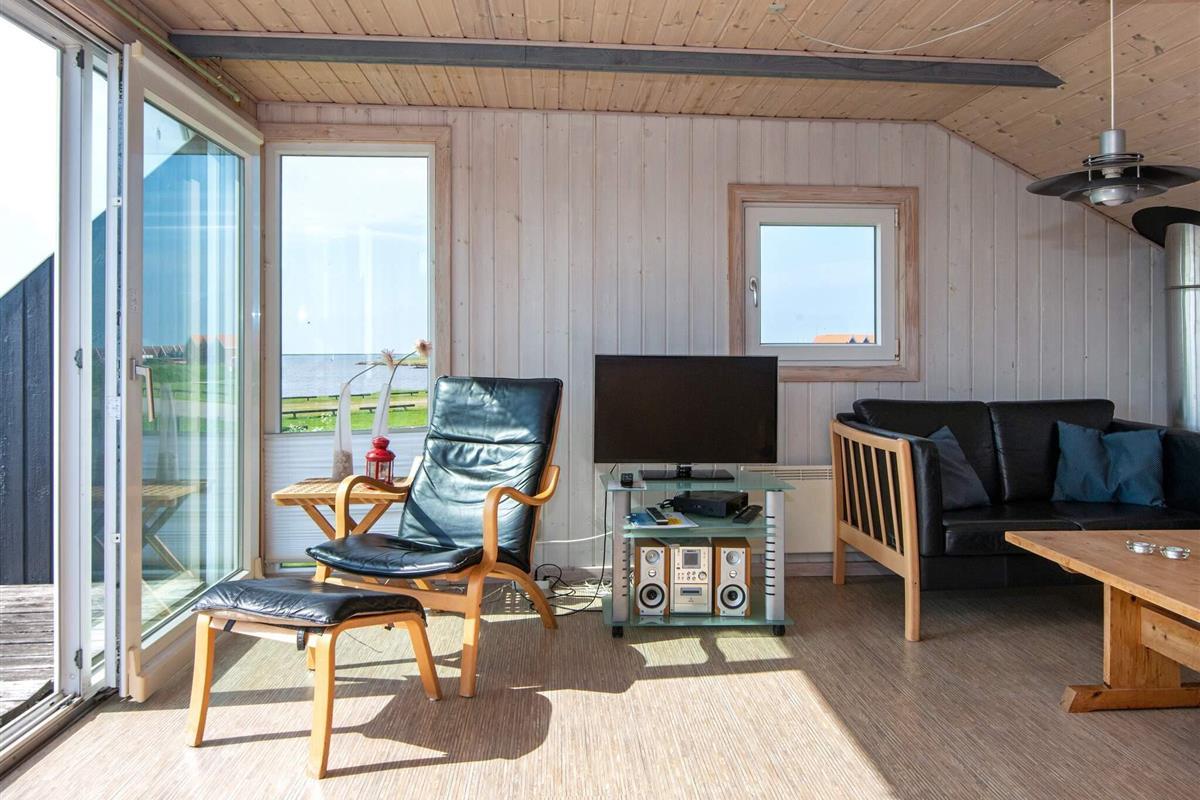 Vom WZ auf der 1. Etage hat man eine fantastische Aussicht über den Fjord und es sind außerdem zwei Alkoven vorhanden, in denen Sie sich nach einem spannendem Tag ausruhen können. Von dort aus gelangen Sie durch eine Schiebetür zu dem 14 m² großen, teilweise überdachten Balkon, wo Sie beim Abendessen den wunderschönen Sonnenuntergang genießen können. Abends können Sie in nördlicher Richtung den Lyngvig Leuchtturm blinken sehen.
