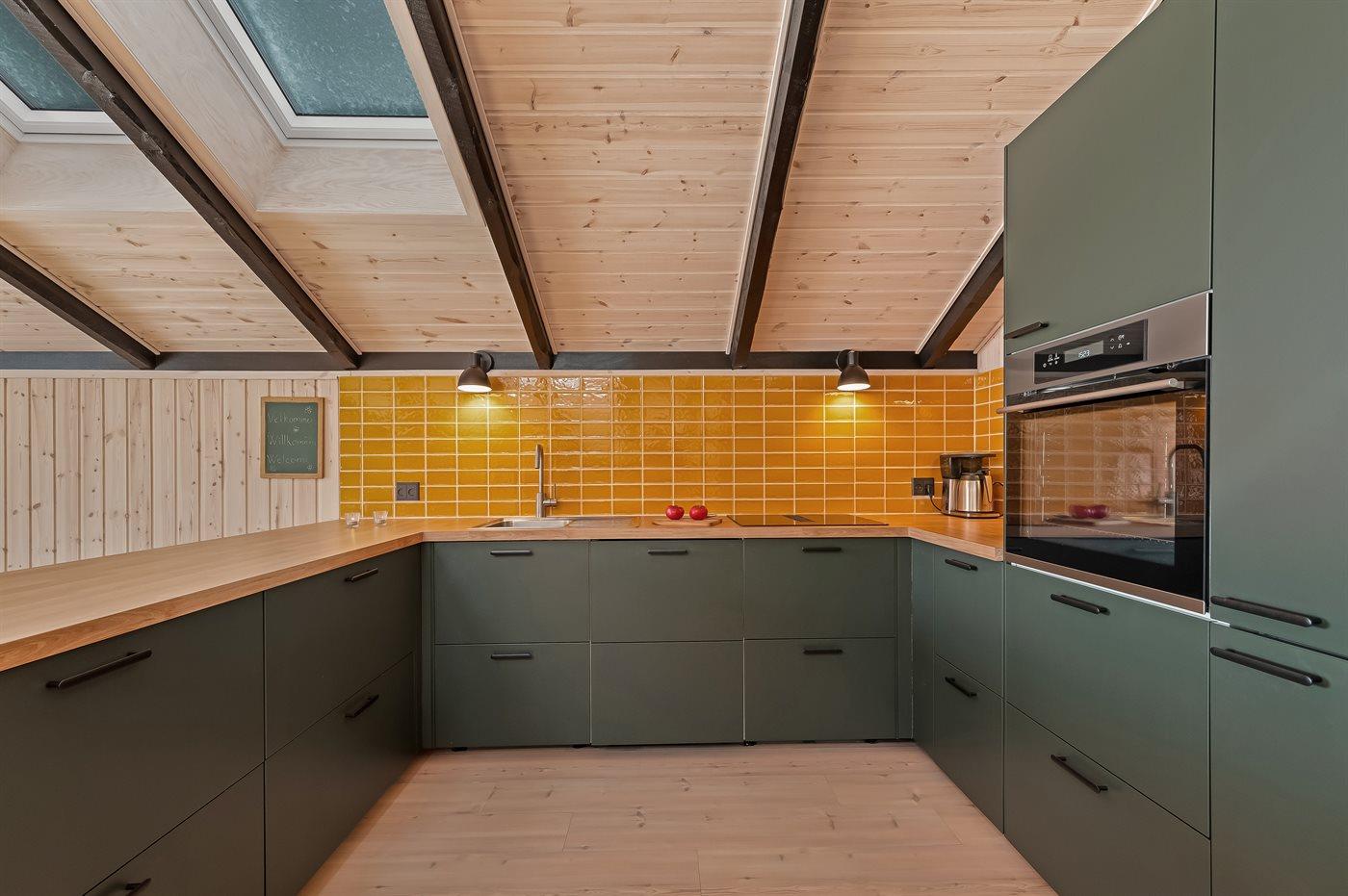 De keuken is uitgerust met koelkast. Er is 4 inductiekookplaten met ingebouwde afzuigkap (start automatisch), heteluchtoven, magnetron en vaatwasser.