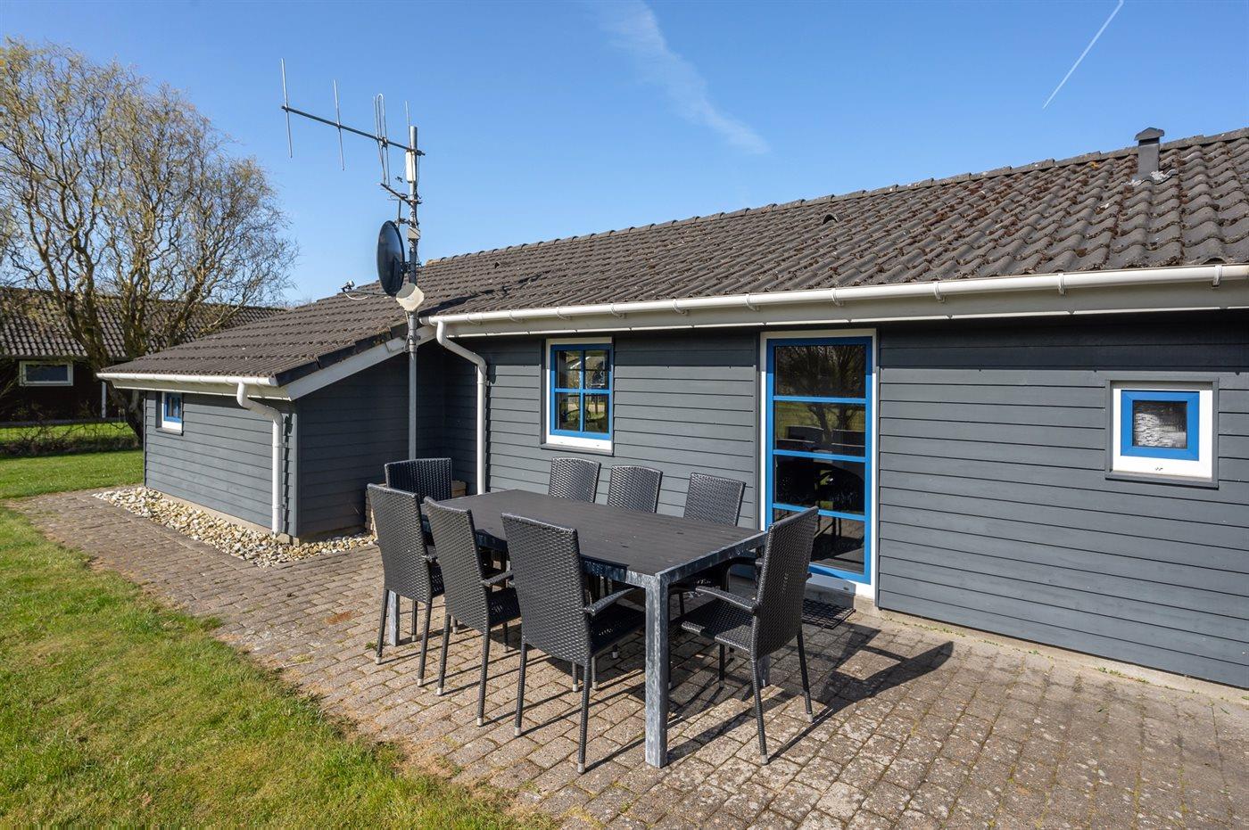 De vakantiewoning is gelegen op een 1000 m² groot natuural grond. De grond is omheind. Afstand tot de zee 7000 m. Afstand tot de fjord 560 m. Dichtstbijzijnde winkel 700 m. Bij de vakantiewoning hoort 40 m² terras. Daarnaast is er een 12 m² groot overdekt terras. Gereedschapsruimte. Schommel. Zandbak. Parkeerplaats bij het huis.