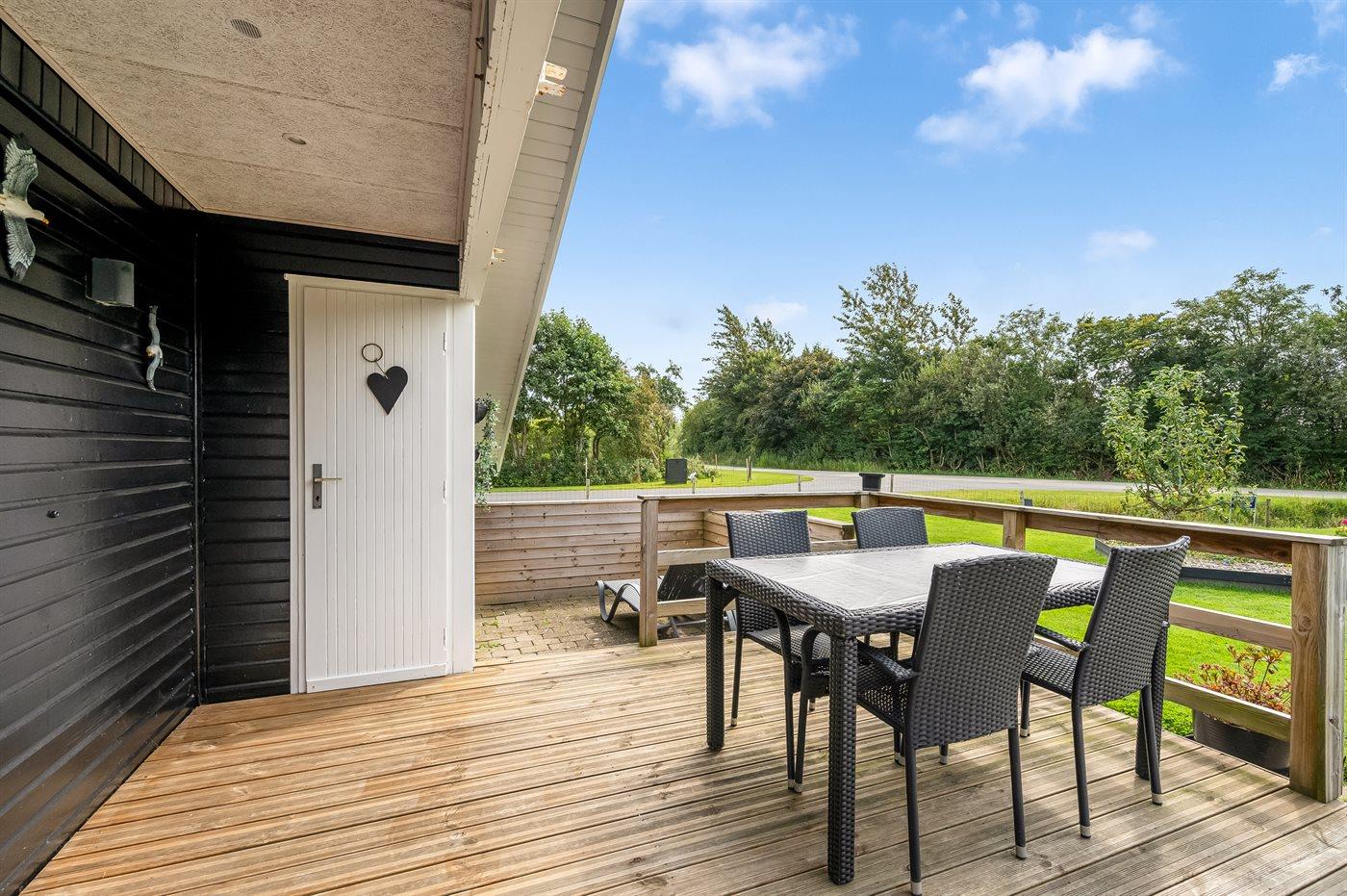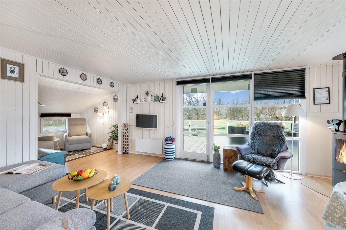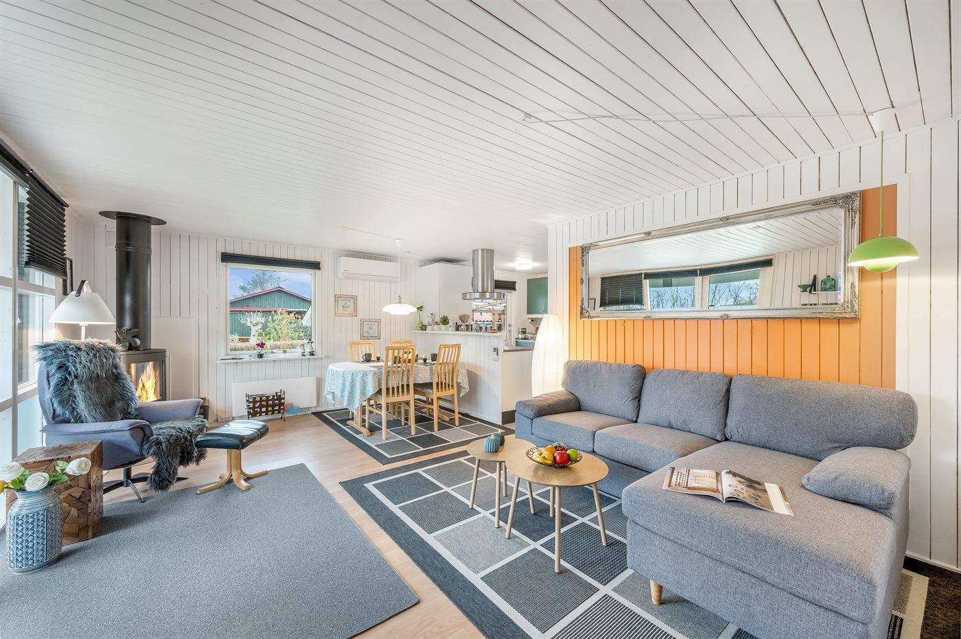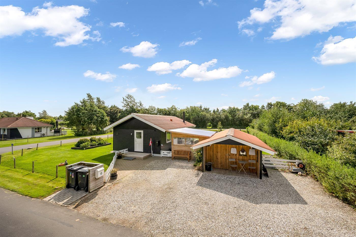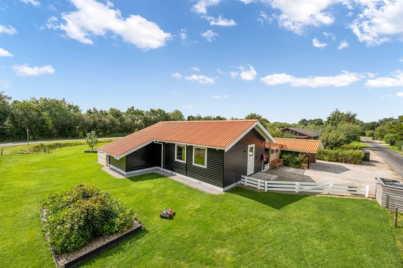 De vakantiewoning is gelegen op een 987 m² groot natuural grond. De grond is omheind. Afstand tot de zee 7200 m. Afstand tot de fjord 600 m. Er is een zwemsteiger in de buurt. Dichtstbijzijnde winkel 800 m. Bij de vakantiewoning hoort 26 m² terras. Daarnaast is er een 7 m² groot overdekt terras. Gereedschapsruimte. Afstand tot speelplaats 400 m.Vuurplaats. Barbecue. Het huis heeft een stopcontact voor het opladen van een elektrische auto. Parkeerplaats bij het huis.