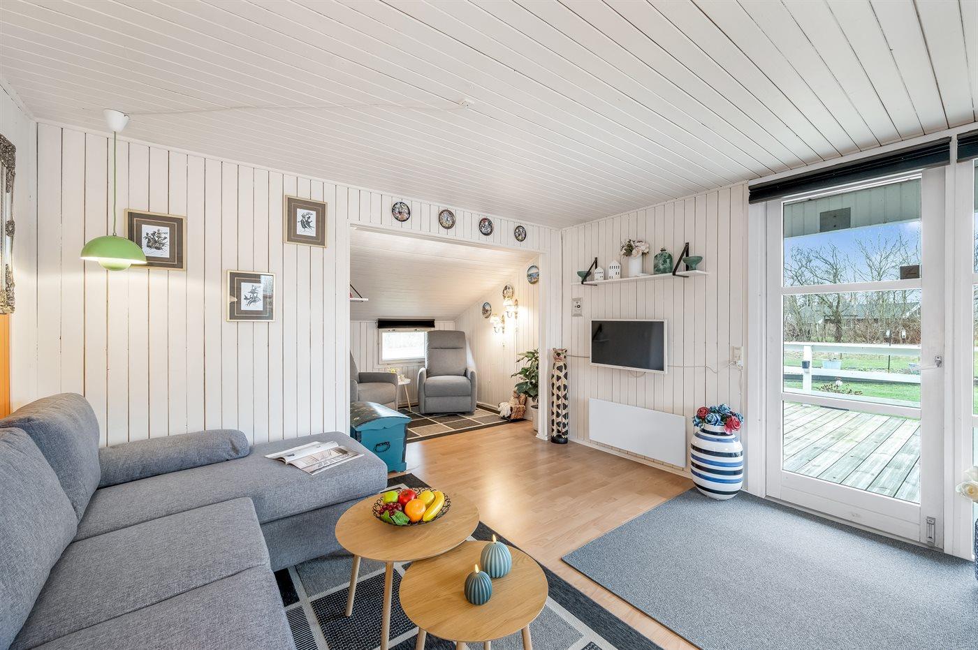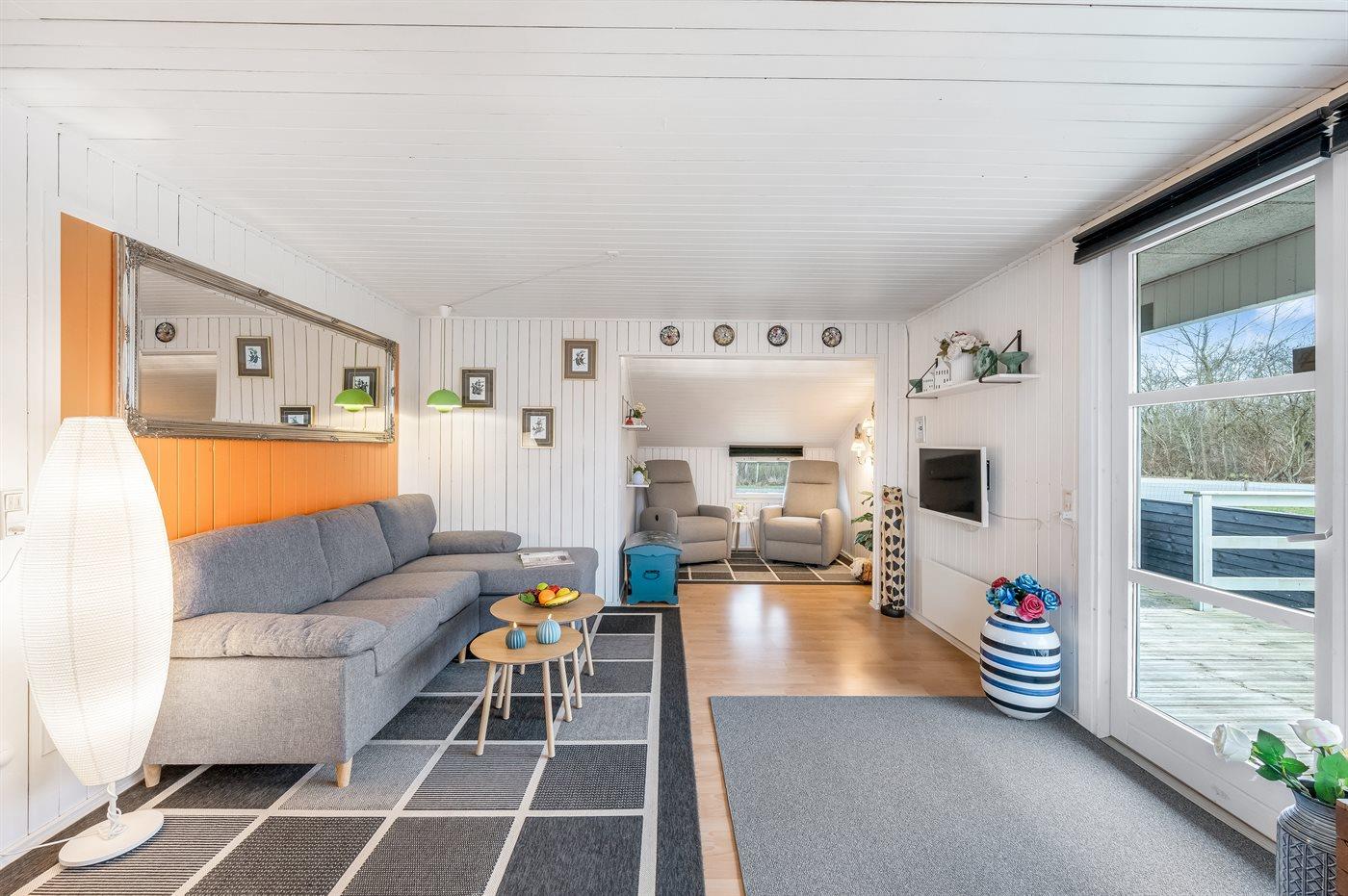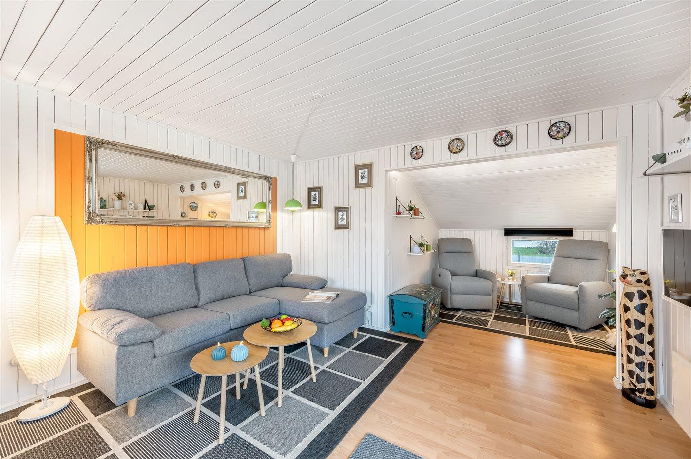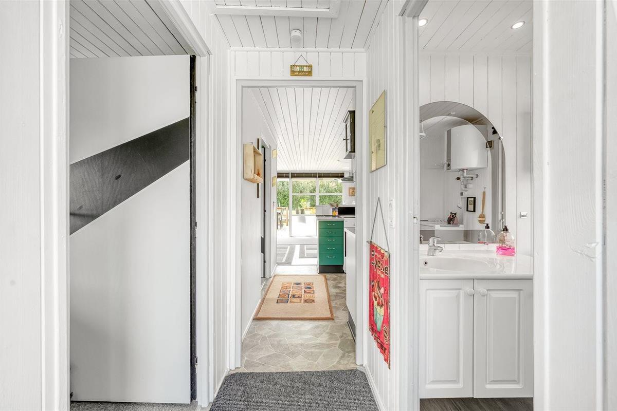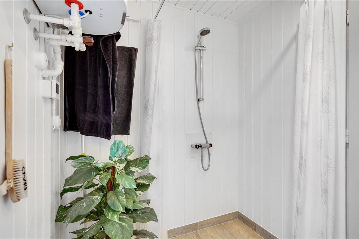 De vakantiewoning is gelegen op een 987 m² groot natuural grond. De grond is omheind. Afstand tot de zee 7200 m. Afstand tot de fjord 600 m. Er is een zwemsteiger in de buurt. Dichtstbijzijnde winkel 800 m. Bij de vakantiewoning hoort 26 m² terras. Daarnaast is er een 7 m² groot overdekt terras. Gereedschapsruimte. Afstand tot speelplaats 400 m.Vuurplaats. Barbecue. Het huis heeft een stopcontact voor het opladen van een elektrische auto. Parkeerplaats bij het huis.